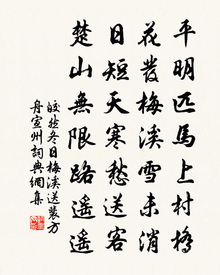 詩詞名句歷史字典書法欣賞書法字典國語詞典說文解字康熙字典古漢語字典標 題 作 者 詩 句 冬日梅溪送裴方舟宣州作者:皎然 朝代:唐代冬日梅溪送裴方舟宣州原文平明匹馬上村橋,花發梅溪雪未消。日短天寒愁送客,楚山無限路遙遙。詩詞問答問:冬日梅溪送裴方舟宣州的作者是誰?答:皎然問:冬日梅溪送裴方舟宣州寫於哪個朝代?答:唐代問:冬日梅溪送裴方舟宣州是什麼體裁?答:七絕皎然冬日梅溪送裴方舟宣州書法欣賞冬日梅溪送裴方舟宣州書法作品注釋全唐詩:卷818-65詩詞推薦西江月 間步州南古堤王惲〔元代〕返照斜明雙塔,亂山回遠孤城。年來風物似昇平。人說三王善政。世事正宜靜待,田園好去躬耕。雲閒歸鳥有遺聲山居冬日釋文珦〔宋代〕懶隨冬日柳,獨許歲寒松。無復芳菲意,深棲雲外峰。病身寒易縮,老衲澀難疑。卻喜同懷者,時來問隱蹤。和慧知微雪韻釋慧空〔宋代〕覆蓋乾坤似有功,洞然明白卻無蹤。其如未識無蹤意。屑玉霏霏落眼中。鶯羅鄴〔唐代〕暖辭雲谷背殘陽,飛下東風翅漸長。卻笑金籠是羈絆,豈知瑤草正芬芳。曉逢溪雨投紅樹,晚囀宮樓泣舊妝。何事和仁仲至荊門胡寅〔宋代〕虞帝當年辟四門,三苗那更蠢 * 。茫茫舊楚祗芳草,處處朱樓空斷垣。不原耦耕招素隱,要看良耜接深村。韓公古絕句佚名〔兩漢〕菟絲從長風,根莖無斷絕。無情尚不離,有情安可別?郊廟歌辭。享太廟樂章。光大舞佚名〔唐代〕大業龍祉,徽音駿尊。潛居皇德,赫嗣天昆。展儀宗祖,重誠孝孫。春秋無極,享奏存存。送秋谷蘭上人釋行海〔宋代〕春來我亦夢家林,萬水千山不可尋。白雪易侵游於鬢,黃金難買故人心。夜船搖月平河穩,曉嶺登雲古樹深。湖上湖州歌九十八首 其七十三汪元量〔宋代〕第四排筵在廣寒,葡萄酒釀色如丹。並刀細割天雞肉,宴罷歸來月滿鞍。四月二十二日拜第二請御正殿孔武仲〔宋代〕驟雨鳴宮瓦,新槐密禁城。鴛行趨曉肅,雞唱入雲清。日晃千袍影,風傳萬歲聲。天心求允協,飛奏入承明。關參議劉仲洪就京制置辟入蜀二首曾豐〔宋代〕江西清絕處,頻賞厭還休。快作坤維去,閒為丙穴游。百牢山倒拔,三峽水橫流。未有人收拾,公其與筆謀。口占洪咨夔〔宋代〕秋風已颯梧猶碧,宿雨才收稗亦花。天著工夫供醉眼,東鄰有酒不堪賒。春雪宋祁〔宋代〕銀礫欺春亂眼來,重陰萬里壓平台。光沈後牖將飛瓦,艷補南枝已落梅。池曲平翻冰共泮,山腰未積玉爭頹。長安京城雜詠歐陽系〔元代〕奉詔修書白玉堂,朝朝騎馬傍宮牆。閘河東畔垂楊柳,時有鶯聲似故鄉。對酒詩庾信〔南北朝〕數杯還已醉。風雲不復知。唯有龍吟笛。桓伊能獨吹。大禮慶成宋庠〔宋代〕帝揆三微歷,郊嚴七里壇。對修清廟饗,來接上神歡,閶闔開金狄,鉤陳扈玉鑾。軒游葩蓋密,漢兆紫營寬。電策送薛重中丞充太原副使無可〔唐代〕中司出華省,副相晉陽行。書答偏州啟,籌參上將營。踏沙夜馬細,吹雨曉笳清。正報胡塵滅,桃花汾水生。破虜凱歌二十四首周麟之〔宋代〕勝負端從曲直分,我軍屢捷氣凌雲。坐聽笳鼓傳新曲,不怕蕃家鐵塔軍。龍潭方丈樓鑰〔宋代〕又因寒食此中來,窗戶虛明絕點埃。山里春風無閒斷,海棠開過地棠開。醉後題壁楊萬里〔宋代〕夜寒星斗掛屋椽,我輩把酒不問天。語聲未怕驚天上,只愁驚起白鷗眠。名句推薦客思吟商還怯。怨歌長、瓊壺暗缺。周密《玉京秋·煙水闊》 臣聞君子樂得其志,小人樂得其事。姜子牙《六韜·文韜·文師》 但從今、記取楚樓風,裴台月。辛棄疾《滿江紅·漢水東流》 好時節,願得年年,常見中秋月。徐有貞《中秋月·中秋月》 松樹千年終是朽,槿花一日自為榮。白居易《放言五首·其五》 新年都未有芳華,二月初驚見草芽。韓愈《春雪》 終南陰嶺秀,積雪浮雲端。祖詠《終南望余雪》 它山之石,可以攻玉。佚名《鶴鳴》 屈指數春來,彈指驚春去。高觀國《卜運算元·泛西湖坐間寅齋同賦》 明歲秋風知再會,暫時分手莫相思。曹雪芹《殘菊》