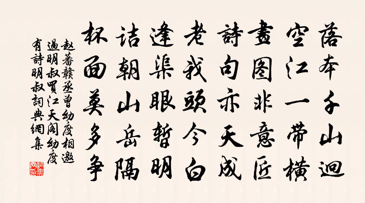 詩詞名句歷史字典書法欣賞書法字典國語詞典說文解字康熙字典古漢語字典標 題 作 者 詩 句 贛丞曾幼度相邀過明叔買江天閣幼度有詩明叔作者:趙蕃 朝代:宋代原文落本千山迥,空江一帶橫。畫圖非意匠,詩句亦天成。老我頭今白,逢渠眼暫明。詰朝山嶽隔,杯麵莫多爭。詩詞問答問:《贛丞曾幼度相邀過明叔買江天閣幼度有詩明叔》的作者是誰?答:趙蕃問:該詩寫於哪個朝代?答:宋代書法欣賞贛丞曾幼度相邀過明叔買江天閣幼度有詩明叔書法作品詩文賞析【原題】:贛丞曾幼度相邀過明叔買江天閣幼度有詩明叔與成父弟皆和之亦次韻詩詞推薦送張郎中赴隴右覲省卿公(時張卿公亦充節度留後)岑參〔唐代〕中郎鳳一毛,世上獨賢豪。弱冠已銀印,出身唯寶刀。還家卿月迥,度隴將星高。幕下多相識,邊書醉懶操。賢者之孝二百四十首孔奮林同〔宋代〕甘同妻菜茹,極奉母珍羞。一任時人笑,脂膏不自謀。離思孟郊〔唐代〕不寐亦不語,片月秋稍舉。孤鴻憶霜群,獨鶴叫雲侶。怨彼浮花心,飄飄無定所。高張系繂帆,遠過梅根渚。回織和劉珵西湖十洲花嶼舒坦〔宋代〕暖吹紅紫上青枝,掠水風煙巧自持。蜂蝶鸕鶿各芳意,錦囊消得探春詩。句司馬光〔宋代〕不肯那錢買珠翠,任教堆插階前菊書江亭壁陳郁〔宋代〕人間風浪最傾危,君自深藏了不知。只恐隨流禹門去,又翻頭角露天池。新秋陸游〔宋代〕秋氣入清笳,旗亭酒可賒。長歌穿小市,短帽插幽花。溪女留新蟹,園公餉晚瓜。誰知閒老子,解作醉生涯?湖州歌九十八首 其二十六汪元量〔宋代〕九出瓊花一夜開,無雙亭曲小徘徊。可憐后土空祠宇,望斷韋郎不見來。武陵春(正月二日,天寒欲雪,孫使君置酒作樂,賓客插花劇飲,明日當立春)毛滂〔宋代〕城上落梅風料峭,寒馥逼清尊。爽興天教屬使君。雪意壓歌雲。插帽殷羅金縷細,燕燕早隨人。留取笙歌直到明。吳門送客早發許渾〔唐代〕吳歌咽深思,楚客怨歸程。寺曉樓台迥,江秋管吹清。早潮低水檻,殘月下山城。惆悵回舟日,湘南春草生。雨中孔武仲〔宋代〕大雨已滂流,小雨仍脈沐。風來掃欲斷,雲送還相續。凝陰壓天宇,蒸潤浸旅服。隴上麥經秋,江南梅已熟。九日奉呈同僚四絕句陳傅良〔宋代〕澤國重陽花較遲,得花雖□□愁余。家家人醉雞豚社,獨對西風憶鱠魚。景定初元即事十首劉克莊〔宋代〕諸老雲台上,人人畫一籌。奈何令退士,長抱杞人憂。和育王十二題石屏風李覯〔宋代〕形模皆自然,樹立豈人力。松影與秋光,掃成真水墨。哭丁千崖教授趙文〔宋代〕一覽樓頭笑拂衣,今朝何意此噓欷。斷無痛飲歌都護,那得重歸見令威。太學廢來同舍盡,清江好在故人非。我來文宣王及其弟子贊宋高宗〔宋代〕遐想子期,挾策聖帷。涉道是嗜,惟士可縻。在德既賢,在名乃垂。洋洋之風,逮今四馳。憶天竺桂張九成〔宋代〕湖上北山天竺寺,滿山桂子月中秋。黃英六出非凡種,肯許天香過別州。賀鄭簿生孫鄭暉老〔宋代〕望及清秋到眼前,建溪溪上現長庚。雲間鸑鷟人見見,天上麒麟地上行。釋氏抱來真傑特,寶公摩後必奇英。傳家定風波王吉昌〔元代〕悟結清涼浩劫因。生涯淡薄出囂塵。物物般般心上離,思純。克勤虛谷養元神。接物和光循德柄,無方應變任天真王大卿輓詞三首釋寶曇〔宋代〕出處誠吾事,園林正及時。乾坤身老大,兄弟日追隨。生死真譚笑,過逢類別離。小樓今夜月,照我淚雙垂。名句推薦而浮生若夢,為歡幾何?李白《春夜宴桃李園序 / 春夜宴從弟桃花園序》 性孤高似柏,阿嬌金屋。陸容《滿江紅·詠竹》 一月不讀書,耳目失精爽。蕭掄謂《讀書有所見作》 記得武陵相見日,六年往事堪驚周紫芝《臨江仙·送光州曾使君》 疾雷不及塞耳,疾霆不暇掩目。劉安及其門客《淮南子·兵略訓》 黃雲連白草,萬里有無間。王鎡《塞上曲》 牆外行人,牆裡佳人笑。蘇軾《蝶戀花·春景》 救寒莫如重裘,止謗莫如自修。司馬光《資治通鑑·魏紀五》 桂魄初生秋露微,輕羅已薄未更衣。王維《秋夜曲》 聞之而不見,雖博必謬;見之而不知,雖識必妄;知之而不行,雖敦必困。荀子《荀子·儒效》