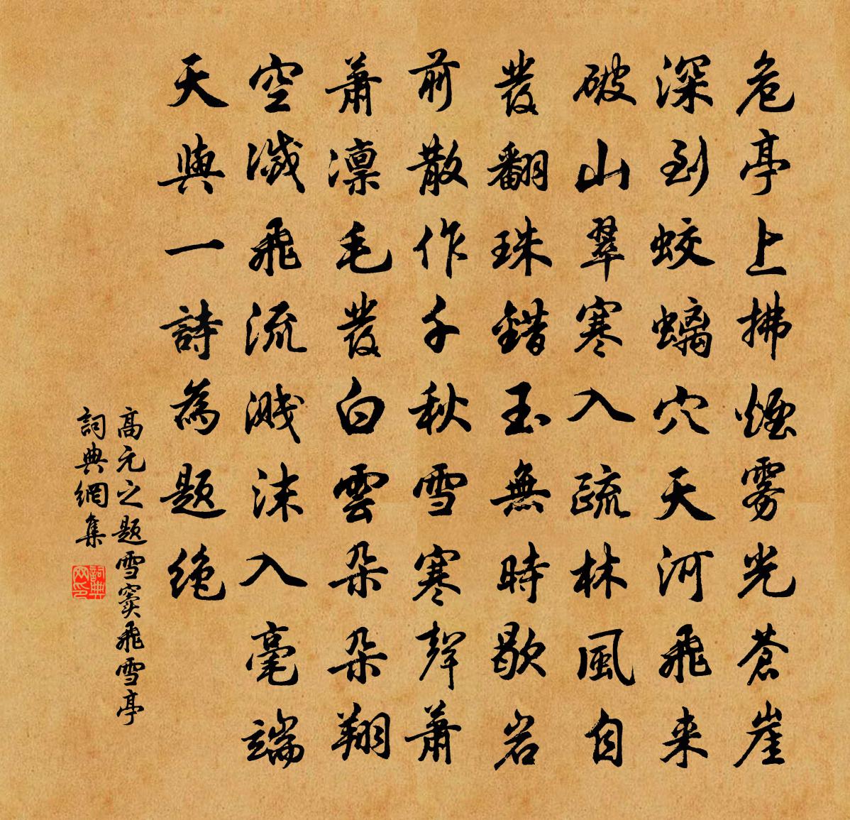 詩詞名句歷史字典書法欣賞書法字典國語詞典說文解字康熙字典古漢語字典標 題 作 者 詩 句 題雪竇飛雪亭作者:高元之 朝代:宋代題雪竇飛雪亭原文危亭上拂煙霧光,蒼崖深到蛟螭穴。天河飛來破山翠,寒入疏林風自發。翻珠錯玉無時歇,岩前散作千秋雪。寒聲蕭蕭凜毛髮,白雲朵朵翔空滅。飛流濺沫入毫端,天與一詩為題絕。詩詞問答問:題雪竇飛雪亭的作者是誰?答:高元之問:題雪竇飛雪亭寫於哪個朝代?答:宋代高元之題雪竇飛雪亭書法欣賞題雪竇飛雪亭書法作品詩詞推薦旅館秋夕李中〔唐代〕寥寥山館裡,獨坐酒初醒。舊業多年別,秋霖一夜聽。砌蛩聲漸息,窗燭影猶停。早晚無他事,休如泛水萍。送袁秀才下第歸毗陵歐陽詹〔唐代〕羸馬出都門,修途指江東。關河昨夜雨,草木非春風。矢舍雖未中,璞全終待攻。層霄秋可翔,豈不隨高鴻。耘老弟五月十三日親往新亭種竹喜而賦詩虞儔〔宋代〕移竹應須竹醉時,不妨帶筍一時移。清陰且障東西日,碧色還分上下池。歲晚雪霜成超級大國伴,夜涼風月得新知與史郎中欽聽黃鶴樓上吹笛 / 黃鶴樓聞笛李白〔唐代〕一為遷客去長沙,西望長安不見家。黃鶴樓中吹玉笛,江城五月落梅花。閨怨許必勝〔宋代〕房櫳微雨過,蟲思草根深。門外青苔色,無人閒到今。換衫依暮冷,開鏡倚秋心。別意猶能在,應來夢裹尋。彩花張耒〔宋代〕清寒帶雪未成春,可得芳菲早向人。須遣艷陽歸掌握,故教桃李及芳辰。瓊花畫軸孔武仲〔宋代〕我欲游廣陵,江湖浩難涉。喜有瓊花枝,相隨在巾篋。北人初不識,謂是玉蝴蝶。天妃絕世艷,乃以方妓妾。古祠壽李雁湖吳泳〔宋代〕往往黃樞府,璇題護兩扉。剪除當路棘,紉補坐朝衣。風急操舟濟,江空擲釣歸。年年湖上雁,旭旦望南飛。華亭百詠東庵異跡許尚〔宋代〕地勝風雷吼,人疑涌海潮。將軍英爽在,何物敢興妖。摸魚兒(蓴)王沂孫〔宋代〕玉簾寒、翠痕微斷,浮空清影零碎。碧芽也抱春洲怨,雙卷小緘芳字。還又似。系羅帶相思,幾點青鈿綴。吳中舊石曼卿三佛名大字張耒〔宋代〕石公神仙狂,脫落隱詩酒。余情到翰墨,落筆聞宇宙。崢嶸龜山殿,風雨梁棟舊。煌煌三佛榜,鐵柱貫金紐。開張題秋江待渡圖錢選〔宋代〕山色空濛翠欲流,長江清澈一天秋。茅茨落日寒煙外,久立行人待渡舟。余居御橋南夜聞妖鳥鳴效昌黍體梅堯臣〔宋代〕都城夜半陰雲黑,忽聞轉轂聲咿呦。嘗憶楚鄉有妖鳥,一身九首如贅疣。或時月暗過閭里,緩音低語若有求。小兒西亭送蔣侍御還京(得來字)岑參〔唐代〕忽聞驄馬至,喜見故人來。欲語多時別,先愁計日回。山河宜晚眺,雲霧待君開。為報烏台客,須憐白髮催。游九鎖山龍洞林景熙〔宋代〕雲濕林腥隱右扉,不知何代有龍歸。卻疑此洞地無底,下挾滄溟作雨飛。莫春趙雍〔元代〕綠陰庭院碧窗紗,半卷珠簾映晚霞。芳草萋萋春寂寂,東風吹墮落殘花。句高似孫〔宋代〕魚帶淞江月盈缶,雋處依稀開蟹斗。擬寒山拾得二十首王安石〔宋代〕失志難作福,得勢易造罪。苦即念快樂,樂即生貪愛。無苦亦無樂,無明亦無昧。不屬三界中,亦非三界外。馬上見梅花初發宋庠〔宋代〕瞥見江南樹,繁英照苑牆。無雙春外色,第一臘前香。雲葉遙驚目,瓊枝昔斷腸。莫吹羌塢笛,容易損孤芳。登樂遊原杜牧〔唐代〕長空澹澹孤鳥沒,萬古銷沉向此中。看取漢家何事業,五陵無樹起秋風名句推薦長安一片月,萬戶搗衣聲。李白《子夜吳歌·秋歌》 田園寥落干戈後,骨肉流離道路中。白居易《望月有感》 花開紅樹亂鶯啼,草長平湖白鷺飛。徐元傑《湖上》 年年越溪女,相憶采芙蓉。杜荀鶴《 * 怨》 似此星辰非昨夜,為誰風露立中宵。黃景仁《綺懷》 鹿車何日駕,歸去潁東田。歐陽修《秋懷》 念天地之悠悠,獨愴然而涕下。陳子昂《登幽州台歌》 故人溪上,掛愁無奈,煙梢月樹。史達祖《留春令·詠梅花》 日啖荔枝三百顆,不辭長作嶺南人。蘇軾《惠州一絕》 朝為越溪女,暮作吳宮妃。王維《西施詠》