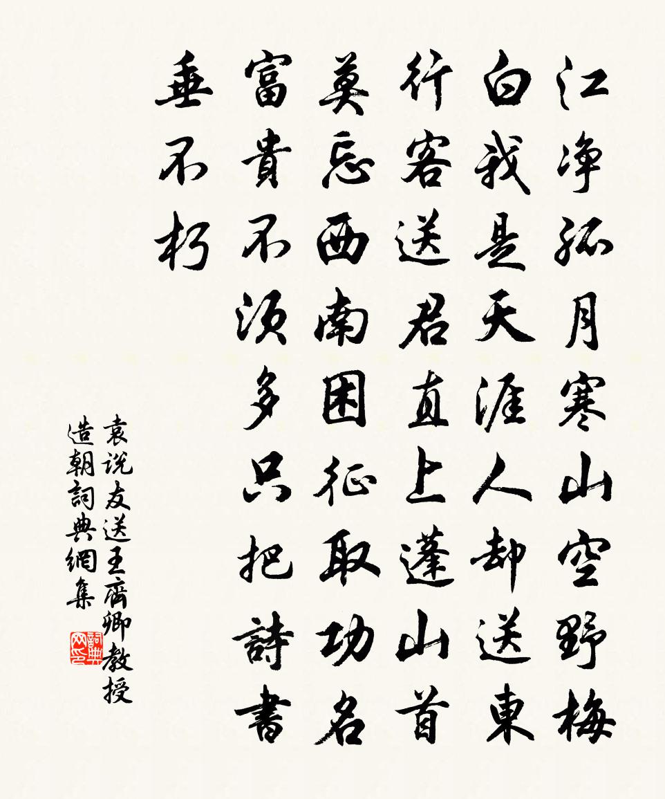 詩詞名句歷史字典書法欣賞書法字典國語詞典說文解字康熙字典古漢語字典標 題 作 者 詩 句 送王齊卿教授造朝作者:袁說友 朝代:宋代送王齊卿教授造朝原文江淨孤月寒,山空野梅白。我是天涯人,卻送東行客。送君直上蓬山首,莫忘西南困征取。功名富貴不須多,只把詩書垂不朽。詩詞問答問:送王齊卿教授造朝的作者是誰?答:袁說友問:送王齊卿教授造朝寫於哪個朝代?答:宋代袁說友送王齊卿教授造朝書法欣賞送王齊卿教授造朝書法作品詩詞推薦許遠徐鈞〔宋代〕自度才卑樂尚賢,輸忠直欲保城全。如公豈是偷生者,一死何庸較後先。桐柏崇道觀楊愈〔宋代〕深入黃庭景,徙思五滴泉。青牛眠藥塢,白鹿臥芝田。浮世人空老,長生事宛然。三屍飛不去,皆是自留連。題淳于髡墓劉禹錫〔唐代〕生為齊贅婿,死作楚先賢。應以客卿葬,故臨官道邊。寓言本多興,放意能合權。我有一石酒,置君墳樹前。送昱師赴請姑蘇林逋〔宋代〕同功闔閭人,衣囊覆氎巾。新煙赤岩暝,融雪太湖春。鍾遠移齋候,香遲上定身。當知舉如意,寶地雨花頻。雞籠鎮陳師道〔宋代〕河市新經集,雞籠舊得名。初聞北人語,意作故鄉聲。客久艱難極,情忘去就輕。空虛仍廢忘,何以慰諸生。聽郢客歌陽春白雪歐陽袞〔唐代〕寂聽郢中人,高歌已絕倫。臨風飄白雪,向日奏陽春。調雅偏盈耳,聲長杳入神。連連貫珠並,裊裊遏雲頻。度曲寓嘆陸游〔宋代〕小隱終非隱,休官尚是官。早知農圃樂,不見道途難。故國雞豚社,貧家菽水歡。至今清夜夢,猶覺畏濤瀾。漫興鄭樵〔宋代〕野鳥日啼戶外,涼風時入簾間。老夫夢後欹枕,稚子病中解顏。永遇樂 此下原有滿江紅昨夜嫦娥一首未注名佚名〔宋代〕行也無憂,坐也無悶,長安長樂。息息綿綿,朝朝暮暮,保養神珠一顆。閒是閒非,莫*莫采,大忌競爭人我。滅水調歌頭(席上為葉仲洽賦)辛棄疾〔宋代〕高馬勿捶面,千里事難量。長魚變化雲雨,無使寸鱗傷。一壑一丘吾事,一斗一石皆醉,風月幾千場。須作蝟毛磔寒食後一日作和林秀才蘇頌〔宋代〕寒食初過一百五,陌上風輕斂微雨。宮花鋪繡淺深紅,蜀柳垂絲千萬縷。都人士女趁時節,郡圃山樊樂樽俎。肯教記夢釋文珦〔宋代〕神清發幽夢,夢到仙人峰。老仙啟玄門,問我來何從。仙發映山綠,仙顏眩日紅。高低種玉田,異植方茸茸。里閭贈星翁舒岳祥〔宋代〕星翁言我壽,更壽復何求。老病花生眼,愁吟雪滿頭。髀消經萬險,面皺積千憂。十載不看鏡,今朝見自羞。落花怨十首劉克莊〔宋代〕謝女吟邊絮,英台去日衣。不應零落盡,惟見蝶兒飛。至洪澤楊萬里〔宋代〕今宵合過山陽驛,泊船問來是洪澤。都梁到此只一程,卻費一霄兼兩日。政緣夜來到瀆頭,打頭風起浪不休。舟人福勝閣范成大〔宋代〕翬飛五級半空翔,指點樓欄說太皇。劫火不能侵願力,巋然獨似漢靈光。次韻方蒙仲高人亭方岳〔宋代〕終南有捷徑,澗恧而林羞。其人豈其山,寧勿相累不。偈頌一百零九首釋可湘〔宋代〕仰天灣下,喝石嶺頭。昔年落賺,覆水難收。當堂稱父子,背面是冤仇。影也不願再見,豈料界隨相逐同到福州。三齒墮歌陸游〔宋代〕一葉落知天下秋,三齒墮矣吾生休!詩人未脫紈褲態,尚樂華屋悲山丘。蓼花荻葉可以解我憂,鸕鶿白鷺可以從我念奴嬌姜特立〔宋代〕宦途巇險,問急流勇退,幾人聞早。自別修門今正是,一紀生朝還到。綠野風光,平泉草木,爭似梅山好。園林如名句推薦風緊雁行高,無邊落木蕭蕭。納蘭性德《河瀆神·風緊雁行高》 試問鄉關何處是,水雲浩蕩迷南北。趙鼎《滿江紅·丁未九月南渡泊舟儀真江口作》 雲橫秦嶺家何在?雪擁藍關馬不前。韓愈《左遷至藍關示侄孫湘》 一溪煙柳萬絲垂,無因系得蘭舟住。周紫芝《踏莎行·情似遊絲》 過橋分野色,移石動雲根。賈島《題李凝幽居》 竹竿有甘苦,我愛抱苦節。孟郊《苦寒吟》 一番荷芰生池沼,檻前風送馨香。尹鶚《臨江仙·一番荷芰生池沼》 興,百姓苦;亡,百姓苦!張養浩《山坡羊·潼關懷古》 碧雲無渡碧天沉,是湖心,是儂心。張惠言《江城子·填張春溪西湖竹枝詞》 月兒彎彎照九州,幾家歡樂幾家愁。佚名《月兒彎彎照九州》