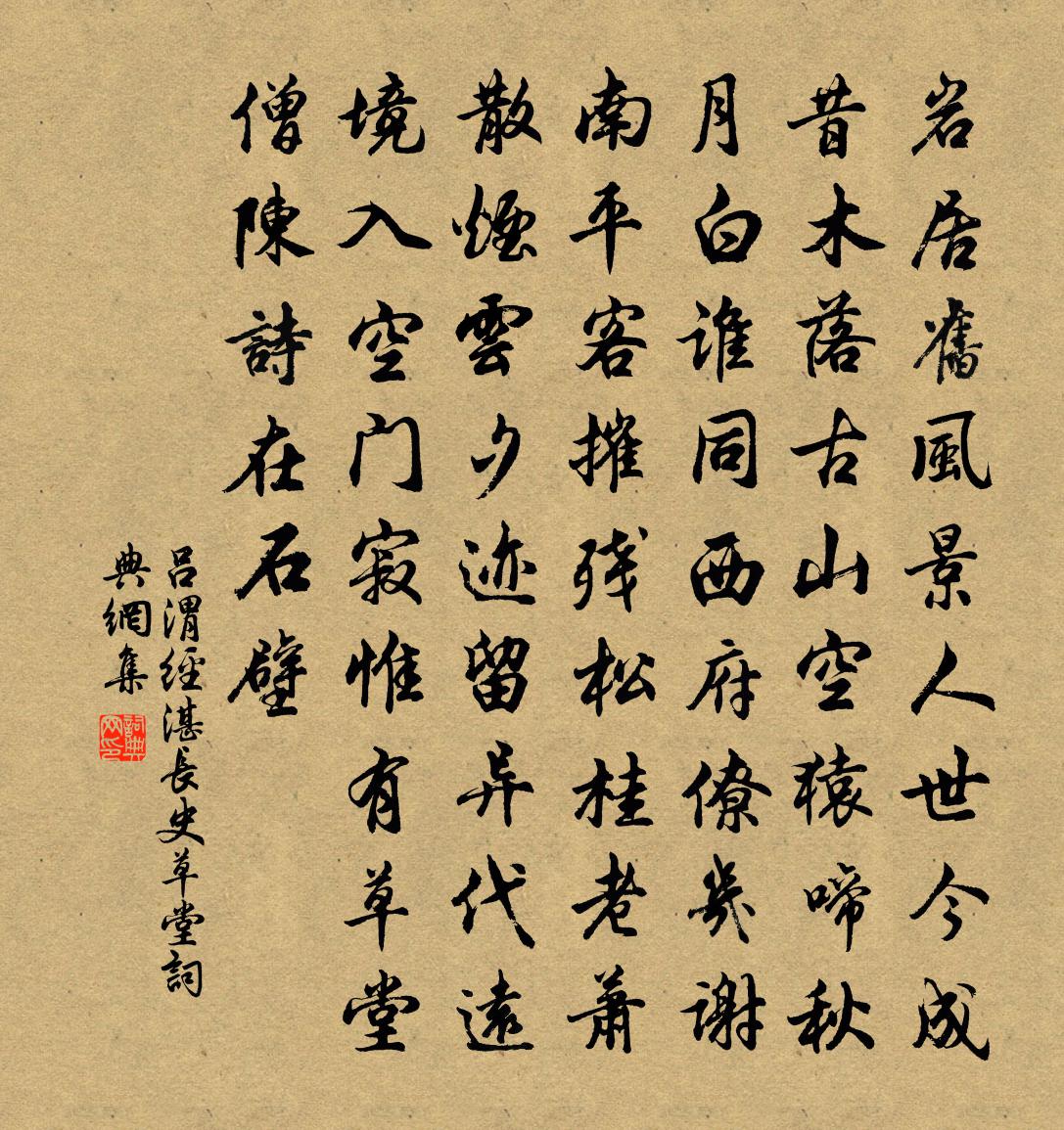 詩詞名句歷史字典書法欣賞書法字典國語詞典說文解字康熙字典古漢語字典標 題 作 者 詩 句 經湛長史草堂作者:呂渭 朝代:唐代經湛長史草堂原文岩居舊風景,人世今成昔。木落古山空,猿啼秋月白。誰同西府僚,幾謝南平客。摧殘松桂老,蕭散煙雲夕。跡留異代遠,境入空門寂。惟有草堂僧,陳詩在石壁。詩詞問答問:經湛長史草堂的作者是誰?答:呂渭問:經湛長史草堂寫於哪個朝代?答:唐代問:經湛長史草堂是什麼體裁?答:五古呂渭經湛長史草堂書法欣賞經湛長史草堂書法作品注釋全唐詩:卷307-34詩詞推薦曹娥廟潘牥〔宋代〕一川經漲夕陽波,幼婦碑殘鎖綠蘿。不止但爭三十里,曹瞞元不識曹娥。漁家傲 虹橋晚眺沈禧〔元代〕溪上雨晴天似洗。遙峰幾點空濛里。策杖虹橋閒徙倚。當此際。霞光映水浮鮮綺。最是晚來增好趣。漁歌樵唱堪人南湖有懷遂初尤公侍郎寄贈七言張鎡〔宋代〕停驂曾送柳邊舟,忽忽今冬病故秋。望遠溪山常入夢,寫殘書信只成愁。明心坐斷三千佛,謁帝行歸十二樓。臨水西江月 以上見還真集卷下王玠〔元代〕入室先知下手,安爐要會施工。癸生急采向黃中。逆把天輪旋動。赤子飛神入海,蒼龍騎上南宮。片時嘯詠下瑤空菊陶弼〔宋代〕九月嚴霜殺草根,獨開 * 伴金樽。東籬故事何重疊,醉倒花前是遠孫。臥龍庵陳岩〔宋代〕孔明西去終扶漢,散騎南來莫拯唐。同時臥龍殊用舍,古今易地兩南陽。急樂世辭(《樂府詩》作《急世樂》)白居易〔唐代〕正抽碧線繡紅羅,忽聽黃鶯斂翠蛾。秋思冬愁春恨望,大都不得意時多。次韻因上人晚菊簡魏定父王之道〔宋代〕黃花如故人,別久喜復面。澆泥一杯酒,安用較深淺。清霜開浮雲,黃落信風卷。岩岩幽素姿,秋來不多見。代孔明哭先主李山甫〔唐代〕憶昔南陽顧草廬,便乘雷電捧乘輿。酌量諸夏須平取,期刻群雄待遍鋤。南面未能成帝業,西陵那忍送宮車。九疑老松孫魴〔唐代〕鬱郁復蒼蒼,秋風韻更長。空心應有□,老葉不知霜。子落生深澗,陰清背夕陽。如逢東岱雨,猶得覆秦王。頭陀岩葉茵〔宋代〕舊說頭陀坐石巔,披肩壞衲不知年。空岩聖得頭陀號,啼鳥枯松也解禪。和耕甫弟梅杜范〔宋代〕數點冰葩與雪宜,有人著眼水邊籬。從渠疎影初傳句,自此清吟未有詩。曾到孤山飛鶴處,恰思偃樹跨鯨時。李園春獵司馬光〔宋代〕小苑微寒春雁飛,石關宮外草萋萋。漢家旌旆連圍合,奉國山川入望低。花色纏臨珠綴發,柳陰欲傍金堤齊。韓嫣送張端明赴召周必大〔宋代〕歸粟招提刻翠珉,羯胡稽首嘆名臣。今聞整轡登廊廟,應有先聲讋四隣。圬者王承福傳韓愈〔唐代〕圬之為技賤且勞者也。有業之,其色若自得者。聽其言,約而盡。問之,王其姓。承福其名。世為京兆長安農夫。送前始興謝令二首趙蕃〔宋代〕維舟疇昔見南昌,杯酒還能共寶坊。我自解君庾嶺意,清朝使者得梁揚。大明橋劉嘉謨〔宋代〕東望扶桑路,聊為萬頃看。世無黃叔度,君試倚闌乾。句李維〔宋代〕謫去賈生身健否,秋來潘岳鬢斑無。對酒有懷寄李十九郎中白居易〔唐代〕往年江外拋桃葉,[結之也。]去歲樓中別柳枝。[樊、蠻也。]寂寞春來一杯酒,此情唯有李君知。吟君舊句情行客宋祁〔宋代〕遊子何方客,征裾滿素塵。疲驂不進道,還犬復迎人。名句推薦花明玉關雪,葉暖金窗煙。李白《折楊柳》 巧而好度,必節;勇而好同,必勝;知而好謙,必賢。荀子《荀子·仲尼》 丞相祠堂何處尋,錦官城外柏森森。杜甫《蜀相》 金絡青驄白玉鞍,長鞭紫陌野遊盤。萬楚《驄馬》 宿醉離愁慢髻鬟,六銖衣薄惹輕寒,慵紅悶翠掩青鸞韓偓《浣溪沙·宿醉離愁慢髻鬟》 流光容易把人拋,紅了櫻桃,綠了芭蕉。蔣捷《一剪梅·舟過吳江》 哀哀父母,生我勞瘁。佚名《蓼莪》 安得千尋橫鐵鎖,截斷煙津。陸游《浪淘沙·丹陽浮玉亭席上作》 朽木不可雕也,糞土之牆不可圬也!佚名《宰予晝寢》 猶傶則疏之,毋使人圖之,猶疏則數之,毋使人曲之管仲《管子·侈靡》