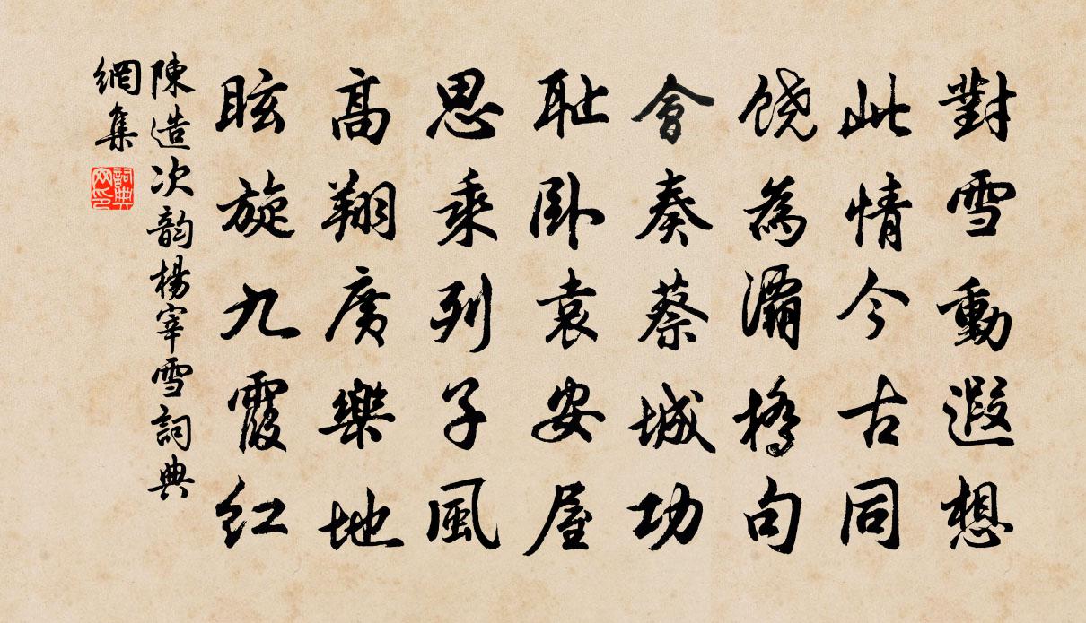 詩詞名句歷史字典書法欣賞書法字典國語詞典說文解字康熙字典古漢語字典標 題 作 者 詩 句 次韻楊宰雪作者:陳造 朝代:宋代次韻楊宰雪原文對雪動遐想,此情今古同。饒為灞橋句,會奏蔡城功。恥臥袁安屋,思乘列子風。高翔廣樂地,眩旋九霞紅。詩詞問答問:次韻楊宰雪的作者是誰?答:陳造問:次韻楊宰雪寫於哪個朝代?答:宋代陳造次韻楊宰雪書法欣賞次韻楊宰雪書法作品詩詞推薦塘上閒作齊己〔唐代〕閒行閒坐藉莎煙,此興堪思二古賢。陶靖節居彭澤畔,賀知章在鏡池邊。鴛鴦著對能飛繡,菡萏成群不語仙。形影別家後次飛狐西即事馬戴〔唐代〕遠歸從此別,親愛失天涯。去國頻回首,方秋不在家。鳴蛩聞塞路,冷雁背龍沙。西次桑乾曲,洲中見荻花。邊中送別袁崇煥〔明代〕五載離家別路悠,送君寒浸寶刀頭。欲知肺腑同生死,何用安危問去留?策杖只因圖雪恥,橫戈原不為封侯。故園送史館李學士任和州釋惟鳳〔宋代〕歷陽南望極,岸遠石城危。去夢驚潮斷,行吟見雁隨。淮帆向風闊,楚木落秋遲。到日應間臥,公心帝自知。水調歌頭(和石林韻)趙師俠〔宋代〕世態萬紛變,人事一何忙。胸中素韜奇蘊,匣劍豈能藏。不向燕然紀績,便與漁樵爭席,擺脫是非鄉。要地時難得蘭鄭燮〔清代〕此是幽貞一種花,不求聞達只煙霞。 采樵或恐通來徑,更寫高山一片遮。 沁園春劉克莊〔宋代〕老子花衰頹,晚花與親朋,約法三章。有談除目者,勒回車馬,談時事者,麾出門牆。已掛衣冠,怕言軒冕,犯令和王粹中姜特立〔宋代〕非農非吏本同塵,胸次何時不是春。戶外松筠隨意好,山中風景逐時新。擇鄉幸喜仁為里,省已深慚德有鄰,事契寄家書佚名〔宋代〕南軒北牖又東扉,取次園林待我歸。當路莫栽荊棘草,他年免掛子孫衣。送河間呂令陳師道〔宋代〕今日中牟令,當年太守孫。獨能憐此老,肯避席為門。寒日風濤壯,邊城簿領繁。平生子曾子,白首得重論。送焦吏部造朝二首李曾伯〔宋代〕向來借箸在籌帷,今趣魁纏入太微。漢郡奚勞汲生守,洛人喜見范公歸。要持真是明公論,莫急同心濟事機。見說團扇歌趙文〔宋代〕私夜必見污,葛屨必遭踐。生世不為男,託身況微賤。悲痛只在心,憔悴更障面。出入懷袖中,羨郎白團扇。句邵博〔宋代〕平池邊詩覓鄭都官。過澶魏被水民居二首之一賀鑄〔宋代〕帶沙畎畝幾經淤,半死黃桑繞故墟。未必鄰封政如虎,自甘十室九為魚。若石之死劉基〔明代〕若石居冥山之陰,有虎恆窺其藩。若石帥家人晝夜警:日出而殷鉦,日入而舉輝,築牆掘坎以守。卒歲虎不能有獲送張子容進士赴舉孟浩然〔唐代〕夕曛山照滅,送客出柴門。惆悵野中別,殷勤岐路言。茂林予偃息,喬木爾飛翻。無使谷風誚,須令友道存。挽熊去非陳普〔宋代〕疇昔鰲峰乍盍簪,為予一動伯牙琴。文明濟濟英雄集,祭禮洋洋上聖臨。古道違時成握手,狂言駭俗賴知心。群居陳徐夤〔唐代〕三惑昏昏中紫宸,萬機拋卻醉臨春。書中不禮隋文帝,井底常攜張貴嬪。玉樹歌聲移入哭,金陵天子化為臣。兵戈登黃鶴樓懷古兼寄潘豳老昆仲賀鑄〔宋代〕漢大將軍楚國材,半生倦韻浼塵埃。徐夫人匕首安在,丁令威華表歸來。紫府無蹤勞彷像,白雲有待久裴徊。樓標讀杜子美三大禮賦鄭剛中〔宋代〕牢落長安賦就時,青苔到榻有誰知。年逾四十猶無祿,筆下千篇祗有詩。風雨飄零長是客,干戈悲梗獨憂時。平生名句推薦梧桐葉上三更雨,葉葉聲聲是別離。周紫芝《鷓鴣天·一點殘紅欲盡時》 文人之筆,勸善懲惡也。王充《論衡·卷二十·佚文篇》 置將不善,壹敗塗地司馬遷《史記·高祖本紀》 匈奴草黃馬正肥,金山西見煙塵飛,漢家大將西出師。岑參《走馬川行奉送出師西征 / 走馬川行奉送封大夫出師西征》 遠雁下平沙,嘹亮遺淒唳。劉道著《湘江秋曉》 自古聖賢盡貧賤,何況我輩孤且直!鮑照《擬行路難·其六》 尚憐終南山,回首清渭濱。杜甫《奉贈韋左丞丈二十二韻》 正單衣試酒,恨客里、光陰虛擲。周邦彥《六醜·落花》 十年舊夢無尋處,幾度新春不在家。吳文英《思佳客·癸卯除夜》 遠路應悲春晼晚,殘霄猶得夢依稀。李商隱《春雨》