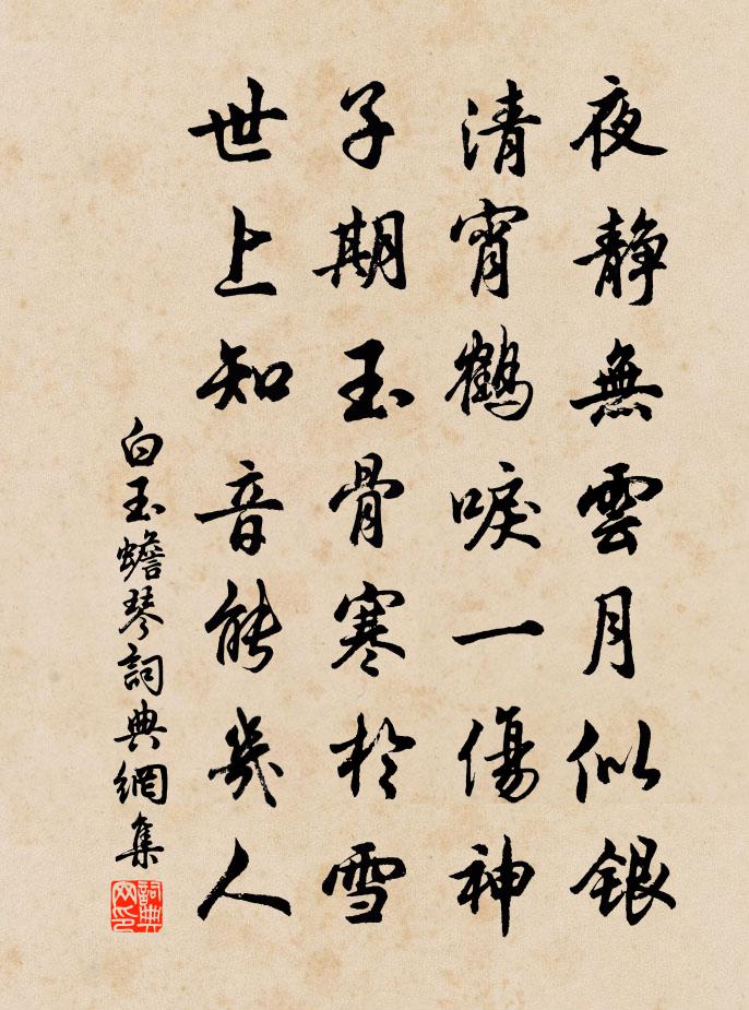 詩詞名句歷史字典書法欣賞書法字典國語詞典說文解字康熙字典古漢語字典標 題 作 者 詩 句 琴作者:白玉蟾 朝代:宋代琴原文夜靜無雲月似銀,清宵鶴唳一傷神。子期玉骨寒於雪,世上知音能幾人。詩詞問答問:琴的作者是誰?答:白玉蟾問:琴寫於哪個朝代?答:宋代問:琴是什麼體裁?答:七絕白玉蟾琴書法欣賞琴書法作品詩詞推薦偈傾一百六十九首釋智朋〔宋代〕分皮分隨誑盲聾,污卻嵩山熊耳峰。只履攜歸蔥嶺去,賊身何處不相逢。定風波歐陽修〔宋代〕過盡韶華不可添。小樓紅日下層檐。春睡覺來情緒惡。寂寞。楊花繚亂拂珠簾。早是閒愁依舊在。無奈。那堪更被和青樓贈別趙希逢〔宋代〕憑高座久漸生寒,遠水明樓夜正殘。月色照人人似月,椅欄一曲為誰彈。仲一以詩來用韻奉答陳傅良〔宋代〕剩有新詩入遞筒,豈無能畫作欣篷。金錢翠蓋相輝映,著我皤然酒借紅。詩一首石屋〔宋代〕八峰春到了,雙潤雨睛初。小室鉤簾坐,人間無畫圖。樂平樊主簿捧檄北行來別賦此奉餞黎廷瑞〔宋代〕拊字心空悴,清寒節太高。無人相料理,惟我獨賢勞。萬里隨歸雁,孤帆渺暮濤。歸期應不遠,新月點梅梢。淳熙七年端午帖子詞皇帝合六首崔敦詩〔宋代〕光浮水檻虛黃蓋,涼滿冰台待翠輿。日轉槐龍天近午,汗衣猶聽講筵書。惜瓊花·汀苹白張先〔宋代〕汀苹白。苕水碧。每逢花駐樂,隨處歡席。別時攜手看春色。螢火而今,飛破秋夕。旱河流,如帶窄。任身輕似葉十三日歸天光雲影堂張埴〔宋代〕因緣十日坐無嘩,吹盡蒲香更結跏。几上玉鴝猶刮目,階前金鳳已銜花。且將柳浪還摩詰,莫去麻丘說子嗟。滿袂題施好古示龔學古瘦馬六言方回〔宋代〕畫馬不學韓乾,我知八仰十翁心。使皆肥□□□,□□□□□可斟。翠羽池陳岩〔宋代〕錦雞花鴨爛成文,連雁雙鳧雪羽紛。同免王孫金彈子,飛來飛去一群群。恭和家大人將赴季弟官舍書示及門之作孫應符〔宋代〕焚膏繼晷且窮年,榮悴了時卻在天。莫把光陰虛度了,吾徒耕道若耕田。送王子文宰昭武真德秀〔宋代〕堂堂先太史,一節貫初終。況有壽母賢,切切唯教忠。承家諒匪易,負任丘山崇。可不日汲汲,仰希前哲蹤。敬義答閻求仁謝參寥彥溫訪於墳所秦觀〔宋代〕老濞城西木半摧,崑崙岡下路新開。故人此地銜憂去,禪客他時問疾回。聞為樹風增永感,卻因水鳥證西來。已謀入榮州境陸游〔宋代〕一起一伏黃茅岡,崔嵬破丘狐兔藏。炯炯寒日清無光,單單終日行羊腸。村落聚看如驚獐,亦有銀釵伏短牆。黃旗送集賢盛諫議出牧維揚宋庠〔宋代〕江海多年滯軾熊,書林諫霤得儒宗。寬條一劄仙泥熟,慈宴千觴湛露濃。迎舸蔽川交畫鷁,隊笳橫浦細吟龍。輕揚題徐氏手帖二首袁說友〔宋代〕不作朝家青紫綈,笑看金鼎識刀圭。石軍六帖家藏在,乞與安西手自題。得舍弟訊息杜甫〔唐代〕風吹紫荊樹,色與春庭暮。花落辭故枝,風回返無處。骨肉恩書重,漂泊難相遇。猶有淚成河,經天復東注。奉使契丹二十八首其十五虜帳蘇轍〔宋代〕虜帳冬住沙陀中,索羊織葦稱行宮。從官星散依冢阜,氈廬窟室欺霜風。舂粱煮雪安得飽,擊兔射鹿夸強雄。朝廷減字木蘭花(勝之)蘇軾〔宋代〕雙鬟綠墜。嬌眼橫波眉黛翠。妙舞蹁躚。掌上身輕意態妍。曲窮力困。笑倚人旁香喘噴。老大逢歡。昏眼猶能仔細名句推薦聲無小而不聞,行無隱而不形。荀子《荀子·勸學》 樓台處處迷芳草,風雨年年怨落花。曾棨《維揚懷古》 青海陣雲匝,黑山兵氣沖。高適《塞下曲》 人之忌,在好為人師。孟子《孟子·離婁章句上·第二十三節》 隱隱飛橋隔野煙,石磯西畔問漁船。張旭《桃花溪》 地白風色寒,雪花大如手。李白《嘲王歷陽不肯飲酒》 見善而怠,時至而疑,知非而處,此三者,道之所止也。姜子牙《六韜·文韜·明傳》 旅客三秋至,層城四望開。杜審言《登襄陽城》 仁人之事者,必務求興天下之利,除天下之害。墨子《墨子·16章 兼愛(下)》 楊柳乍如絲,故園春盡時。納蘭性德《菩薩蠻·問君何事輕離別》