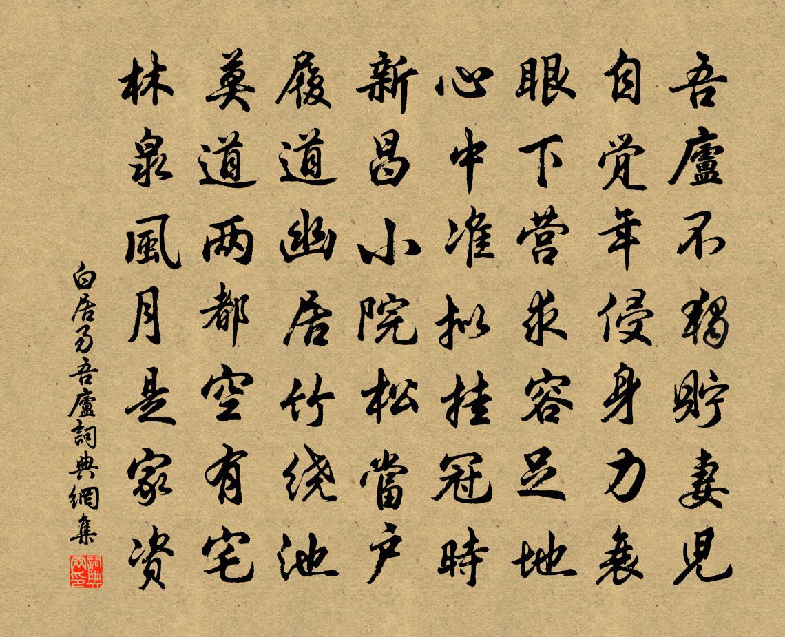 詩詞名句歷史字典書法欣賞書法字典國語詞典說文解字康熙字典古漢語字典標 題 作 者 詩 句 吾廬作者:白居易 朝代:唐代吾廬原文吾廬不獨貯妻兒,自覺年侵身力衰。眼下營求容足地,心中準擬掛冠時。新昌小院松當戶,履道幽居竹繞池。莫道兩都空有宅,林泉風月是家資。詩詞問答問:吾廬的作者是誰?答:白居易問:吾廬寫於哪個朝代?答:唐代問:吾廬是什麼體裁?答:七律問:白居易的名句有哪些?答:白居易名句大全白居易吾廬書法欣賞吾廬書法作品注釋全唐詩詩詞推薦與道原過西莊遂游寶乘王安石〔宋代〕周顒宅作阿蘭若,婁約身歸窣堵坡。今日隱侯孫亦老,偶尋陳跡到煙蘿。落日張耒〔宋代〕落日西風急,空山客獨驚。夕雲寒不動,秋水暮多聲。粟厭周人飯,蓴思故國羹。南飛有徵雁,羨爾羽毛輕。開元九詩書卷白居易〔唐代〕紅箋白紙兩三束,半是君詩半是書。經年不展緣身病,今日開看生蠹魚。壽成惠聖慈佑太皇太后閣春帖子衛涇〔宋代〕刁斗轅門五夜深,思齊文母正關心。身臨大練無他費,湯沐先捐鉅萬金。將歸贈孟東野房蜀客(蜀客名次卿)韓愈〔唐代〕君門不可入,勢利互相推。借問讀書客,胡為在京師。舉頭未能對,閉眼聊自思。倏忽十七年,終朝苦寒飢。宦途笠澤楊蟠〔宋代〕行吟澤畔心空健,解劍江頭事已非。把酒滄浪愧漁父,何人獨向秋風歸。題鄭舜舉蔗庵韓元吉〔宋代〕吾州富佳山,修竹連峻岭。居然縛塵埃,一見輒心醒。豈知刺史宅,跬步閟清景。古木盤城隅,石徑幽且迥。當年勝師堂雙竹孔武仲〔宋代〕累石為峰太謹嚴,故排雙竹辟修織。天風似亦喜清淨,時嫋枝梢為埽檐。和毅伯見寄王炎〔宋代〕欲問礦人歸未歸,江湖不見雁南飛。青雲未上辭鄉國,白璧無因困褐衣。客里書來行李滯,江南春盡落花稀。倚門贈華陰隱者方乾〔唐代〕少微夜夜當仙掌,更有何人在此居。花月舊應看浴鶴,松蘿本自伴刪書。素琴醉去經宵枕,衰發寒來向日梳。故國送郭大夫元振再使吐蕃張說〔唐代〕犬戎廢東獻,漢使馳西極。長策問酋渠,猜阻自夷殛。容發徂邊歲,旌裘敝海色。五年一見家,妻子不相識。武庫宿天台石橋林季仲〔宋代〕臥聽泉聲似雨聲,直愁泥滑馬難行。世間疑事多如許,千百年來誰與明。華亭百詠西庵許尚〔宋代〕蚤為儒冠誤,齊心學竺乾。而今林下塔,夜夜戒光圓。吳太博遺柑子梅堯臣〔宋代〕太學先生欺綠橘,吳興才士與黃柑。黃柑似日勝崖蜜,帶葉初擎翠竹籃。還料楚王曾未識,徒將萍實托江南。初食雞頭有感歐陽修〔宋代〕六月京師暑雨多,夜夜南風吹芡嘴。凝祥池鎖會靈園,僕射荒陂安可擬。爭先園客采新苞,剖蚌得珠從海底。都城魚遊春水盧祖皋〔宋代〕離愁禁不去。好夢別來無覓處。風翻征袂,觸目年芳如許。軟紅塵里鳴鞭鐙,拾翠叢中句伴侶。都負歲時,暗關情碧泉九日有感胡宏〔宋代〕雲日韜光山水幽,亭亭風送雁來秋。當時祓禊千華好,今日登臨萬葉愁。刻蠟桂香環遠路,縷金蓮色亂方舟。丹青渡興樂江望祝融張栻〔宋代〕日上寧容曉霧遮,須臾碧玉貫明霞。人謀天意適相值,寄語韓公不用夸。中伏日陪二通判妙覺寺避暑梅堯臣〔宋代〕紺宇迎涼日,方床御綌衣。清談停玉麈,雅曲弄金徽。高樹秋聲早,長廊暑氣微。不須河朔飲,煮茗自忘歸。偶與客話峽中舊遊陸游〔宋代〕我昔旅遊秋雨細,建平城東門欲閉。主人迎勞語蟬聯,小婦舂炊縞衣袂。長年三老半醉醒,蜀估峽商工算計。須臾名句推薦嘆息此人去,蕭條徐泗空李白《經下邳圯橋懷張子房》 回首暮雲遠,飛絮攪青冥。蘇軾《水調歌頭·昵昵兒女語》 為君持酒勸斜陽,且向花間留晚照。宋祁《玉樓春·春景》 奸巧語,穢污詞。市井氣,切戒之。李毓秀《弟子規·信》 冬則溫,夏則凊。晨則省,昏則定。李毓秀《弟子規·入則孝》 桃花落,閒池閣。山盟雖在,錦書難托。陸游《釵頭鳳·紅酥手》 行多有病住無糧,萬里還鄉未到鄉。盧綸《逢病軍人》 楊枝飄泊,桃根嬌小,獨自個思量。項鴻祚《太常引·客中聞歌》 悵恨不逢如意酒。尋思難值有情人。晏幾道《浣溪沙·閒弄箏弦懶系裙》 人悄悄,簾外月朧明。岳飛《小重山·昨夜寒蛩不住鳴》