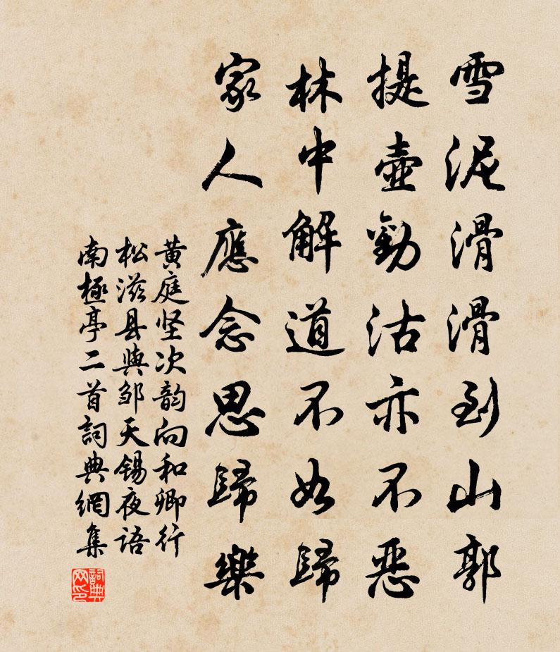 詩詞名句歷史字典書法欣賞書法字典國語詞典說文解字康熙字典古漢語字典標 題 作 者 詩 句 次韻向和卿行松滋縣與鄒天錫夜語南極亭二首作者:黃庭堅 朝代:宋代原文雪泥滑滑到山郭,提壺勸沽亦不惡。林中解道不如歸,家人應念思歸樂。詩詞問答問:《次韻向和卿行松滋縣與鄒天錫夜語南極亭二首》的作者是誰?答:黃庭堅問:該詩寫於哪個朝代?答:宋代問:黃庭堅的名句有哪些?答:黃庭堅名句大全書法欣賞次韻向和卿行松滋縣與鄒天錫夜語南極亭二首書法作品詩詞推薦絕句六十四首張伯端〔宋代〕用鉛不得用凡鉛,用了真鉛也棄捐。此是用鉛真妙訣,用鉛不用是誠言。曾仲恭侍郎惠酒以偶有名酒無夕不飲為韻謝之章甫〔宋代〕丹陽賢使君,高誼今所無。鈴齋有餘閒,遙憶耕田夫。滿船送美酒,盛事驚道途。客來即留醉,不用倩行酤。衡陽度歲戴復古〔宋代〕為懷賈誼到長沙,又過衡雲湘水涯。詩酒放懷真是癖,江湖久客若無家。茫茫萬事生春夢,草草三杯度歲華。把定謹和老人夏日東山即事二首洪咨夔〔宋代〕劃草根須盡,傳花葉未多。明波撐窣堵,老石臥盤陀。煨美甘分芋,蒸肥欠裹荷。醒然下山去,明月滿林阿。次韻無極以道寄金山寺佛監五絕二晁補之〔宋代〕不應無手是無拳,且看毛端現四天。似向吾家得訊息,鼓山餘響尚轟然。書湖陰先生壁二首王安石〔宋代〕桑條索漠棟花繁,風斂余香暗度垣。黃鳥數聲殘午夢,尚疑身屬半山園。明叔惠示二頌雲見七佛偈似有有警覺乃是向道黃庭堅〔宋代〕平生討經論,苦行峻廉隅。偽契已無分,買山雲自俱。身為郎廟宰,夢作種田夫。欲辨身兼夢,還如鼓與桴。離楚夜泊高麗館寄楊克一甥四首張耒〔宋代〕去城未五里,夜纜系衰柳。水亭暗風雨,人散聞吠狗。平生足羈旅,沉此還往久。有感不自知,悽然獨回首。豐年有高廩曾鞏〔宋代〕盛德臨昭旦,多祥獲有年。嘉禾登羨溢,高廩積連延。田入豐維億,倉收富且千。夢魚諧素兆,如櫛比前篇。瑞貺酬李郢夏日釣魚回見示魚玄機〔唐代〕住處雖同巷,經年不一過。清詞勸舊女,香桂折新柯。道性欺冰雪,禪心笑綺羅。跡登霄漢上,無路接煙波。閒夕白居易〔唐代〕一聲早蟬發,數點新螢度。蘭釭耿無煙,筠簟清有露。未歸後房寢,且下前軒步。斜月入低廊,涼風滿高樹。放懷吊岳文二公二首何夢桂〔宋代〕擬吊英雄酒一觴,二公什膽一冰霜。金人未殄將軍死,宋事無成國土亡。湖上黃埃寒柏慘,沙場青血夜燐光。生芻次韻子瞻臨皋新葺南堂五絕蘇轍〔宋代〕旅食三年已是家,堂成非陋亦非華。何方道士知人意,授與爐中一粒砂。暘谷偶成裘萬頃〔宋代〕竹近頗忻衣袂爽,苔深長恐履痕侵。夜燈四壁圖書影,曉日一床花木陰。載酒只今誰好事,絕弦從昔為知音。區區滿庭芳徐去非〔宋代〕鳳曆書元,龜圖畫泰,瑞蓂兩兩初開。舞風仙子,飛雪擁春來。平盪人間險穢,端為你沒點塵埃。清明世,冰輝太問張山人疾李端〔唐代〕先生沈病意何如,蓬艾門前客轉疏。不見領徒過絳帳,唯聞與婢削丹書。次天字韻答岑岩起蘇軾〔宋代〕一聲清蹕霧開天,百辟心莊豈貌虔。回顧驚君珠玉側,同升愧我粃糠前。裴回月色留壇影,縹緲松香泛蠟煙。(近秋夜即事陸游〔宋代〕鳥宿牛歸戶欲扃,燈前老子影伶俜。濕雲不散初聞雁,深竹微明尚有螢。一卷舊書開蠹簡,半升濁酒倒余瓶。乘閒入鄢陵界孔武仲〔宋代〕馬蹄騰踏去如流,雨止車塵凝不浮。驛道夷平桑柘美,人言從此屬皇州。悼王習之吳芾〔宋代〕兩州佳政萬人傳,一旦那知遂溘然。到底久生從古少,要須乘健早歸田。名句推薦望斷金馬門,勞歌采樵路。孟浩然《田園作》 窮年憂黎元,嘆息腸內熱。杜甫《自京赴奉先縣詠懷五百字 / 自京赴奉先詠懷五百字》 雲中君不見,竟夕自悲秋。馬戴《楚江懷古三首·其一》 將之器,其用大小不同。諸葛亮《將苑·卷一·將器》 日色已盡花含煙,月明欲素愁不眠。李白《長相思三首·其二》 紅葉滿寒溪,一路空山萬木齊。納蘭性德《南鄉子·秋暮村居》 我見君來,頓覺吾廬,溪山美哉。辛棄疾《沁園春·和吳尉子似》 星河秋一雁,砧杵夜千家。韓翃《酬程延秋夜即事見贈》 斷虹霽雨,淨秋空,山染修眉新綠。黃庭堅《念奴嬌·斷虹霽雨》 楚水辭魚窟,燕山到雁家裴說《塞上曲》