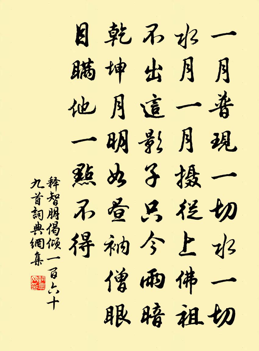 詩詞名句歷史字典書法欣賞書法字典國語詞典說文解字康熙字典古漢語字典標 題 作 者 詩 句 偈傾一百六十九首作者:釋智朋 朝代:宋代偈傾一百六十九首原文一月普現一切水,一切水月一月攝,從上佛祖不出這影子。只今雨暗乾坤,月明如晝,衲僧眼目,瞞他一點不得。詩詞問答問:偈傾一百六十九首的作者是誰?答:釋智朋問:偈傾一百六十九首寫於哪個朝代?答:宋代釋智朋偈傾一百六十九首書法欣賞偈傾一百六十九首書法作品詩詞推薦冬夜與修睦上人宿遠公亭,寄南嶽玄泰禪師李鹹用〔唐代〕丈室掩孤燈,更深霰雹增。相看雲夢客,共憶祝融僧。語合茶忘味,吟欹卷有棱。楚南山水秀,行止豈無憑。輓霞溪高縣丞二首裘萬頃〔宋代〕公家原在洪崖宅,自是洪崖向上人。嗜酒一生真簡淡,風標八袠更精神。紛紛偶厭人間事,去去歸尋洞裡春。朱紱鹽城阻冰雪贈陳德美三首陳造〔宋代〕身口真相累,風霜得備嘗。即今歌匪兕,未憗反屠羊。辟謗規閒口,因衰再覆觴。不知詩酒外,何計逭悲涼。次韻李校書雨中至四聖觀三絕句項安世〔宋代〕積雨全迷路,皇天上做春。提壺休勸客,城外有飢人。嘲子聿陸游〔宋代〕講誦多吳語,勾提學佐書。夜分燈未徹,晨起發慵梳。飽食園官菜,少留溪友魚。能憐乃翁病,身自舉籃輿。德藝有貴賤孫岩〔宋代〕調弓遣猿悲,削鋸奪神造。伊人天分高,甘以一事老。奈何握寸穎,特自矜粉藻。沈約僅如奴,子建何足道。率爾聞杜鵑趙時韶〔宋代〕雨過山山翠欲流,杜鵑要好莫啼休。錦城宮殿多菸草,枉與春風作對頭。送王校書韋應物〔唐代〕同宿高齋換時節,共看移石復栽杉。送君江浦已惆悵,更上西樓看遠帆。人日吳明輔招不往方岳〔宋代〕江湖老我百無堪,懶過岫書太史談。雨腳又連人日暗,酒腸那似少年酣。一生出處龜藏六,萬事乘除狙賦三。且試空謠吟曹勛〔宋代〕抗轡躡飛景,攜手仰員羅。空謠發新聲,群響隨節和。瓊音動虛籟,神宇凌高歌。偃蓋滄浪宮,整襟翔玉華。流目次韻子瞻秋雪見寄二首蘇轍〔宋代〕平時出處常聯袂,文翰叨陪舊服膺。自信老兄憐弱弟,豈關天下少良朋。何時杯酒看浮白,清夜餚蔬粗滿登。離思小師寫真請贊釋紹曇〔宋代〕眉似箒粗,面如漆墨。人道慈悲,誰知惡毒。蒿籬關猛虎,寬處有威。筆管養蒼龍,直中藏曲。喜臧倉沮,不遇魯送塵老入廣化米開田徐照〔宋代〕行李沖冰雪,途程半是船。去從人乞米,歸要海成田。遇景因開畫,思茶自掬泉。好風名舶趠,相候立江邊。讀赤壁賦前後二首文天祥〔宋代〕一笑滄波浩浩流,只雞斗酒更扁舟。八龍寫作詩中案,孤鶴來為夢裡游。楊柳遠煙連北府,蘆花新月對南樓。玉仙讀老莊張祜〔唐代〕等閒緝綴閒言語,夸向時人喚作詩。昨日偶拈莊老讀,萬尋山上一毫釐。雪中方岳〔宋代〕行纏不了醉生涯,空宿沙頭賣酒家。最是曉寒吟未穩,雪深無面見梅花。四用韻十首楊公遠〔宋代〕小醉初醒後,沖寒作興游。宿雲山頂散,殘雪樹根留。檐溜懸冰柱,風威凍玉樓。欲吟吟未穩,歸擁地爐休。登遷仁樓,酬子婿李穆劉長卿〔唐代〕臨風敞麗譙,落日聽吹鐃。歸路空回首,新章已在腰。非才受官謗,無政作人謠。儉歲安三戶,餘年寄六條。春蕪送澠池崔主簿韋應物〔唐代〕邑帶洛陽道,年年應此行。當時匹馬客,今日縣人迎。暮雨投關郡,春風別帝城。東西殊不遠,朝夕待佳聲。檢院即事任希夷〔宋代〕禁路風清飛蚤鴉,官卑難望紫宸衙。了無公事鉤簾坐,一本冬青落細花。名句推薦晚日寒鴉一片愁。柳塘新綠卻溫柔。辛棄疾《鷓鴣天·晚日寒鴉一片愁》 羊腸白道穿雲出,雁齒紅橋亞水低。許德溥《西橋柳色》 官無常貴而民無終賤。有能則舉之,無能則下之。墨子《墨子·08章 尚賢(上)》 爾我同心,曰金蘭;朋友相資,日麗澤。程登吉《幼學瓊林·卷二·朋友賓主》 三杯通大道,一醉解千愁。佚名《增廣賢文·上集》 數年來往鹹京道,殘杯冷炙謾消魂晏殊《山亭柳·贈歌者》 兒童漫相憶,行路豈知難。元好問《倪莊中秋》 遊人記得承平事,暗喜風光似昔年。韋莊《長安清明》 行舟逗遠樹,度鳥息危檣。陰鏗《渡青草湖》 砧面瑩,杵聲齊。搗就征衣淚墨題。賀鑄《杵聲齊·砧面瑩》