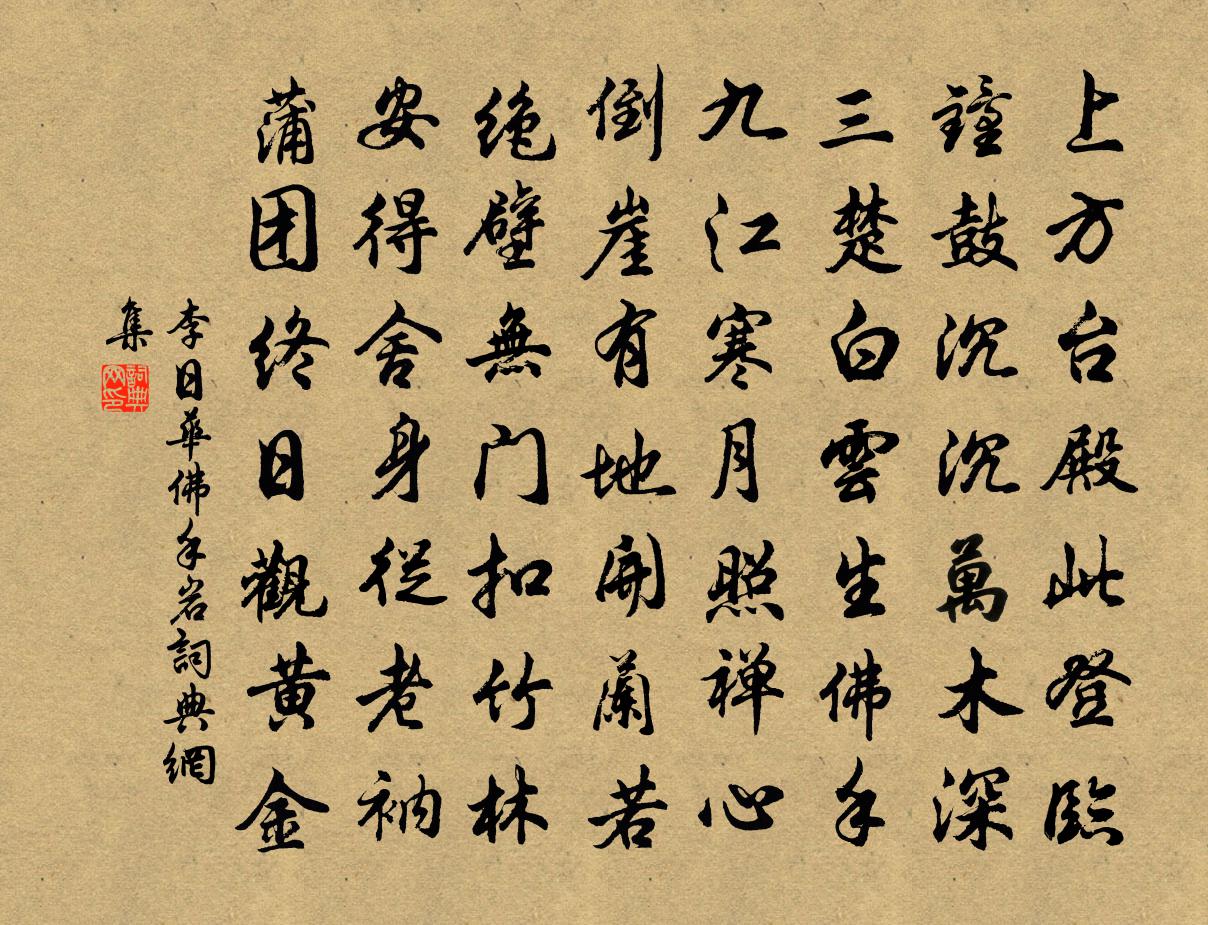 詩詞名句歷史字典書法欣賞書法字典國語詞典說文解字康熙字典古漢語字典標 題 作 者 詩 句 佛手岩作者:李日華 朝代:明代佛手岩原文上方台殿此登臨,鐘鼓沉沉萬木深。三楚白雲生佛手,九江寒月照禪心。倒崖有地開蘭若,絕壁無門扣竹林。安得捨身從老衲,蒲1~1團終日觀黃金。詩詞問答問:佛手岩的作者是誰?答:李日華問:佛手岩寫於哪個朝代?答:明代李日華佛手岩書法欣賞佛手岩書法作品詩詞推薦柳梢青 右和盛開九思〔元代〕翠苔輕搭。南枝逗暖,乍收漸霎。亂插繁花,快張華宴,繞衣千匝。玉堂無限風流,但只欠、些兒雪壓。任選一枝池邊梅花一株盛開王炎〔宋代〕老來裘褐怯風吹,難傍花邊把一卮。嚼蕊嗅香清興在,尚呵凍筆欲題詩。偈頌六十首釋曇華〔宋代〕去時冒雨連宵去,回來帶水又托泥。自怪一生無定力,尋常多被業風吹。謝益州司理劉大著寄惠筇竹杖魏野〔宋代〕雖勝斑竹與紅藤,絕遠羸軀豈易憑。爭得化龍歸錦水,老身騎去見心朋。古樂府釋斯植〔宋代〕欲買采菱船,野水無人識。野水去不回,迢迢暮山碧。伯東留詩別余次韻劉克莊〔宋代〕殘生恰似道傍樗,匠斧樵柯免剪除。撚我幾須安個字,見君一面勝千書。貧家僅有難為黍,貴安相過翠織裾。稚子次答邦直、子由五首蘇軾〔宋代〕城南短李好交遊,箕踞狂歌不自由。尊主庇民君有道,樂天知命我無憂。醉呼妙舞留連夜,閒作清詩斷送秋。瀟灑送芍藥葉翥〔宋代〕清和天氣屬良辰,芳事枝頭跡已陳。閒涉小園銷永晝,尚留紅藥殿余春。栽培元是根宜地,幻化須知花有神。約定嚴山趙蕃〔宋代〕春風吹桃花,適與流水會。流水固無心,桃花亦何意。如何武陵人,便至神仙家。神仙不可見,回首空煙霞。送凌應蘭玉傳詩序方回〔宋代〕壬戌同先祖,登名四十年。吾衰逃世網,子學紹家傳。好作聲名計,姑隨仕宦緣。王奇有故事,即見旅朝賢。桃源李白〔唐代〕昔日狂秦事可嗟,直驅雞犬入桃花。至今不出煙溪口,萬古潺湲二水斜。 窺開吟邵雍〔宋代〕物理窺開後,人情照破前。止堪令執筆,不可便持權。送歐陽主簿赴官韋城四首蘇軾〔宋代〕鳳雛驥子日相高,白髮蒼顏笑我曹。讀遍牙籤三萬軸,卻來小邑試牛刀。出處年來恨不齊,一樽臨水記分攜。江湖再和前韻三首曾協〔宋代〕幽姿健骨兩相看,二絕真成聚莫乾。好學紉蘭供楚佩,瓊琚端可勝金寒。寄潮州楊繼之白居易〔唐代〕相府潮陽俱夢中,夢中何者是窮通?他時事過方應悟,不獨榮空辱亦空。滎陽懷古王禹偁〔宋代〕紀信生降為沛公,草荒孤壘想英風。漢家青史緣何事,卻道蕭何第一功。淳熙七年春帖子壽聖齊明廣慈太上皇后合六崔敦詩〔宋代〕蒼龍檠替道春回,盡把韶華和酒杯。但見殿前移仗退,已聞苑內奏花開。賜齊州李希遇詩呂岩〔唐代〕少飲欺心酒,休貪不義財。福因慈善得,禍向巧奸來。春晚范成大〔宋代〕陰陰垂柳閉朱門,一曲闌乾一斷魂。手把青梅春已去,滿城風雨怕黃昏。感春三首韓愈〔唐代〕偶坐藤樹下,暮春下旬間。藤陰已可庇,落蕊還漫漫。新葉大,瓏瓏晚花乾。==青天高寥寥,兩蝶飛翻翻。時節名句推薦知而好問,然後能才。荀子《荀子·儒效》 所敬者寡,而悅者眾,此之謂要道也。孔子及其弟子《孝經·廣要道》 兼相愛,交相利。墨子《墨子·15章 兼愛(中)》 天將暮,雪亂舞,半梅花半飄柳絮。馬致遠《壽陽曲·江天暮雪》 漢兵已略地,四方楚歌聲。虞姬《和項王歌》 見人善,即思齊。縱去遠,以漸躋。李毓秀《弟子規·信》 佇聽寒聲,雲深無雁影。周邦彥《關河令·秋陰時晴漸向暝》 何用慰相思,裁書寄關右。李益《送諸暨王主簿之任》 旌蔽日兮敵若雲,矢交墜兮士爭先。屈原《國殤》 治於神者,眾人不知其功;爭於明者,眾人知之。墨子《墨子·50章 公輸》