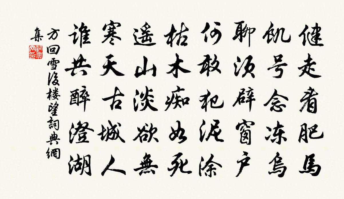 詩詞名句歷史字典書法欣賞書法字典國語詞典說文解字康熙字典古漢語字典標 題 作 者 詩 句 雪後樓望作者:方回 朝代:宋代雪後樓望原文健走看肥馬,飢號念凍烏。聊須辟窗戶,何敢犯泥塗。枯木痴如死,遙山淡欲無。寒天古城人,誰共醉澄湖。詩詞問答問:雪後樓望的作者是誰?答:方回問:雪後樓望寫於哪個朝代?答:宋代方回雪後樓望書法欣賞雪後樓望書法作品詩詞推薦次韻四兄蘆晃沖之〔宋代〕公如柳柳州,柳橋如柳浪。惱殺涉溱人,望望不可上。題楊氏猗猗閣胡宏〔宋代〕林生何猗猗,挺立似豪傑。新稍一直上青冥,本末便與春風徹。嗟哉流俗人,交義隨情決。寒霜落千山,我愛此君寄準上人司空曙〔唐代〕昨聞歸舊寺,暫別欲經年。樵客應同步,鄰僧定伴禪。後峰秋有雪,遠澗夜鳴泉。偶與支公論,人間自共傳。夏日北榭賦詩弈棋欣然有作陸游〔宋代〕異事嚴州省見稀,幅巾闌角立多時。青林白鳥自成畫,急雨好風當有詩。酷信醫方逢酒怯,強驅吏牘坐衙遲。悠然秋日即事五首陳普〔宋代〕遊絲閃閃掛虛檐,翔隼號寒華岳尖。白髮束來閒點易,烏衣歸去寂鉤簾。三千客路飛機楓葉,四五人家賣酒帘。魚六和劉克莊〔宋代〕范老登科猶別姓,余公應舉亦更名。人心何止矛般險,世道於今砥似平。到了赭衣同適市,知它白棓欲誰坑。雲端桂隱紀詠竹橋張鎡〔宋代〕新篁故蒙叢,惡草剛薈醫。刪薙似少恩,成渠玉無際。次韻何茂宏見寄喻良能〔宋代〕牧之俯首隨韁鎖,元亮高情樂里閭。樽酒未能供一笑,尺書多謝附雙魚。示羅教授楚知監朱昱〔宋代〕半世交遊無遠信,一時賓客有新知。泮宮官冷宜談妙,圜府錢流不廢寺。封水占山為久客,合樽促席及佳時。盆山除夕前一日雪仇遠〔宋代〕江城臘盡漸春來,三白呈祥不待催。和氣已知隨處滿,梅花正用此時開。寒香冷艷相吞吐,月斧風斤巧剪裁。布絮宣化道中范成大〔宋代〕瘦草蕭疏已似秋,盤陀山骨束江流。兩崖若不頑如鐵,爭得狂瀾拍岸休東窗偶書陸游〔宋代〕萬事何曾有速淹,熊鱕魚腹自難兼。山川置掌猶能取,日月無膠可得黏?稚子幸堪持几杖,老生元自慣齏鹽。清晨臥病喜田九見寄劉長卿〔唐代〕臥來能幾日,春事已依然。不解謝公意,翻令靜者便。庭陰殘舊雪,柳色帶新年。寂寞深村里,唯君相訪偏。浪淘沙 火里生蓮王哲〔元代〕陽氣透蒼天。照照綿綿。地戶猛焰亦如然。發出水中真覺性,一朵紅蓮。早早認清泉。結取因緣。烏龜口內吐靈煙八聲甘州王奕〔宋代〕誦公詩、大雅久不聞,吾衰竟誰陳。自晉宋以來,隋唐而下,旁若無人。光焰文章萬丈,肯媚永王璘。卓有汾陽老論詩三十首·二十元好問〔金代〕謝客風容映古今,發源誰似柳州深? 朱弦一拂遺音在,卻是當年寂寞心。 寄呂許公梅詢〔宋代〕十五年前忝一麾,公餘嘗得預言詩。玉階步武為霖早,雲路風波得志遲。浴鳳池深春蕩蕩,觀魚台古草離離。重來六憶詩沈約〔南北朝〕憶食時。臨盤動容色。欲坐復羞坐。欲食復羞食。含哺如不飢。擎甌似無力。乾道七年冊皇太子四首佚名〔宋代〕建儲以賢,闢宮於東。典冊既德,筮占既後。濟濟卿士,鏘鏘鼓鍾。天子戾止,盛哉禮容。次子都兄借楊凝式帖韻李洪〔宋代〕楊李書名五季間,江南勁筆儉而寒。臨摹更陋唐人筆,不脫蘭亭舊界闌。名句推薦竹疏虛檻靜,松密醮壇陰。張泌《女冠子·露花菸草》 此夜曲中聞折柳,何人不起故園情。李白《春夜洛城聞笛 / 春夜洛陽城聞笛》 砌下落花風起,羅衣特地春寒。馮延巳《清平樂·雨晴煙晚》 夏條綠已密,朱萼綴明鮮。韋應物《夏花明》 花片片飛風弄蝶,柳陰陰下水平橋。張先《浣溪沙·樓倚春江百尺高》 獨善其身盡日安,何須千古名不朽!羅貫中《三國演義·第三十七回》 行人刁鬥風沙暗,公主琵琶幽怨多。李頎《古從軍行》 一樹春風千萬枝,嫩於金色軟於絲。白居易《楊柳枝詞》 以國為國,以天下為天下。劉向 編《六親五法》 楊柳乍如絲,故園春盡時。納蘭性德《菩薩蠻·問君何事輕離別》