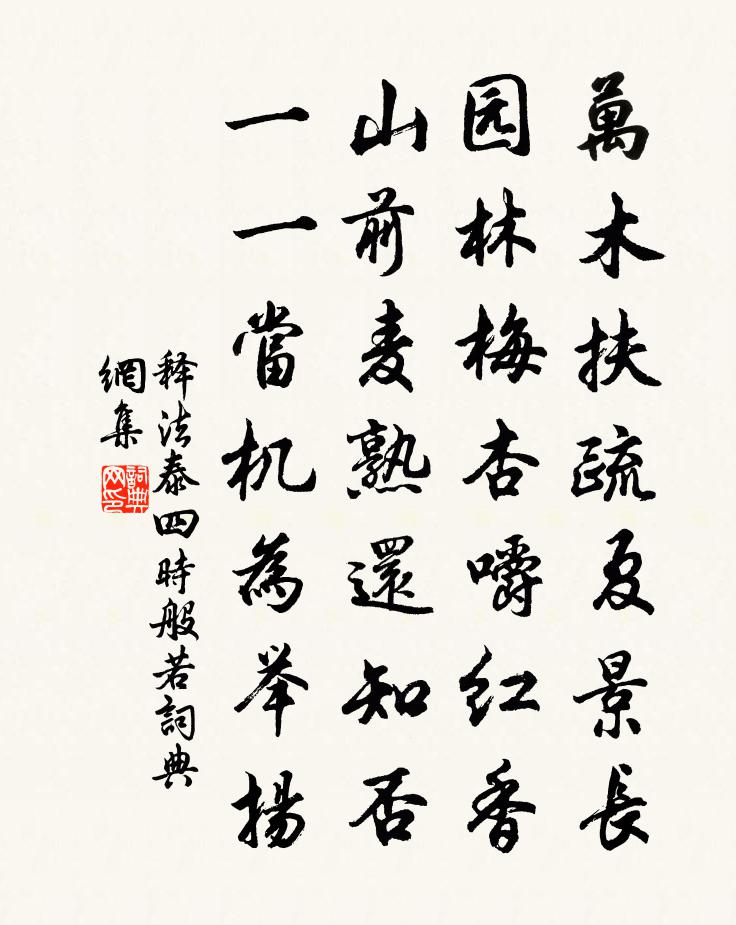 詩詞名句歷史字典書法欣賞書法字典國語詞典說文解字康熙字典古漢語字典標 題 作 者 詩 句 四時般若作者:釋法泰 朝代:宋代四時般若原文萬木扶疏夏景長,園林梅杏嚼紅香。山前麥熟還知否,一一當機為舉揚。詩詞問答問:四時般若的作者是誰?答:釋法泰問:四時般若寫於哪個朝代?答:宋代釋法泰四時般若書法欣賞四時般若書法作品詩詞推薦簡徐季益趙蕃〔宋代〕南山最數月台高,曾著能詩何水曹。略計出山今幾載,生令梅賦闕風騷。二月五日柳溪過風李復〔宋代〕狂風擺撼未肯休,直須枯卉生新柔。老松倚雲不關意,開落曾閱幾春秋。延平次趙糾曹韻十四首古香陳宓〔宋代〕秋根托岩隈,靜對意味長。春來長柔柯,無風自生香。鑑湖月夜行舟林概〔宋代〕湖光如鑒月如珪,月下湖中兩槳飛。鶴氅四垂冰骨爽,夜深疑自廣寒歸。題舒鄉曹鄴〔唐代〕功名若及鴟夷子,必擬將舟泛洞庭。柳色湖光好相待,我心非醉亦非醒。杭州雜詩和林石田汪元量〔宋代〕休休休休休,干戈盡白頭。諸公雲北去,萬事水東流。春雨不知止,晚山相對愁。呼童攜斗酒,我欲一登樓。詠史上蘇武陳普〔宋代〕伏匿窮廬煖意回,子卿一夜夢陽台。歸來不與曾孫議,未必麒麟生面開。靜吟史彌寧〔宋代〕居官役役簿書間,及到家山困往還。若欲靜吟無俗累,算來卻是客中閒。南山羅漢贊十六首黃庭堅〔宋代〕佛光影中大杜多,八萬細行滅塵勞。愛護有情如眼目,胡奴來供濾水囊。手持白拂起清風,奉持所聞佛直指。小根送趙富文粹洪州三首周必大〔宋代〕花發河陽政早成,策勛恩擢佐藩臣。雞翹豹尾他年從,且作銀章第一人。黃龍三關釋慧開〔宋代〕佛手紡腳生緣,非佛非道非禪。莫怪無門關險,結盡衲子興冤。病中感秋,時初喪壽佺子楊萬里〔宋代〕臨曉睡偏重,不知窗已明。高梧下清露,宿鳥有寒聲。愁豈關須事,秋來添雪莖。病身仍哭子,並作老來情。華清宮林寬〔唐代〕殿角鍾殘立宿鴉,朝元歸駕望無涯。香泉空浸宮前草,未到春時爭發花。憶秦娥趙雍〔元代〕春寂寂。重門半掩梨花雪。梨花雪。芳心如醉,暗思當日。金釵欲墮烏雲側。佳人望斷天涯客。天涯客。今年又過題永嘉黃仲炎文卷二首劉克莊〔宋代〕龍泉筆絕文章熄,此作居然可貴珍。激處翻嫌董生緩,新來卻笑退之陳。假令覆瓿無知者,尚可藏山待後人。外物水調歌頭 次前韻王惲〔元代〕紉蘭綴芳佩,遠駕振靈修。王城似海無際,泛若一輕舟。誰著朱衣白簡,老坐凝床十日,雙鶻漫橫秋。落日壯心在次出門韻楊萬里〔宋代〕有酒何須富?無車卻好行。眼中長得句,身外豈關情。遠嶺寒逾瘦,乾楓落更聲。好懷非自悶,且道向誰傾。雙井鄭清之〔宋代〕水神何時生六翮,飛出雙泉江練白。平湖浸月渺無邊,一笑對之成揖客。轆轤初動曉星橫,夜卷寒瓊聲{左氵右砉追次仇仁近韻謾成三首方回〔宋代〕臥思身世事,無夜不更深。脫難泅登岸,逃名影就陰。樽中醉魯酒,弦外自陶琴。詩就誰能賞,徒勞太古吟。題山石榴花白居易〔唐代〕新年三五東林夕,星漢迢迢鍾梵遲。花縣當君行樂夜,松房是我坐禪時。忽看月滿還相憶,始嘆春來自不知。不覺名句推薦凡學之道,嚴師為難。戴聖《禮記·學記》 伊川桃李正芳新,寒食山中酒復春。宋之問《寒食還陸渾別業》 誓將掛冠去,覺道資無窮。岑參《與高適薛據同登慈恩寺浮圖》 天若有情天亦老,搖搖幽恨難禁。孫洙《河滿子·秋怨》 幾處早鶯爭暖樹,誰家新燕啄春泥。白居易《錢塘湖春行》 老圃好栽培,菊花五月開。顧太清《菩薩蠻·端午日詠盆中菊》 君歌楊叛兒,妾勸新豐酒。李白《楊叛兒》 無為其所不為,無欲其所不欲。孟子《孟子·盡心章句上·第十七節》 偶然值林叟,談笑無還期。王維《終南別業 / 初至山中 / 入山寄城中故人》 誰憐旅愁荏苒。謾長門夜悄,錦箏彈怨。張炎《解連環·孤雁》