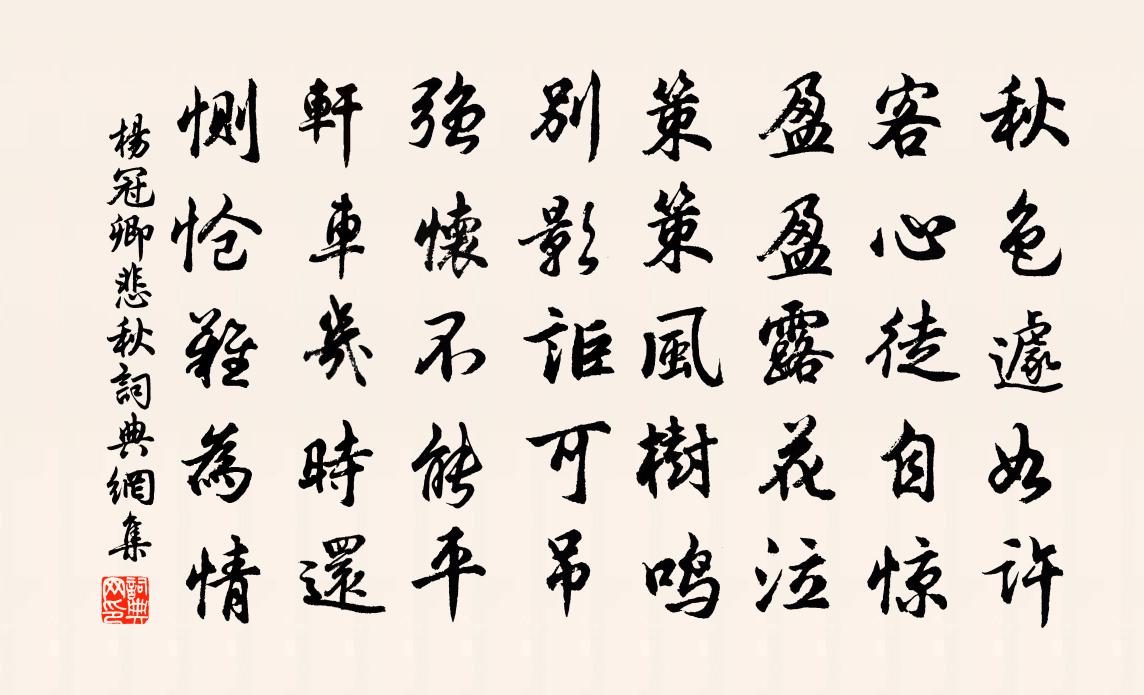 詩詞名句歷史字典書法欣賞書法字典國語詞典說文解字康熙字典古漢語字典標 題 作 者 詩 句 悲秋作者:楊冠卿 朝代:宋代悲秋原文秋色遽如許,客心徒自驚。盈盈露花泣,策策風樹鳴。別影詎可吊,強懷不能平。軒車幾時還,惻愴難為情。詩詞問答問:悲秋的作者是誰?答:楊冠卿問:悲秋寫於哪個朝代?答:宋代楊冠卿悲秋書法欣賞悲秋書法作品詩詞推薦次適安感古二首胡仲弓〔宋代〕少陵合與古詩班,不是詩家持論寬。風雅近來隨世變,詩無可采不須官。書王定國所藏王晉卿畫著色山二首蘇軾〔宋代〕君歸嶺北初逢雪,我亦江南五見春。寄語風流王武子,三人俱是識山人。通泉縣署屋壁後薛少保畫鶴杜甫〔唐代〕薛公十一鶴,皆寫青田真。畫色久欲盡,蒼然猶出塵。低昂各有意,磊落如長人。佳此志氣遠,豈惟粉墨新。萬里題徐聖可知縣所藏楊補之二畫樓鑰〔宋代〕誰種疏梅古岸頭,推蓬瞥見倍清幽。君看竹外一枝好,真有江南萬斛愁。贈溫州韓使君陳陶〔唐代〕康樂風流五百年,永嘉鈴閣又登賢。嚴城鼓動魚驚海,華屋尊開月下天。內使筆鋒光案牘,鄢陵詩句滿山川。今來范待制輓詩二首洪咨夔〔宋代〕太白曉焰焰,飛鴻秋冥冥。氣節蚤已勁,勛名晚逾馨。冰霜蜀棧蹇,風雨秦關腥。一范不可作,岷峨千古青。即事二首司空圖〔唐代〕茶爽添詩句,天清瑩道心。只留鶴一隻,此外是空林。御禮征奇策,人心注盛時。從來留振滯,只待濟臨危。岳陽樓雜詠十二絕胡寅〔宋代〕汨潭桂酒奠三閭,尚想夷猶泛五瀦。進退存亡皆有義,懷沙處死是何如。緣識宋太宗〔宋代〕夜醮星壇海岳飛,龍車搖曳羽雲衣。紅霞影里輕煙色,玉燭風清皓月輝。三島花明鋪錦繡,千年鶴送下金扉。仙家再過常山和昔年留別詩蘇軾〔宋代〕傴僂山前叟,迎我如迎新。那知夢幻軀,念念非昔人。江湖久放浪,朝市誰相親。卻尋泉源去,桃花逢避秦。池亭小酌李覯〔宋代〕客思都無著,臨池一醉歌。喚春呈物象,移性入天和。月影碎荊玉,波紋緯蜀羅。相看盡仙骨,俗態已無多。題吹衣亭鄧肅〔宋代〕馬上衣衫涴塵土,斂板權門腰傴僂。冷風天上呼不來,厚顏如甲汗如雨。星郎高韻凌雲煙,天籟喚歸酌流泉。人間再和前韻三首王炎〔宋代〕窮巷曾勤特地過,瀾翻舌本落懸河。君方跡未離塵土,我亦身嘗墮網羅。幸有吾曹相爾汝,肯教俗子更誰何。詩成三堂書懷吳則禮〔宋代〕青春已復作許妙,蜀錦輕覆千林殷。愧無好語贈秦嶺,猶想柁樓縈戍山。少日清尊兼白墮,暮年華發與蒼顏。自憐送官歸作戴表元〔宋代〕人世悔識字,祝身如野農。勤勞養尊老,膳味日可重。晨芻熟新黍,耕林有過從。行吟聆松籟,此樂逾歌鍾。次韻和酬楊樂道待制詠雪梅堯臣〔宋代〕梁苑孝王跡,灞陵遊客心。牧羊來海上,泛棹向山陰。興賞曾何淺,羈棲棲以深。穆歌猶在竹,郢曲自傳琴。旗凍梅花十絕句趙蕃〔宋代〕風月懸知非俗物,與梅相對卻成三。是中故有無窮意,曲幾團蒲須細參。嗚嗚陳起〔宋代〕嗚嗚畫角悲,又復掩柴扉。夜月雲千里,春城水四圍。連宵燈報喜,幾日鳥啼歸。飛盡東郊絮,誰憐尚袷衣。布袋贊釋師範〔宋代〕誰管你地,誰管你天。放下布袋,打一覺眠。若論當來補處,驢年更待驢年。謁金門(懷故居作)蘇庠〔宋代〕何處所。門外冷雲堆浦。竹里江梅寒未吐。茅屋疏疏雨。誰遣愁來如許。小立野塘官渡。手種凌霄今在否。柳浪迷名句推薦葉開隨足影,花多助重條。陰鏗《雪裡梅花詩》 輪台九月風夜吼,一川碎石大如斗,隨風滿地石亂走。岑參《走馬川行奉送出師西征 / 走馬川行奉送封大夫出師西征》 昔別君未婚,兒女忽成行杜甫《贈衛八處士》 三人行,則損一人;一人行,則得其友。姬昌《周易·損卦》 別來半歲音書絕,一寸離腸千萬結。韋莊《應天長·別來半歲音書絕》 多謝月相憐,今宵不忍圓。朱淑真《菩薩蠻·山亭水榭秋方半》 以德就列,以官服事,以勞殿賞,量功而分祿。墨子《墨子·08章 尚賢(上)》 雷雨窈冥而未半,皦日籠光於綺寮。左思《三都賦》 盪而失水,螻蟻得意焉。韓非及後人《韓非子·說林下》 事莫明於有效,論莫定於有證王充《論衡·卷二十三·薄葬篇》