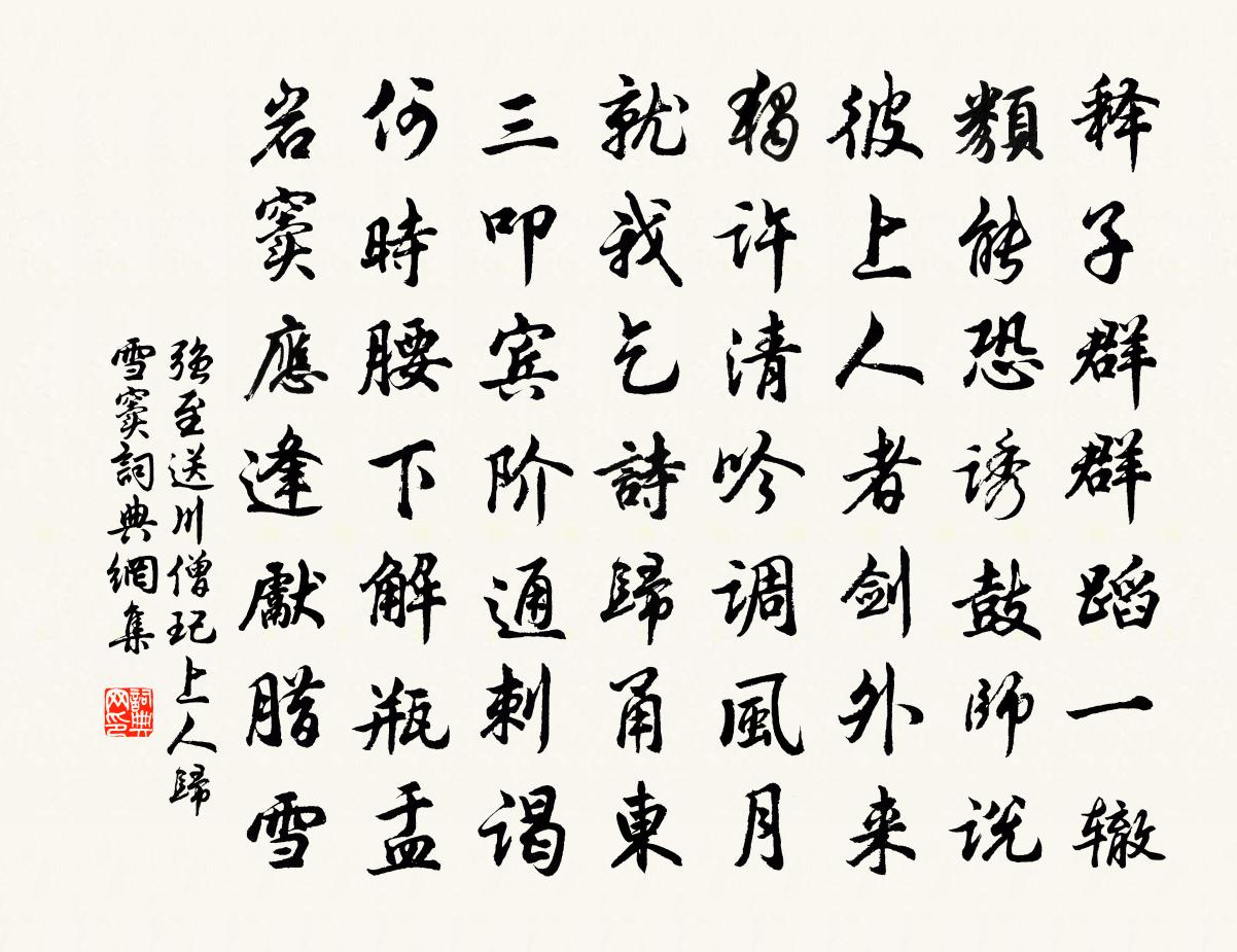 詩詞名句歷史字典書法欣賞書法字典國語詞典說文解字康熙字典古漢語字典標 題 作 者 詩 句 送川僧玘上人歸雪竇作者:強至 朝代:宋代送川僧玘上人歸雪竇原文釋子群群蹈一轍,類能恐誘鼓師說。彼上人者劍外來,獨許清吟調風月。就我乞詩歸甬東,三叩賓階通刺謁。何時腰下解瓶盂,岩竇應逢先臘雪。詩詞問答問:送川僧玘上人歸雪竇的作者是誰?答:強至問:送川僧玘上人歸雪竇寫於哪個朝代?答:宋代強至送川僧玘上人歸雪竇書法欣賞送川僧玘上人歸雪竇書法作品詩詞推薦金剛隨機無盡頌離色離相分第二十釋印肅〔宋代〕別是一家春,豈俱日月輪。諸法不相到,閒身混白雲。舟趙葵〔宋代〕櫓聲伊軋下漓來,驚起沙鷗去又回。小艇暫停曲江游,推篷和雪看寒梅。採桑子朱敦儒〔宋代〕一番海角淒涼夢,卻到長安。翠帳犀簾。依舊屏斜十二山。玉人為我調琴瑟,顰黛低鬟。雲散香殘。風雨蠻溪半夜過陂子逕五十餘里,喬木蔽天,遣悶七絕句楊萬里〔宋代〕山窮喜見一平川,不似林中不識天。只出此山災便散,何須更問小行年。次韻馬樞密二首許月卿六〔宋代〕年來閉戶學崇深,邂逅論文悅我心。濁酒一杯茶一碗,坐看日影轉桐陰。題歐陽君舉進修堂曾豐〔宋代〕輕一尺璧重寸陰,白千丈發丹寸心。假途游夏時汲汲,歸宿淵騫日駸駸。速肖無拘渠七十,近取莫過吾六一。氣節和張器先十絕楊萬里〔宋代〕學成不必要心齊,眼到前修腳自偕。挽住春風還獨笑,更無一物可裝懷。山居雜詩九十首曹勛〔宋代〕澤國經炎夏,常厭日晷永。既乏枕簟涼,亦欠冰雪冷。北窗但倦臥,閒人遠造請。時濯醒心泉,柳下汲深井。長安夜遊袁不約〔唐代〕鳳城連夜九門通,帝女皇妃出漢宮。千乘寶蓮珠箔卷,萬條銀燭碧紗籠。歌聲緩過青樓月,香靄潛來紫陌風。長樂市人有弄虎者兒輩請觀飼以豚蹄睹其攫噬戲作韓元吉〔宋代〕長年肉食定何功,乞汝豚足且慰窮。猿臂將軍應老矣,南山忽憶夜彎弓。醉中示侄薄陳著〔宋代〕山茶風香酒微波,杏花日長人笑歌。兒孫歡擁白髮婆,煮菜解醉不厭多。人生樂事恐蹉跎,世事等是一夢柯。孝義句馮介〔宋代〕坐上擊甌清似玉,檻前流水碧如藍。金剛隨機無盡頌結實分主釋印肅〔宋代〕心傳靜夜鍾,意在九霄中。佇聽鐘聲響,為人萬劫窮。崇安寺謁歸雲老大不遇李彌遜〔宋代〕入寺又逢曦未來,草荒庭院幾生埃。黃華翠竹無人問,只得僧房一夢回。送隆上人游淮南釋行海〔宋代〕欲向淮南作勝游,如何卻在雁來秋。戰曾採石連青海,恨不回龍到白溝。山立金焦雙砥柱,地分吳楚一江流。憑君幽居陸游〔宋代〕剡曲故廬歸未得,蹔從地主借茅茨。桃花春水夢不到,菰菜秋風心自知。強健猶穿幾兩屐,榮華正似一絇絲。此心韓知府輓詩二首虞儔〔宋代〕方美朱輪貴,俄驚丹旐新。鳳毛看二子,鶴髮慰偏親。甲第歸無日,名園跡已陳。風流山下路,楚挽倍傷神。次韻馬少伊、郁舜舉寄示同游石湖詩卷七首范成大〔宋代〕兩賢風度藹春陽,步屧隨風上柳塘。彩筆紅牋芳徑里,句中挾我萬花香。松謝子才〔宋代〕壯節無雙獨占春,靈根誰肯混凡塵。有時雷雨掀天地,疑是蒼龍獨奮身。贈行在李主人二字姚勉〔宋代〕李家自古兩詩仙,太白長吉相後先。蟠螭屈曲作妙語,到今氣焰乾雲天。君家家裡二奇子,眼如明珠頭玉峙。長成名句推薦日射人間五色芝,鴛鴦宮瓦碧參差。元好問《浣溪沙·日射人間五色芝》 日暮鄉關何處是?煙波江上使人愁。崔顥《黃鶴樓 / 登黃鶴樓》 信者人之乾也,義者行之節也。劉向《列女傳·貞順傳·陳寡孝婦》 動失之繁,靜失之寡。王通《中說·卷十·關朗篇》 冰泮寒塘水綠,雨余百草皆生。韋應物《三台》 梅子黃時日日晴,小溪泛盡卻山行曾幾《三衢道中》 心能辨事非,處事方能決斷;人不忘廉恥,立身自不卑污。王永彬《圍爐夜話·第二十則》 何以解憂?唯有杜康。曹操《短歌行》 深夜無風新雨歇,涼月,露迎珠顆入圓荷。閻選《定風波·江水沉沉帆影過》 落日暴風雨,歸路繞汀灣蘇舜欽《水調歌頭·滄浪亭》