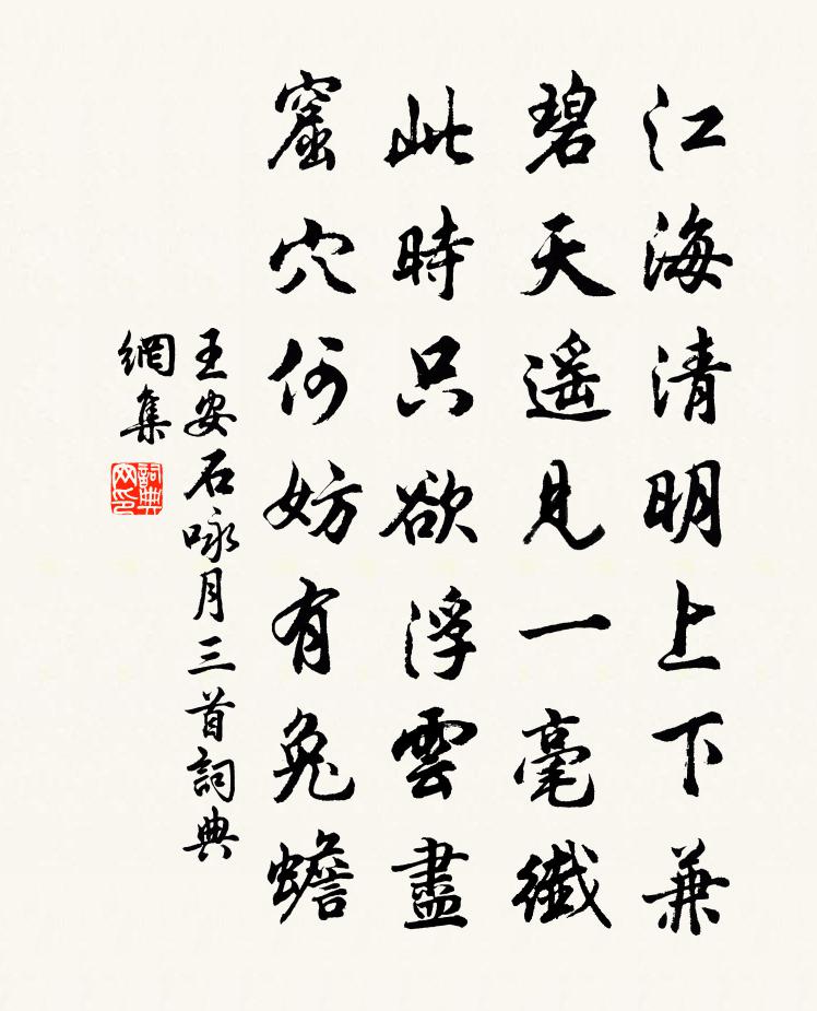 詩詞名句歷史字典書法欣賞書法字典國語詞典說文解字康熙字典古漢語字典標 題 作 者 詩 句 詠月三首作者:王安石 朝代:宋代詠月三首原文江海清明上下兼,碧天遙見一毫纖。此時只欲浮雲盡,窟穴何妨有兔蟾。詩詞問答問:詠月三首的作者是誰?答:王安石問:詠月三首寫於哪個朝代?答:宋代問:王安石的名句有哪些?答:王安石名句大全王安石詠月三首書法欣賞詠月三首書法作品詩詞推薦挽京口使君豐郎中十首劉宰〔宋代〕南徐開府未旬時,一掃煩苛布惠慈。孺子竟孤縣榻望,伯牙空有絕弦悲。和李雁湖晚春即事八首吳泳〔宋代〕藹藹停雲八表昏,終風吹雨泊天門。繫船東港緣壕去,落日牛羊下遠村。春詞毛滂〔宋代〕睍睆黃鸝出,參差紫燕飛。君仁罿罻闊,惠及羽毛微。及第東歸泗上遇孫穆之話別趙湘〔唐代〕偶負同年約,知君先出京。相逢得酒病,欲別值蟬聲。共立山當眼,分題雨過城。東歸幾人問。為子恥詩名。依韻和劉原甫舍人楊州五題其四蒙谷梅堯臣〔宋代〕茗園匆蒨與山籠,一夜驚雷發舊叢。五馬留連未能去,土囊深處路微通。送辯兄歸松江釋紹曇〔宋代〕聽清猿罷啼煙霞,聲色純真未到家。一曲吳歌歸棹穩,松江雪點白蘋花。劉人舍攜酒有詩和其韻二首杜范〔宋代〕匆匆歲事又更新,一氣初回萬木春。獨有江梅殊未覺,凜然冰雪照詩人。次姜堯章贈詩卷中韻陳造〔宋代〕自甘謝祖風,屑屑掃一室。準擬高史來,函丈置三席。聲名絕輩行,文字追古昔。黃白馬上郎,覿面不相挹。贈韓山人盧綸〔唐代〕見君何事不慚顏,白髮生來未到山。更嘆無家又無藥,往來唯在酒徒間。夜宴安樂公主宅盧藏用〔唐代〕侯家主第一時新,上席華年不惜春。珠釭綴日那知夜,玉斝流霞畏底晨。夜行船侯善淵〔元代〕*雪囊中無俗物。恣疏慵、有誰拘束。不患虛名,無榮無辱。佻佻幾人相逐。獨坐弦歌*盈卮。昂簪看、斷雲相續沖虛觀梁真素〔宋代〕三千六百丈羅浮,來今往古得仙遊。轉頭丹葛如昨日,接武蘇轅能幾秋。石洞尚聽黃鶴語,鐵橋仍見紫雲留。當時玲瓏玉(半閒堂賦春雪)姚雲文〔宋代〕開歲春遲,早贏得、一白瀟瀟。風窗淅簌,夢驚金帳春嬌。是處貂裘透暖,任尊前回舞,紅倦柔腰。今朝。虧陶家挽內子郭燻〔宋代〕山嵬嵬兮日西,望吾侶兮不歸。惆悵兮階前,物換兮人非。春去兮花殘,春歸兮芳菲。老不可以再壯,君胡為而先送蔡迨赴桂陽令周必大〔宋代〕工部詩題滿劍川,儀曹文筆照湖南。身行蜀棧曾幽討,舟掛吳帆又飽參。睎驥有心真自得,拔茅無術定誰慚。金蘭謁金門(次西麓韻)周密〔宋代〕芳事晚。數點杏鈿香淺。惻惻輕寒風翦翦。錦屏春夢遠。稚柳拖煙嬌軟。花影暗藏深院。初試輕衫並畫扇。牡丹紅句薛紹彭〔宋代〕天寒湘水秋,雨暗蒼梧暮。送崔黃臣殿丞之任廬山梅堯臣〔宋代〕驊駒西行四千里,直度經橋百尋水。石上菖蒲未見花,蒙頂茶牙初似觜。采時應憶故園春,故園開焙亦思人。其間漁家傲洪皓〔宋代〕圃蕙庭桐凋大半。西風不借行人便。不用留題明月觀。西園宴。顏酡浪說觴無算。萬斛羈愁推不遠。千杯魯酒何曾醉起吳錫疇〔宋代〕水宿篙師報歇程,維舟聊此問旗亭。醉來頓覺鄉愁失,苦被霜風吹又醒。名句推薦懷君屬秋夜,散步詠涼天。韋應物《秋夜寄邱員外 / 秋夜寄丘二十二員外》 落木千山天遠大,澄江一道月分明。黃庭堅《登快閣》 女媧鍊石補天處,石破天驚逗秋雨。李賀《李憑箜篌引》 人依遠戍須看火,馬踏深山不見蹤。王昌齡《從軍行七首》 天地之道,博也、厚也、高也、明也、悠也、久也。子思《中庸·第二十六章》 此曲有意無人傳,願隨春風寄燕然,憶君迢迢隔青天。李白《長相思三首·其二》 肉腐出蟲,魚枯生蠹。荀子《荀子·勸學》 薄衾小枕涼天氣,乍覺別離滋味。柳永《憶帝京·薄衾小枕涼天氣》 夫百病者,多以旦慧晝安,夕加夜甚佚名《黃帝內經·順氣一日分為四時》 天能生物,不能辨物也,地能載人,不能治人也;宇中萬物生人之屬,待聖人然後分也。荀子《荀子·禮論》