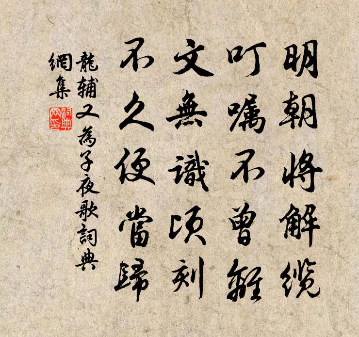 詩詞名句歷史字典書法欣賞書法字典國語詞典說文解字康熙字典古漢語字典標 題 作 者 詩 句 又為子夜歌作者:龍輔 朝代:宋代又為子夜歌原文明朝將解纜,叮囑不曾離。文無識頃刻,不久便當歸。詩詞問答問:又為子夜歌的作者是誰?答:龍輔問:又為子夜歌寫於哪個朝代?答:宋代龍輔又為子夜歌書法欣賞又為子夜歌書法作品詩詞推薦罷還邊將雍陶〔唐代〕白須虜將話邊事,自失公權怨語多。漢主豈勞思李牧,趙王猶是用廉頗。新鷹飽肉唯閒獵,舊劍生衣懶更磨。百戰維摩詰畫贊黃庭堅〔宋代〕維摩無病自灼灸,不二門開休闖首。文殊讚嘆辜負人,不如趙州放笤帚。不二法門無別路,諸方臨水不敢渡。鶖子十報恩 寧海長春庵主姜公,同眾道友憐予行馬鈺〔元代〕就福山來投,故作是詞以報焉青牛白鹿與黃羊。穩駕雲輿晝夜忙。運載乾坤常會合,推般日月永交光。 * 鄉*投旴士張季攜所注三略訪西山先生既跋其書余復劉克莊〔宋代〕千里從師細講評,橫渠昔亦謁高平。自從受得中庸了,止說西銘不說兵。失調名仲殊〔宋代〕玉線金針,千般聲笑,月下人家。登清音堂喻良能〔宋代〕堂上橫看江上洲,洲邊春浪拍天浮。晴欄倚遍無多景,浩蕩時時沒白鷗。賀新郎(憶別)姚勉〔宋代〕薄晚收殘暑。嘆西風、暗換流年,又還如許。鴉背斜陽初斂影,雲淡新涼天宇。人袖手、闌乾凝佇。鄰笛喚將鄉思西溪李商隱〔唐代〕悵望西溪水,潺湲奈爾何。不驚春物少,只覺夕陽多。色染妖韶柳,光含窈窕蘿。人間從到海,天上莫為河。鳳女寄鄭天谷白玉蟾〔宋代〕況此三晴二雨天,孤村寒綰纏蒼煙。客來長是有蝴蝶,春去不堪聞杜鵑。漢蕨可羹今已晚,胡麻未飯必須仙。九江魯港敗北汪元量〔宋代〕夜半槌金鼓,南邊事已休。三軍坑魯港,一舸走揚州。星殞天應泣,江喧地欲流。欺孤生異志,回首媿巢由。柬藏一儲泳〔宋代〕靈竺山前滿逕苔,遊春車馬可曾來。共君便欲攜尊去,一樹海棠花正開。和黃作霖白髮吳芾〔宋代〕白髮有公道,古來人盡然。我初未四十,霜雪已滿顛。黃子我同歲,比我還更賢。時命未遇合,退藏非自捐。不須登北邙還望京洛鄭世翼〔唐代〕步登北邙坂,踟躕聊寫望。宛洛盛皇居,規模窮大壯。三河分設險,兩崤資巨防。飛觀紫煙中,層台碧雲上。青槐歸鉛山正叔復用前韻和答之陳文蔚〔宋代〕斂藏先用肅如秋,次第陽和遍九州。歲月正緣閒里度,紛囂那得靜中游。明知與點有真樂,未足希顏卻自愁。諷詠維摩贊釋大觀〔宋代〕環堵室,十笏地。咄哉維摩,病在者里。過鄭山人所居劉長卿〔唐代〕寂寂孤鶯啼杏園,寥寥一犬吠桃源。落花芳草無尋處,萬壑千峰獨閉門。·220 ·送將官歐育之徐州蘇轍〔宋代〕輕衫駿馬走春風,未識彭城氣象雄。青山只在白門外,明月盡屬黃樓中。五斗濁醪消永日,一雙鳴鏑戲晴空。歸來落花三首廖行之〔宋代〕春深處處有花妍,已覺春工興浩然。投曉憑欄枝上看,飄零贏得舞容翩。讀張忠獻公謚冊感嘆楊萬里〔宋代〕恩視韓兼趙,名均獻與忠。禮中非不極,勛外若為同。三聖無多學,千年僅一翁。猶憐公議在,拼淚乞秋風。次韻子瞻和淵明擬古九首蘇轍〔宋代〕憂來感人心,悒悒久未和。呼兒具濁酒,酒酣起長歌。歌罷還獨舞,黍麥力誠多。憂長酒易消,脫去如風花。不悟名句推薦一簞食,一瓢飲,在陋巷,人不堪其憂,回也不改其樂。賢哉,回也!孔子弟子《論語·雍也篇》 蠻姜豆蔻相思味。算卻在、春風舌底。吳文英《杏花天·詠湯》 求得人間成小會,試把金尊傍菊叢。晏殊《破陣子·燕子欲歸時節》 縱浪大化中,不喜亦不懼。陶淵明《形影神三首》 不學問,無正義,以富利為隆,是俗人者也。荀子《荀子·儒效》 烈士暮年,壯心不已。曹操《龜雖壽》 昨夢西湖,老扁舟身世。吳文英《拜星月慢·林鐘羽姜石帚以盆蓮數十置中庭宴客其中》 春如舊。人空瘦。淚痕紅浥鮫綃透。陸游《釵頭鳳·紅酥手》 野雲萬里無城郭,雨雪紛紛連大漠。李頎《古從軍行》 天闕象緯逼,雲臥衣裳冷杜甫《游龍門奉先寺》