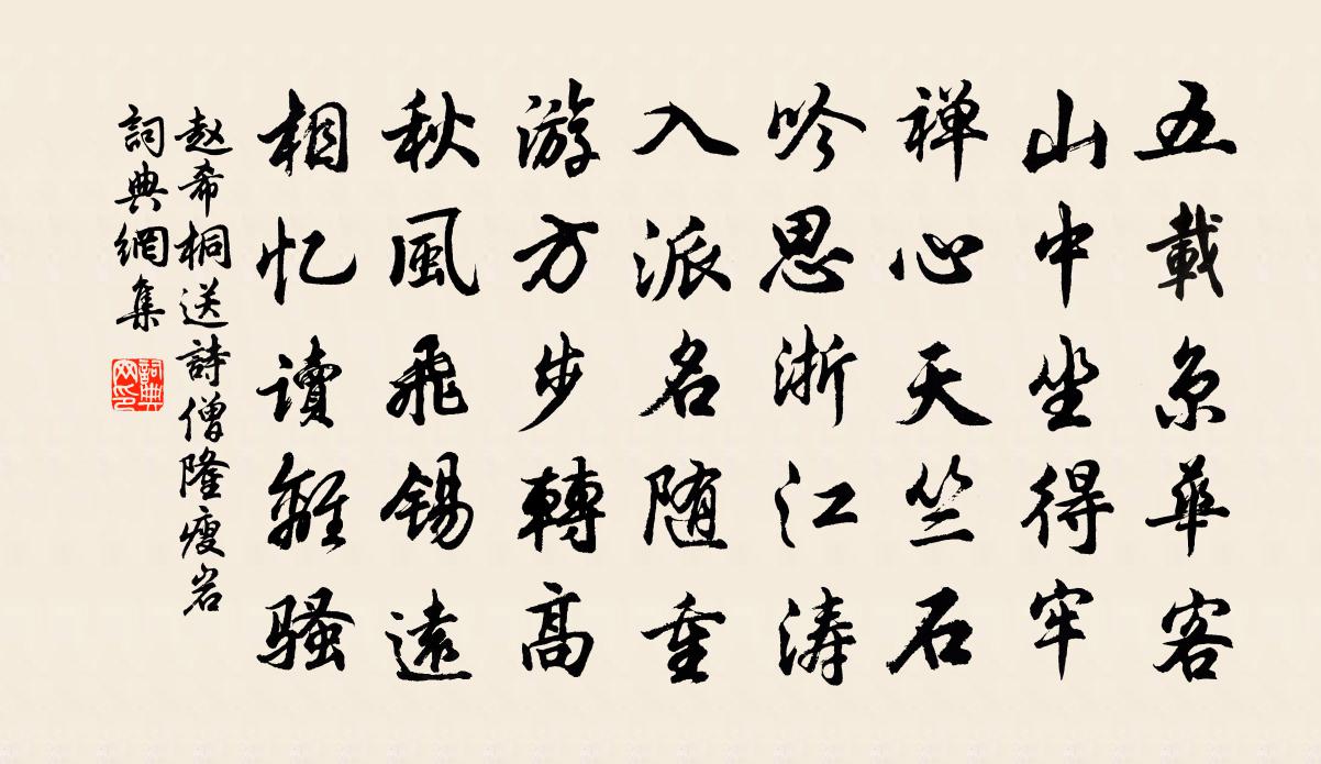 詩詞名句歷史字典書法欣賞書法字典國語詞典說文解字康熙字典古漢語字典標 題 作 者 詩 句 送詩僧隆瘦岩作者:趙希桐 朝代:宋代送詩僧隆瘦岩原文五載京華客,山中坐得牢。禪心天竺石,吟思浙江濤。入派名隨重,遊方步轉高。秋風飛錫遠,相憶讀離騷。詩詞問答問:送詩僧隆瘦岩的作者是誰?答:趙希桐問:送詩僧隆瘦岩寫於哪個朝代?答:宋代趙希桐送詩僧隆瘦岩書法欣賞送詩僧隆瘦岩書法作品詩詞推薦代劉勛妻王長雜詩曹植〔魏晉〕誰言去婦薄。去婦情更重。千里不唾井。況乃昔所奉。遠望未為遙。踟躕不得共。柳梢青姬翼〔元代〕明徹口頭三昧,拂跡便、忘言守拙。古道潛通,先賢冥會,太平時節。長安陌上縱橫,更不在、拈花摘葉。處處圓齊天樂(壽劉畊齊)劉學顏〔宋代〕紅岡小塔楓林路,曾見承平歌舞。舞罷人歸,月斜影轉,重見郎官星度。鄉關境土,又二十餘年,桑麻深露。說與菩薩蠻(十一之二)賀鑄〔宋代〕章台遊冶金龜婿。歸來猶帶醺醺醉。花漏怯春宵。雲屏無限嬌。絳紗燈影背。玉枕釵聲碎。不待宿酲銷。馬嘶催早憶江南 宿雙林禪院有感納蘭性德〔清代〕心灰盡,有發未全僧。風雨消磨生死別,似曾相識只孤檠,情在不能醒。搖落後,清吹那堪聽。淅瀝暗飄金井葉,崑崙兒張籍〔唐代〕崑崙家住海中州,蠻客將來漢地游。言語解教秦吉了,波濤初過鬱林洲。金環欲落曾穿耳,螺髻長卷不裹頭。自愛風入松張炎〔宋代〕此解,時至大庚戌七月也。滿頭風雪昔同游。同載月明舟。回來又續西湖夢,繞江南、那處無愁。贏得如今老大,與枯崖悟師胡仲弓〔宋代〕振錫歸來又許時,苔痕猶污坐禪衣。時非不定空懷古,慚愧高人蚤見幾。杏花天周密〔宋代〕金池瓊苑曾經醉。是多少、紅情綠意。東風一枕遊仙睡。換卻鶯花人世。漸暮色、鵑聲四起。正愁滿、香溝御水。督糧宿鹽州東李復〔宋代〕怒風吹雪急鞭馬,匪兕匪虎率曠野。護糧將軍夜不來,敦然獨宿在車下。夏人驕狃敢予侮,王師問罪在一舉。半歲偈頌六十五首釋普濟〔宋代〕淨法辦身,驢腮馬面。本無出沒,萬化千變。廬山行送行王冕〔元代〕廬山根盤幾百里,屏風九疊開畫圖。浮嵐吐秀挹南斗,黛色眇眇來青湖。山西石門翠如刷,山東石鏡大如月。三梁留贈偃師主人許渾〔唐代〕孤城漏未殘,徒侶拂征鞍。洛北去游遠,淮南歸夢闌。曉燈回壁暗,晴雪捲簾寒。強盡主人酒,出門行路難。西村晚泊林逋〔宋代〕弭棹危橋外,霜村乍夕陰。田園向野水,樵採語空林。白鳥歸飛遠,青山重複深。那堪遲新月,誰復賞微吟。辛未興龍節日懷歷陽王掾元胥賀鑄〔宋代〕昨歲東溪口,扁舟欲下江。伴愁燈映幔,欺睡月侵窗。漫寄書連紙,誰同酒一缸。何當見之子,聊使我心降。踏雲行劉處玄〔元代〕去歲周亭,今年重到。光陰似箭催人老。世空識破好休心,修行下手志宜早。不肯忘情,將來悔懊。松峰樂道隨緣代簡謝尹處初先生邵雍〔宋代〕樂國久容人避乖,非窩何以狀清懷。則予豈敢窺高躅,天險能升不用階。對月憶嵩陽故人施肩吾〔唐代〕團團月光照西壁,嵩陽故人千里隔。不知三十六峰前,定為何處峰前客。天平先隴道中,時將赴新安掾范成大〔宋代〕霜橋冰澗淨無塵,竹塢梅溪未放春。百疊海山鄉夢熟,三年江路旅愁生。松楸永寄孤窮淚,泉石終收漫浪身。好住紹興道者紹興朝士〔宋代〕萬里雲歸洞,千山水向東。玉爐香冷處,煙散碧霞中。名句推薦為地戰者不能成王,為祿仕者不能成政劉向《說苑·君道》 安民可與為義,而危民易與為非賈誼《過秦論》 伯牙鼓琴,志在高山佚名《伯牙鼓琴/伯牙絕弦》 莫道君行早,更有早行人。佚名《增廣賢文·上集》 若說沒奇緣,今生偏又遇著他,若說有奇緣,如何心事終虛化?曹雪芹《紅樓夢·第五回》 莫遣只輪歸海窟,仍留一箭射天山。李益《塞下曲》 清明時節雨紛紛,路上行人慾斷魂。杜牧《清明》 不似秋光,只與離人照斷腸。蘇軾《減字木蘭花·春月》 疏懶意何長,春風花草香。黃庭堅《菩薩蠻·半煙半雨溪橋畔》 城上春雲覆苑牆,江亭晚色靜年芳。杜甫《曲江對雨》