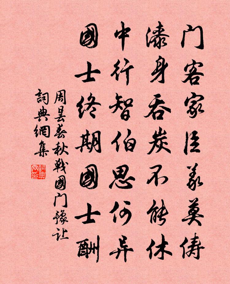詩詞名句歷史字典書法欣賞書法字典國語詞典說文解字康熙字典古漢語字典標 題 作 者 詩 句 春秋戰國門豫讓作者:周曇 朝代:唐代春秋戰國門豫讓原文門客家臣義莫儔,漆身吞炭不能休。中行智伯思何異,國士終期國士酬。詩詞問答問:春秋戰國門豫讓的作者是誰?答:周曇問:春秋戰國門豫讓寫於哪個朝代?答:唐代周曇春秋戰國門豫讓書法欣賞春秋戰國門豫讓書法作品注釋全唐詩:卷728-50詩詞推薦鄉中每以寒食立夏之間省墳客夔適逢此時悽然陸游〔宋代〕松陰系馬啟朱扉,粔籹青紅正此時。守墓萬家猶有日,及親三釜永無期。詩成謾寫天涯感,淚盡何由地下知。富貴又和三首嘆七十袁說友〔宋代〕人生自作難,百念一已多。七十古稀有,況此疾病何。紛紛老駘駑,失腳千丈坡。行樂當及茲,歲月如經過。送孔黨赴舉皇甫冉〔唐代〕入貢列諸生,詩書業早成。家承孔聖后,身有魯儒名。楚水通滎浦,春山擁漢京。愛君方弱冠,為賦少年行。送蔡山人高適〔唐代〕東山布衣明古今,自言獨未逢知音。識者閱見一生事,到處豁然千里心。看書學劍長辛苦,近日方思謁明主。斗酒壽廣東陶漕徐泳〔宋代〕古人風帽古人心,獨處胡床擁鼻吟。曾道先生清似水,東籬無惜種黃金。又代庠孫項安世〔宋代〕春風建鄴花如錦,社日秦淮酒似油。繡閣相傅住鍼線,高堂有喜送觥籌。兔經三夜光長好,燕入新年語不休。商略次韻趙克勤吏部六首劉克莊〔宋代〕有小林泉傍隱廬,無閒賓客訪村居。辛勤闢地添支徑,曲折通溪入淺渠。寶琴釋彪〔唐代〕吾有一寶琴,價重雙南金。刻作龍鳳象,彈為山水音。星從徽里發,風來弦上吟。鍾期不可遇,誰辨曲中心。春夜陸游〔宋代〕老憊生如寄,春寒夢亦孤。燈花時自墜,梟語迭相呼。萬里書難得,三年病未蘇。窗深不知曉,但覺動林烏。登台遇雨避於山亭晚霽乃歸陸游〔宋代〕溽暑不堪蝸舍陋,瘦藤扶我上危台。搏禽俊鶻橫空去,卷雨狂風掠野來。壯觀深知化工妙,幽尋卻蹋夕陽回。悠然僧惠白蓮李洪〔宋代〕逃暑追涼蔭碧蘿,清池咫尺阻經過。眼前喜見芬陀利,鼻觀重參乾闥婆。綽約漢宮黃傅額,依稀洛浦襪凌波。遠公謁金門辛棄疾〔宋代〕歸去未。風雨送春行李。一枕離愁頭澈尾。如何消遣是。遙想歸舟天際。綠鬢瓏璁慵理。好夢未成鶯喚起。粉香猶即事二首陳杰〔宋代〕慶曆殘碑倦復看,斯文豈是為游觀。一番棟宇開荒礎,萬古青螺點玉盤。鳥度雲移人事換,天高地大客愁寬。六絲先天易吟三十首方回〔宋代〕神農嘗毒藥,軒後設難經。認取卦中意,仁心救未形。和子瞻和陶淵明雜詩十一首蘇轍〔宋代〕大道如衣食,六經所耕桑。家傳易春秋,未易相秕糠。久種終不獲,歲晚嗟無糧。念此坐嘆息,追飛及頹陽。天公正蒙主文教授大著寵示佳章輒繼嚴韻仰酬盛意度正〔宋代〕眼空未可嘆賢無,瓦礫中間有寶珠。多謝三峨孕清淑,安排貢籍貢鴻儒。失調名佚名〔宋代〕問醉吟今夜,何處鳳樓偏好。寄外舅郭大夫陳師道〔宋代〕巴蜀通歸使,妻孥且舊居。深知報訊息,不忍問何如。身健何妨遠,情親未肯疏。功名欺老病,淚盡數行書。浣溪沙張元乾〔宋代〕一枕秋風兩處涼。雨聲初歇漏聲長。池塘零落藕花香。歸夢等閒歸燕去,斷腸分付斷雲行。畫屏今夜更思量。再和晁說之〔宋代〕須臾變物止樊蠅,宛轉迷人下馬陵。何處周公勤小物,幾時孔子又多能。堇荼自采還堪喜,菅蒯誰從便可憎。一到名句推薦山外青山樓外樓,西湖歌舞幾時休?林升《題臨安邸》 風摧寒棕響,月入霜閨悲。李白《獨不見》 憶年十五心尚孩,健如黃犢走復來。杜甫《百憂集行》 道吾好者是吾賊,道吾惡者是吾師。佚名《增廣賢文·上集》 朕以天下為憂,豈直一 方耶?脫脫《宋史·本紀·卷六》 綠桑高下映平川,賽罷田神笑語喧。歐陽修《田家》 風雨替花愁。風雨罷,花也應休。趙秉文《青杏兒·風雨替花愁》 國必有誹譽,忠臣令誹在己,譽在上。劉向《戰國策·東周·周文君免士工師藉》 蕭條庭院,又斜風細雨,重門須閉。李清照《念奴嬌·春情》 望斷金馬門,勞歌采樵路。孟浩然《田園作》