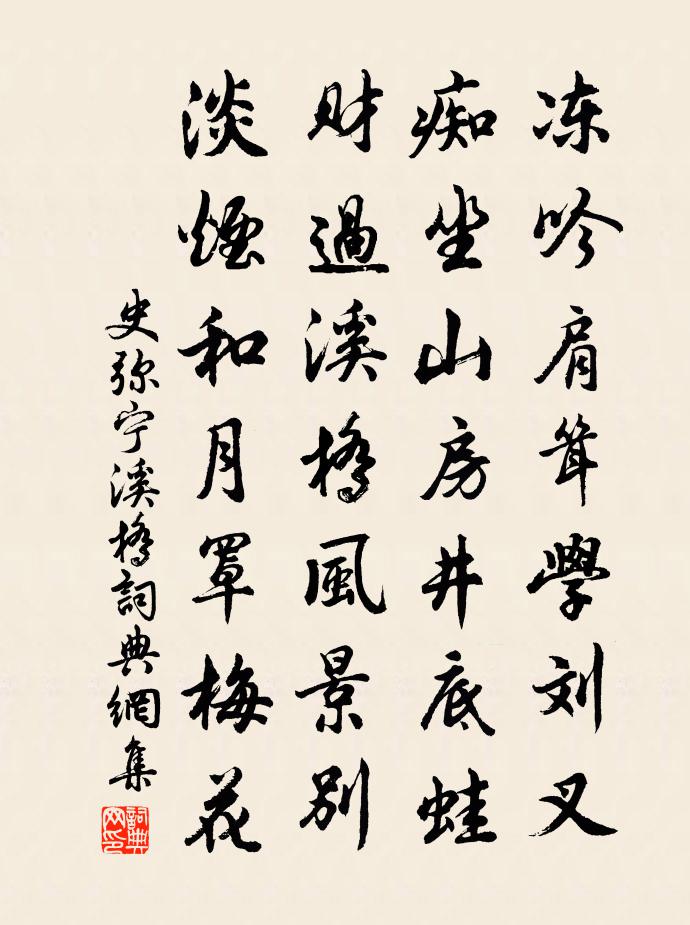 詩詞名句歷史字典書法欣賞書法字典國語詞典說文解字康熙字典古漢語字典標 題 作 者 詩 句 溪橋作者:史彌寧 朝代:宋代溪橋原文凍吟肩聳學劉叉,痴坐山房井底蛙。財過溪橋風景別,淡煙和月罩梅花。詩詞問答問:溪橋的作者是誰?答:史彌寧問:溪橋寫於哪個朝代?答:宋代史彌寧溪橋書法欣賞溪橋書法作品詩詞推薦十月二十二夜三更讀清波雜誌至五更方回〔宋代〕遠書答一封,近詩寫數首。小雨客不來,我亦厭奔走。茗罷午窗倦,草草具杯酒。獨酌政自佳,啖茹聊誑口。人生和程給事贈虞道判六首秦觀〔宋代〕漢武游心縹緲間,文成五利盡登壇。何如屈曲韓夫子,不羨神君白玉丹。減字木蘭花 化破帛王哲〔元代〕長居海畔。非帛衣身應不暖。海畔長居。漫燠凡軀性自如。於公願管。轉化多人為首贊。願管公於。養就仙胎得展思蒲塘文天祥〔宋代〕揚旌來冉冉,卷旆去堂堂。恨我飛無翼,思君濟有航。麒麟還共處,熊虎已何鄉。南國應無恙,中興事會長。次韻和薛端公歸故里之什二首魏野〔宋代〕茜旗影里椹袍身,迎入蒲津免問津。策蹇去時為舉子,乘驄歸日是功臣。豈同化鶴千餘歲,才過登龍十數春。開宴贈逸民詩 五蕭衍〔南北朝〕仁者博愛。大士兼撫。慈均春陽。澤若時雨。心忘分別。情無去取。等皆長養。同加嫗煦。譬流趨海。如子歸父。悲秋陸游〔宋代〕殘年孤寂不禁秋,醉自淒涼醒更愁。富貴空成守錢虜,吾今何止百宜休。夏日即事徐僑〔宋代〕桃藤上下蟻行暑,竹影浮沉龜蔭涼。步緩幽塘成小立,清風微度藕花香。唐辰臘八日大雪二首張耒〔宋代〕平生臘八日,借缽受齋糜。客路歲將晚,旅庖晨不炊。持杯從破律,遣興自吟詩。何日依禪宿,鍾魚自有時。石橋趙汝愚〔宋代〕法身遍滿三千界,影現天台水石間。我欲直從心地見,來看磊磈聽淙潺。雜曲歌辭。妾薄命武平一〔唐代〕有女妖且麗,裴回湘水湄。水湄蘭杜芳,采之將寄誰。瓠犀發皓齒,雙蛾顰翠眉。紅臉如開蓮,素膚若凝脂。綽約枕簟入林僻花瓜留客遲十韻葉茵〔宋代〕叩門真丈夫,一揖棄拘檢。人物晉風流,班坐黃玉簟。題玉澗八景八首王柏〔宋代〕居淡經營中,落筆景已換。不見片帆歸,危檣還泊岸。送水雲歸吳何鳳儀〔宋代〕十年燕客身如病,一曲剡溪心不競。憑君寄語愛梅仙,天理現時人事盡。阮步兵廟李廌〔宋代〕千齡一丘壠,誰復記主名。苾芬百世祠,賢哉阮步兵。廟旁故墟里,竹林蔽郊垧。裔孫仍南北,胡能師九原。贈文士王雄鄭谷〔唐代〕知己竟何人,哀君尚苦辛。圖書長在手,文學老於身。公道天難廢,貞姿世任嗔。小齋松菊靜,願卜子為鄰。題棲雲寺立上人院李頻〔唐代〕是法從生有,修持歷劫塵。獨居岩下室,長似定中身。樹老風終夜,山寒雪見春。不知諸祖後,傳印是何人。贈孫百篇方乾〔唐代〕御題百首思縱橫,半日功夫舉世名。羽翼便從吟處出,珠璣續向筆頭生。莫嫌黃綬官資小,必料青雲道路平。才子草蟲佚名〔先秦〕喓喓草蟲,趯趯阜螽。未見君子,憂心忡忡。亦既見止,亦既覯止,我心則降。陟彼南山,言采其蕨。未見君子,官舍偶書趙湘〔唐代〕病枕方行藥,公門似隱居。孤煙寄庭木,微雨長秋蔬,宦薄慚騎馬,山高夢結廬。期僧仍未至,慵寫與人書。名句推薦欸乃一聲山水綠。回看天際下中流,岩上無心雲相逐柳宗元《漁翁》 野幕敞瓊筵,羌戎賀勞旋。盧綸《和張僕射塞下曲·其四》 春風一夜吹鄉夢,又逐春風到洛城。武元衡《春興》 多君相門女,學道愛神仙李白《送內尋廬山女道士李騰空二首》 邊蛇口中草,蠍子尾後針。馮夢龍《警世通言·卷二十五》 講性命之學者,不可無經濟之才。王永彬《圍爐夜話·第二六則》 悲霜雪之俱下兮,聽潮水之相擊。屈原《九章》 綺席象床寒玉枕,美人何處醉黃花。汪元量《望江南·幽州九日》 居上不驕,為下不倍。國有道,其言足以興;國無道,其默足以容。子思《中庸·第二十七章》 何事東君,解將芳思,巧綴一斛春冰。朱晞顏《一萼紅·盆梅》