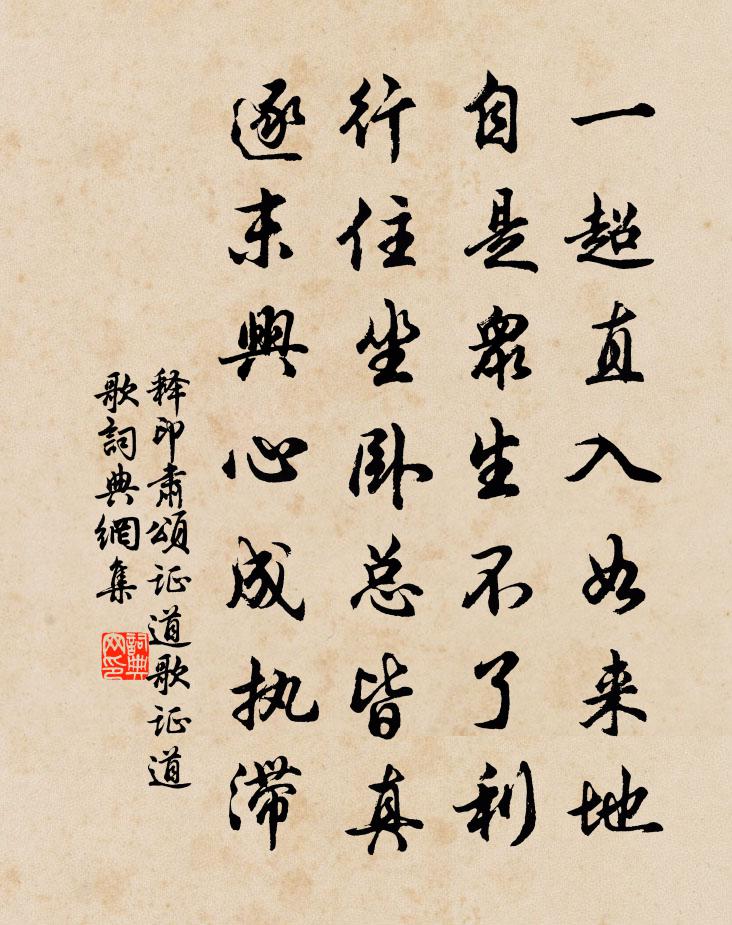 詩詞名句歷史字典書法欣賞書法字典國語詞典說文解字康熙字典古漢語字典標 題 作 者 詩 句 頌證道歌證道歌作者:釋印肅 朝代:宋代頌證道歌證道歌原文一超直入如來地,自是眾生不了利。行住坐臥總皆真,逐末興心成執滯。詩詞問答問:頌證道歌證道歌的作者是誰?答:釋印肅問:頌證道歌證道歌寫於哪個朝代?答:宋代釋印肅頌證道歌證道歌書法欣賞頌證道歌證道歌書法作品詩詞推薦宮怨胡仲參〔宋代〕淚粉羞臨寶鑑前,淡妝爭似舊嬋娟。一言曾忤君王意,閉在長門十五年。枕上和圓機絕句梅花十有四首晁說之〔宋代〕莫道梅花取次開,馨香須侍百層台。不同碧玉小家女,寶策皇妃元姓梅。春日田園雜興劉汝鈞〔宋代〕年來夢斷百花場,安分農桑萬慮降。為喜麥青行暖逕,因看蠶出倚晴窗。草坪閒見烏犍點,畲水飛來白鷺雙。滿飲仙鄉子侯善淵〔元代〕易*自然軒。軒外清華混物鮮。秀嶺連雲飛宇角,靈泉。柳岸煙波接遠川。德士隱幽玄。玄覽滌除物自捐。內適虛茶湯會求頌釋崇岳〔宋代〕春風吹落碧桃花,一片流經十萬家。何似飛來峰下寺,相邀來吃趙州茶。送蘇處士歸西山項斯〔唐代〕南遊何所為,一篋又空歸。守道安清世,無心換白衣。深林蟬噪暮,絕頂客來稀。早晚重相見,論詩更及微。雨中作陸游〔宋代〕三日雨頻作,昏昏饒睡眠。泥深散酒市,風惡惱燈天。茅屋松明照,茶鐺雪水煎。山家自成趣,撫枕寄悠然。秋夜感遇十首以孤村一犬吠殘月幾人行為韻陸游〔宋代〕畏首復畏尾,吾身其餘幾?雖雲食不足,健決豈不偉。蓬窗對親舊,情話來亹亹。何以永今朝,沽酒刺圈豨。宿集慶寺仇遠〔宋代〕半生三宿此招提,眼底交遊更有誰?顧愷漫留金粟影,杜陵忍賦玉華詩。旋烹紫筍猶含籜,自摘青茶未展旗。聽徹席上如統制傅公韻陳天麟〔宋代〕遲遲春永晝如年,芳草池塘屬惠連。一笑誰雲今易得,四並須信古難全。山圍錦繡將軍樹,雲遏笙歌刺史天。不向晚晴又賦方回〔宋代〕疾風吹怒雨,天地閉青春。眼忽驚晴色,心如見故人。遷鶯元未老,戰馬漸無塵。黃鶴樓前路,輕帆好問津。月下笛(次韻)曾允元〔宋代〕又老楊花,浮萍點點,一溪春色。閒尋舊跡。認溪頭、浣紗磧。柔條折盡成輕別,向空外、瑤簪一擲。算無情更苦次韻張鵬飛三絕方回〔宋代〕雪天人品最高者,蓑笠江乾一釣竿。才有侍兒焉識此,黨暉陶谷總酸寒。直廬閒二首程珌〔宋代〕紫宸朝退曉光寒,百吏奔曹一吏閒。便可雲卿稱散秩,柰何名籍尚人間。橫江詞其一李白〔唐代〕人道橫江好,儂道橫江惡。一風三日吹倒山,白浪高於瓦官閣。浣溪沙莫將〔宋代〕歸夢悠揚見未真。繡衾恰有暗香薰。五更分得楚台春。春光好(感舊)曾覿〔宋代〕心下事,不思量。自難忘。花底夢回春漠漠,恨偏長。閒日多少韶光。雕闌靜、芳草池塘。風急落紅留不住,又斜句楊長孺〔宋代〕過眼一春春又夏,開殘芍藥更無花。贈元運使王之望〔宋代〕使節東來炯繡衣,蒙泉景色動旌旗。官曹傳檄清風肅,老稚隨車淑氣移。趙日可能兼畏愛,蘇夫那復間公私。鴒原采菽佚名〔先秦〕采菽采菽,筐之莒之。君子來朝,何錫予之?雖無予之?路車乘馬。又何予之?玄袞及黼。觱沸檻泉,言采其芹。名句推薦讀書志在聖賢,非徒科第;為官心存君國,豈計身家?朱柏廬《朱子家訓·全文》 壯志飢餐胡虜肉,笑談渴飲匈奴血。岳飛《滿江紅·寫懷》 穠艷一枝細看取,芳心千重似束。蘇軾《賀新郎·夏景》 君問歸期未有期,巴山夜雨漲秋池。李商隱《夜雨寄北》 喧鳥覆春洲,雜英滿芳甸。謝朓《晚登三山還望京邑》 故人宿茅宇,夕鳥栖楊園。李白《之廣陵宿常二南郭幽居》 經師易求,人師難得。令狐德棻《周書·列傳·卷四十五》 日中則移,月滿則虧。劉向《戰國策·秦三·蔡澤見逐於趙》 舟非水不行,水入舟則沒佚名《孔子家語·六本》 初報邊烽照石頭,旋聞胡馬集瓜州。陸游《送七兄赴揚州帥幕》