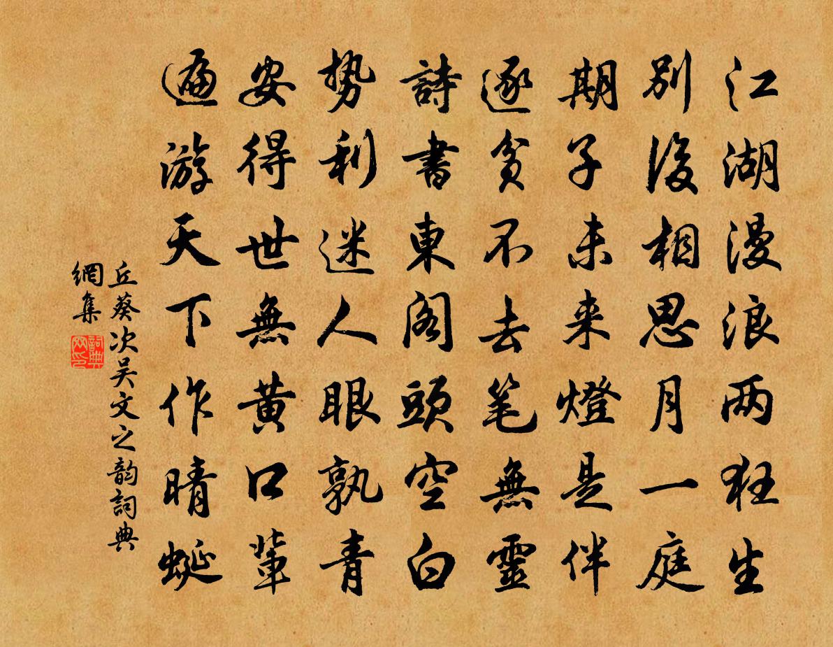 詩詞名句歷史字典書法欣賞書法字典國語詞典說文解字康熙字典古漢語字典標 題 作 者 詩 句 次吳文之韻作者:丘葵 朝代:宋代次吳文之韻原文江湖漫浪兩狂生,別後相思月一庭。期子未來燈是伴,逐貧不去筆無靈。詩書東閣頭空白,勢利迷人眼孰青。安得世無黃口輩,遍游天下作晴蜓。詩詞問答問:次吳文之韻的作者是誰?答:丘葵問:次吳文之韻寫於哪個朝代?答:宋代丘葵次吳文之韻書法欣賞次吳文之韻書法作品詩詞推薦與叔驥父子別後悵然懷之三首趙蕃〔宋代〕遠齋老於文,立語更造極。為我寄竹隱,深意遺筆墨。向來說山林,俗眼多見白。是公不吾呵,可謂計之得。送蔣推官歸宜興王洋〔宋代〕陽羨溪頭蟹正肥,三年客盡拂征衣。一川秋色背人去,滿路黃花迎子歸。未用解裝榮故里,少須通籍扣天扉。紅妝奉和聖制送鄧王牧宣城湯悅〔唐代〕千里陵陽同陝服,鑿門胙土寄親賢。曙煙已別黃金殿,晚照重登白玉筵。江上浮光宜雨後,郡中遠岫列窗前。天心宋人及楚人平公羊高〔先秦〕外平不書,此何以書?大其平乎己也。何大其平乎己?莊王圍宋,軍有七日之糧爾!盡此不勝,將去而歸爾。於是四月九日幽谷見緋桃盛開歐陽修〔宋代〕經年種花滿幽谷,花開不暇把一卮。人生此事尚難必,況欲功名花鼎彝。深紅淺紫看雖好,顏色不柰東風吹。緋桃權勢張耒〔宋代〕權勢世所重,桓溫役孟嘉。桓公自人雄,為下未足嗟。頗怪蔡中郎,為董受疵瑕。因之以取死,曾不念漢家。士固從軍行張玉孃〔宋代〕二十遴戲勇,從軍事北荒。流星飛玉彈,寶劍落秋霜。書角吹楊柳,金山險馬當。長驅空朔漠,馳捷報明王。題錢可則芡雪庵高斯得〔宋代〕我家雪山下,結茅幾度秋。一朝劫火燎,身墮江南州。相逢芡雪君,感慨不能休。我今如喪狗,狂走長包羞。子幸西軒秋日文同〔宋代〕官舍蕭然似隱居,一軒秋色伴恬如。深藏宿雨樹木暗,高灑夕陽籬落疏。景物靜思臨水石,光陰閒覺入圖書。此心徐審知置酒會者三人以為此春酒以介眉壽分韻趙蕃〔宋代〕紛紛春來華,渺渺動行邁。浮川向吳會,走陸轉江介。酒勤三酹爵,禮重百其拜。既慰推遷悲,亦勞驅馳債。和高二偶作長句晁說之〔宋代〕流落歸來少故人,婆娑白髮強容身。雷霆能斷王敦首,宇宙猶多庾亮塵。以國與盟非所志,在邊不戰豈其仁。兼資南鄉子晏幾道〔宋代〕眼約也應虛。昨夜歸來鳳枕孤。且據如今情分里,相於。只恐多時不似初。深意托雙魚。小翦蠻箋細字書。更把此破陣子陸游〔宋代〕仕至千鍾良易,年過七十常稀。眼底榮華元是夢,身後聲名不自知。營營端為誰。幸有旗亭沽酒,何妨繭紙題詩。聞鳩有作喜為晴兆也是日開霽又喜其占之有驗舒岳祥〔宋代〕雨久成淫昏,新晴如改過。漸向東皋耕,還思北窗臥。昏眼喜天晴,觀書驚學大。流泉出淈泥,輕風不場堁。歸途閒居對雨詩陰鏗〔南北朝〕四溟飛旦雨。三徑絕來游。震位雷聲發。離宮電影浮。山雲遙似帶。庭葉近成舟。茅檐下亂滴。石竇引環流。寄言懷梅水村十絕用張小山韻趙必象〔宋代〕暮秋已誤張郎約,冬暮歸期又未成。趁取歲前到家好,春來怕有杜鵑聲。晚出伊闕寄河南裴中丞陶翰〔唐代〕退無偃息資,進無當代策。冉冉時將暮,坐為周南客。前登闕塞門,永眺伊城陌。長川黯已空,千里寒氣白。家本秋日登吳公台上寺遠眺劉長卿〔唐代〕古台搖落後,秋日望鄉心。野寺來人少,雲端隔水深。夕陽依舊壘,寒磬滿空林。惆悵南朝事,長江獨自今。風流子秦觀〔宋代〕新陽上簾幌,東風轉,又是一年華。正駝褐寒侵,燕釵春裊。句翻詞客,簪斗宮娃。堪娛處,林鶯啼暖樹,渚鴨睡步虛詞(太清宮作)顧況〔唐代〕迥步游三洞,清心禮七真。飛符超羽翼,焚火醮星辰。殘藥沾雞犬,靈香出鳳麟。壺中無窄處,願得一容身。名句推薦人煙寒橘柚,秋色老梧桐。李白《秋登宣城謝朓北樓》 實無有法佛得阿耨多羅三藐三菩提。鳩摩羅什譯《金剛經·究竟無我》 野客預知農事好,三冬瑞雪未全消。戴復古《除夜》 相思無因見,悵望涼風前。李白《折荷有贈》 彼竊鉤者誅,竊國者為諸侯,諸侯之門而仁義存焉莊子《莊子·外篇·胠篋》 停車坐愛楓林晚,霜葉紅於二月花。杜牧《山行》 盤饈蒟醬實,歌雜竹枝辭司馬光《送張寺丞覲知富順監》 天子居未央,妾侍卷衣裳。李白《秦女卷衣》 海闊山遙,未知何處是瀟湘柳永《玉蝴蝶·望處雨收雲斷》 素娥無賴,西去曾不為人留。蘇轍《水調歌頭·徐州中秋》