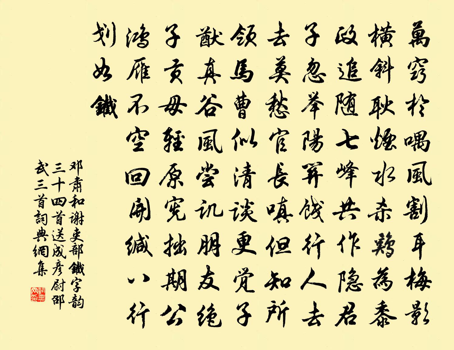 詩詞名句歷史字典書法欣賞書法字典國語詞典說文解字康熙字典古漢語字典標 題 作 者 詩 句 和謝吏部鐵字韻三十四首送成彥尉邵武三首作者:鄧肅 朝代:宋代原文萬竅於喁風割耳,梅影橫斜耿煙水。殺雞為黍政追隨,七峰共作隱君子。忽舉陽關餞行人,去去莫愁官長嗔。但知所領馬曹似,清談更覺子猷真。谷風嘗譏朋友絕,子貢毋輕原憲拙。期公鴻雁不空回,開緘八行劃如鐵。詩詞問答問:《和謝吏部鐵字韻三十四首送成彥尉邵武三首》的作者是誰?答:鄧肅問:該詩寫於哪個朝代?答:宋代書法欣賞和謝吏部鐵字韻三十四首送成彥尉邵武三首書法作品詩詞推薦置酒簽廳觀荷徐判官攜家釀四首曾幾〔宋代〕白日紅紅花映階,高高下下葉成杯。嬌嬈似不禁長夏,故就團圞扇影來。金陵雜興二百首蘇泂〔宋代〕小蓋高肩翼蔽無,鐘山寺里換籃輿。相逢舉止無羞澀,一段風流似上都。晚寄張十八助教周郎博士(張籍、周況也)韓愈〔唐代〕日薄風景曠,出歸偃前檐。晴雲如擘絮,新月似磨鐮。田野興偶動,衣冠情久厭。吾生可攜手,嘆息歲將淹。傷足邵雍〔宋代〕災由無妄得,為患固非深。乖已攝生理,貽親憂慮心。乍然艱步履,偶爾阻登臨。逾月方能出,難忘樂正箴。題五牧蔣氏所藏閻次平小景仇遠〔宋代〕綠蕪紅葉照秋明,白雁孤飛我獨行。誰識草堂窮杜老,江南江北正關情。行路難錢起〔唐代〕君不見明星映空月,太陽朝升光盡歇。君不見凋零委路蓬,長風飄舉入雲中。由來人事何嘗定,且莫驕奢笑賤窮。越問封疆孫因〔宋代〕九州皆有山鎮兮,職方氏獨先會稽。射祥光於斗分兮,占星紀於天倪。牽牛炳其初躔兮,屆須女之七度。少陽當其晦日陪侍御泛北池岑參〔唐代〕春池滿復寬,晦節耐邀歡。月帶蝦蟆冷,霜隨獬豸寒。水雲低錦席,岸柳拂金盤。日暮舟中散,都人夾道看。【中呂】朝天曲_沛公,大風薛昂夫〔元代〕沛公,大風,也得文章用。卻教猛士嘆良弓,多了游雲夢。駕馭英雄,能擒能縱,無人出彀中。後宮,外宗,險把僧問緣生義釋重顯〔宋代〕義列緣生笑未聞,孰呈布鼓向雷門。金剛鐵券諸方問,報導三千海岳昏。對花秦韜玉〔唐代〕長與韶光暗有期,可憐蜂蝶卻先知。誰家促席臨低樹,何處橫釵戴小枝。麗日多情疑曲照,和風得路合偏吹。向人絕句葉元素〔宋代〕家住夕陽江上村,一灣流水護柴門。種來松樹高於屋,借與春禽養子孫。初下漢江,舟中作,寄兩省給舍白居易〔唐代〕秋水淅紅粒,朝煙烹白鱗。一食飽至夜,一臥安達晨。晨無朝謁勞,夜無直宿勤。不知兩掖客,何似扁舟人?尚想括蒼溪漲樓鑰〔宋代〕雨余大溪觸山流,氣勢直欲凌沙洲。浮梁中分斷螮蝀,流沫更去行蛟虬。人家嘈嘈避新漲,雲稼苒苒添平疇。漁翁楊梅袁說友〔宋代〕酒著圓腮重,珠聯細葉芳。絳紗籠密顆,朱粉皺新妝。色漬桑間椹,甘傅荔子漿。輕酸認梅種,草木有他楊。紙合午睡陸游〔宋代〕黃紬被暖青氈穩,紙合油窗晚更妍。一飽無營睡終日,自疑身在結繩前。句釋方會〔宋代〕漁翁未擲釣,躍鱗衝浪來。太白峰舒坦〔宋代〕千峰下視盡兒孫,仙事寥寥不可聞。長作人間三月雨,請看膚寸嶺頭雲。靈照女贊釋子益〔宋代〕家業盡拋離,沿街賣笊籬。胸中無限意,不許老龐知。九華山郭夔〔唐代〕岩翠凌雲出迥然,岧嶢萬丈倚秋天。暮風飄送當軒色,曉霧斜飛入檻煙。簾卷倚屏雙影聚,鏡開朱戶九條懸。畫圖名句推薦天意憐幽草,人間重晚晴。李商隱《晚晴》 朔風萬里入衣多,嘹嚦寒空一雁過。石茂華《九月九日登長城關》 亭皋木葉下,隴首秋雲飛柳惲《搗衣詩》 翠輦不來金殿閉,宮鶯銜出上陽花雍陶《天津橋望春》 馬行無力皆因瘦,人不風流只為貧。佚名《增廣賢文·上集》 余亦赴京國,何當獻凱還。孟浩然《送陳七赴西軍》 來掃千山雪,歸留萬國花。袁枚《春風》 胡雁哀鳴夜夜飛,胡兒眼淚雙雙落。李頎《古從軍行》 不鏡於水,而鏡於人,則吉凶可鑑也王永彬《圍爐夜話·第五二則》 年年遊子惜余春,春歸不解招遊子。賀鑄《惜余春·急雨收春》