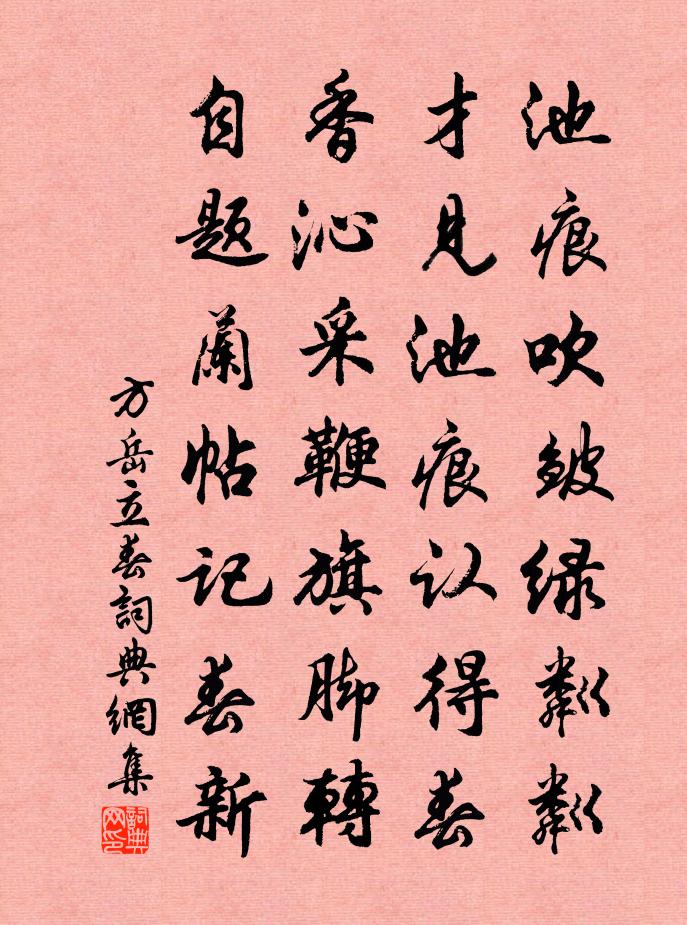 詩詞名句歷史字典書法欣賞書法字典國語詞典說文解字康熙字典古漢語字典標 題 作 者 詩 句 立春作者:方岳 朝代:宋代立春原文池痕吹皺綠粼粼,才見池痕認得春。香沁采鞭旗腳轉,自題蘭帖記春新。詩詞問答問:立春的作者是誰?答:方岳問:立春寫於哪個朝代?答:宋代方岳立春書法欣賞立春書法作品詩詞推薦登石閣吟邵雍〔宋代〕一般情意惡難羈,長怕登高望遠時。今日憑欄異常日,幾回將下又遲遲。京居感興五首賀鑄〔宋代〕壯圖可復道,罄折營五斗。負郭二頃田,何時落吾手。諸葛鹽井蘇軾〔宋代〕五行水本鹹,安擇江與井?如何不相入,此意誰復省。人心固難足,物理偶相逞。猶嫌取未多,井上無閉綆。醉蓬萊(丙申自壽)程珌〔宋代〕記蟾宮桂子,撒向人間,如今時候。□□□□,□□□□□。白下長乾,亂灘橫笛,想昔游依舊。大海一漚,千年藤簟釋亮〔宋代〕江成一片凝如水,風吹不動寒光起。飯飽齁齁快活眠,不知身在秋婆里。淳熙丙申二月晦翁歸婺源先曾大父因隨杖屨遂吳龍翰〔宋代〕吾祖曾師雲谷仙,讀書直下悟蹄筌。道參太極本無極,易論先天與後天。綠遍春風窗外草,香浮夜月沼中蓮。派分書悲陸游〔宋代〕今日我復悲,堅臥腳踏壁。古來共一死,何至爾寂寂!秋風兩京道,上有胡馬跡。和戎壯士廢,憂國清淚滴。關河書懷二絕句晁說之〔宋代〕古木江亭懶不開,書空自笑興悠哉。蒼台一徑淺深遍,知道無人向此來。湖州歌九十八首 其六十五汪元量〔宋代〕日中轉柁到河間,萬里羈人強自寬。此夜此歌如此酒,長安月色好誰看。書事趙蕃〔宋代〕貧非事烹煎,病止治藥物。烏薪鬻之市,束縛論寸尺。煙浮多稚松,質重非老櫟。熾焰忽復然,寒灰已成積。十月四日夜記夢陸游〔宋代〕四客聯轡來,我醉久不知;倒衣出迎客,媿謝前致辭。客意極疏豁,大笑軒鬚眉。禮豈為我設,度外以相期。袞袞初復即事楊萬里〔宋代〕今日風光定自佳,不寒不熱恰清和。百年人世行樂耳,一歲春皈奈老何。苟藥晚花終是小,戎蔡新菡許來多。俸錢首尾吟邵雍〔宋代〕堯夫非是愛吟詩,詩是堯夫相度時。合放手時須放手,得開眉處且開眉。狂情多見好人喜,僻性少為他物移。只恨月海遠上人遊方過靈隱薛嵎〔宋代〕一點靈光在,月生滄海深。此中難著語,何處可相尋。野寺廟無定,窮冬日易陰。聽松行九里,卻坐冷泉吟。仲秋書事陸游〔宋代〕客來深媿里閭情,近為衰殘罷送迎。旋置風爐煎顧渚,劇談猶得慰平生。句楊億〔宋代〕眼中人是面前人。關榆漸落邊鴻過,誰勸劉郎酒十分。句董穎〔宋代〕雲壑釀成千嶂雨,風苹吹老一汀秋。寄吳茂遠樂雷發〔宋代〕蘇公堤畔系吟驢,知在垂楊第幾株。學校文章如畫餅,朝廷官爵似呼盧。春吟應欠梅花在,時事曾言楮幣無。惆悵東湖陶弼〔宋代〕寧越佳山水,東湖帶郡城。月天高寺影,春雨一橋聲。石上青蒲合,沙中白鳥橫。天涯睚寥落,獨往若為情。堂堂李賀〔唐代〕堂堂復堂堂,紅脫梅灰香。十年粉蠹生畫梁,飢蟲不食摧碎黃。蕙花已老桃葉長,禁院懸簾隔御光。華清源中礬石名句推薦浮雲暮南征,可望不可攀。杜甫《前出塞九首》 馬穿山徑菊初黃,信馬悠悠野興長。王禹偁《村行·馬穿山徑菊初黃》 嘆息此人去,蕭條徐泗空李白《經下邳圯橋懷張子房》 靜女其孌,貽我彤管。佚名《靜女》 無情明月,有情歸夢,同到幽閨。劉基《眼兒媚·秋思》 攜來百侶曾游,憶往昔崢嶸歲月稠。 * 《沁園春·長沙》 蓮渚收香,蘭皋浮爽,涼思頓欺班扇。王月山《齊天樂·夜來疏雨鳴金井》 江間波浪兼天涌,塞上風雲接地陰。杜甫《秋興八首·其一》 山際見來煙,竹中窺落日。吳均《山中雜詩》 鳥下綠蕪秦苑夕,蟬鳴黃葉漢宮秋。許渾《鹹陽城東樓 / 鹹陽城西樓晚眺 / 西門》