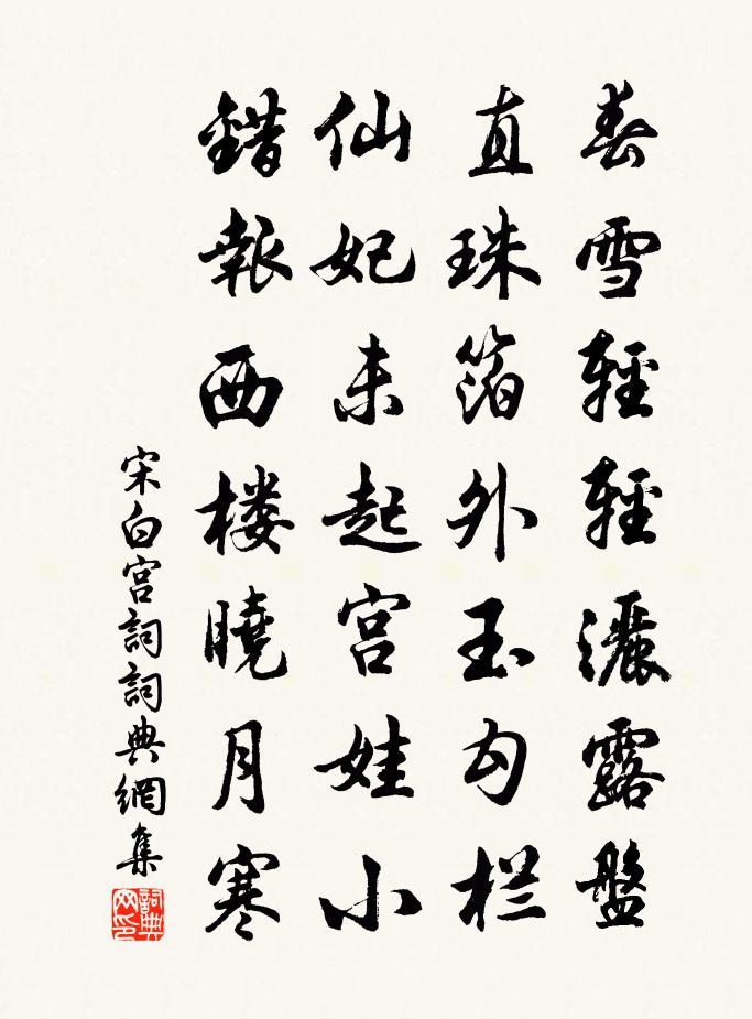詩詞名句歷史字典書法欣賞書法字典國語詞典說文解字康熙字典古漢語字典標 題 作 者 詩 句 宮詞作者:宋白 朝代:宋代宮詞原文春雪輕輕灑露盤,直珠箔外玉勾欄。仙妃未起宮娃小,錯報西樓曉月寒。詩詞問答問:宮詞的作者是誰?答:宋白問:宮詞寫於哪個朝代?答:宋代宋白宮詞書法欣賞宮詞書法作品詩詞推薦烏息隱山堂覓詩洪咨夔〔宋代〕未出為遠志,出則為小草。請看耆闍窟,幾年黃面老。瞿塘、巫峽張問陶〔清代〕瞿塘蟠大壁,巫峽削千峰。處處奇相敵,山山妙不重。詩隨林壑變,天辟畫圖濃。何日真游遍,穿雲策短筇?柳梢青 送盧梅坡劉過〔宋代〕泛菊杯深,吹梅角遠,同在京城。聚散匆匆,雲邊孤雁,水上浮萍。教人怎不傷情。覺幾度、魂飛夢驚。後夜相思達磨贊釋紹曇〔宋代〕遠泛鯨波入大唐,廓然無聖觸梁王。九年冷坐精靈窟,怕見嵩山下雪霜。句楊億〔宋代〕巍巍百尺樓上槐,來樓清密葉已繁。下第薛嵎〔宋代〕寸晷場中較尺尋,榮親無路淚盈襟。一貧誰過簞瓢巷,百口難寬兒女心。昨夢重圓知誤喜,平生失計為工吟。近來送張升甫三十韻強至〔宋代〕歲餘客秦雍,處俗失大方。眼前紛朋游,外同異中腸。最得張子晚,一見合柔剛。拜我十年兄,本非以其長。直緣自彭蠡湖初入江張九齡〔唐代〕江岫殊空闊,雲煙處處浮。上來群噪鳥,中去獨行舟。牢落誰相顧,逶迤日自愁。更將心問影,於役復何求。浣溪沙·一曲新詞酒一杯晏殊〔宋代〕一曲新詞酒一杯,去年天氣舊亭台,[1]夕陽西下幾時回。無可奈何花落去,似曾相識燕歸來。小園香徑獨徘徊雜詩二十七首曹勛〔宋代〕淅淅西風入小樓,樓中聽徹玉笙秋。不妨青竹搖殘夢,甚怯新涼攪客愁。送蔡子奇節推之官廬陵方岳〔宋代〕春不多寒風已柔,數君到日正紅稠。庵藏澹叟詩成集,山護醉翁書滿樓。岸柳欲眠維鷁首,幕蓮俱起看鰲頭。無忘涪江風月鮮于侁〔宋代〕涪江風月為誰清,莫向涪翁問姓名。萬古涪江流不盡,漁磯月似舊時明。和曾谹父雨中詩王洋〔宋代〕往年茅屋水,痕過一由旬。人論主宜夏,心驚已畏春。花光如勸酒,山色獨談真。補拙供吟課,聊開一笑頻。雨望方岳〔宋代〕前溪雨埋村,咫尺不我過。雷霆但濛鴻,林莽亦掀簸。竟微一飄灑,起此北窗臥。對面自胡越,孰為天宇大。得非憶友人虞儔〔宋代〕紫鸞棲棘乳溪邊,不羨群飛漫刺天。一見交情真我輩,更將詩句洗塵緣。寧唯刮目須三日,恨不從公蚤十年。只恐乍歸九首劉克莊〔宋代〕弛檐逢除夕,檀欒共擁爐。把如為客看,還得似家無。昌化道中方回〔宋代〕縣街長五里,當路臥耕牛。民戶時常閉,官征瑣屑收。永無燈火市,況有管弦樓。崖石偏欺馬,湍溪不受舟。葷羶次韻受益苦雨二首方回〔宋代〕甘澤關民命,隨時不在多。滴穿檐下石,爛倒水中荷。天有凶荒歲,人無政事科。誠心能撫字,乖氣轉為和。送呈班叔大名司戶司馬光〔宋代〕元宰司官鑰,旌旄太大河。敢言趨府倦,私嘆折腰多。機發何妨避,光塵未免和。艱難方遠到,慶閥肯蹉跎。再次交代韻四首陳造〔宋代〕詩人妙思天同巧,鬼守玄關不及扃。閒挹山光誦奇語,斷無塵滓溷襟靈。名句推薦入苑白泱泱,宮人正靨黃。李賀《同沈駙馬賦得御溝水》 過眼年華,動人幽意,相逢幾番春換。王沂孫《法曲獻仙音·聚景亭梅次草窗韻》 雪滿山中高士臥,月明林下美人來。高啟《詠梅九首》 青海陣雲匝,黑山兵氣沖。高適《塞下曲》 唯仁者能好人,能惡人。孔子弟子《論語·雍也篇》 青山欲共高人語。聯翩萬馬來無數。辛棄疾《菩薩蠻·金陵賞心亭為葉丞相賦》 教人無處寄相思,落花芳草過前期,沒人知。孫光憲《虞美人·好風微揭簾旌起》 衙齋臥聽蕭蕭竹,疑是民間疾苦聲。鄭燮《濰縣署中畫竹呈年伯包大中丞括 / 墨竹圖題詩》 論至德者不和於俗,成大功者不謀於眾。司馬遷《史記·趙世家》 醉中渾不記,歸路月黃昏辛棄疾《臨江仙·探梅》