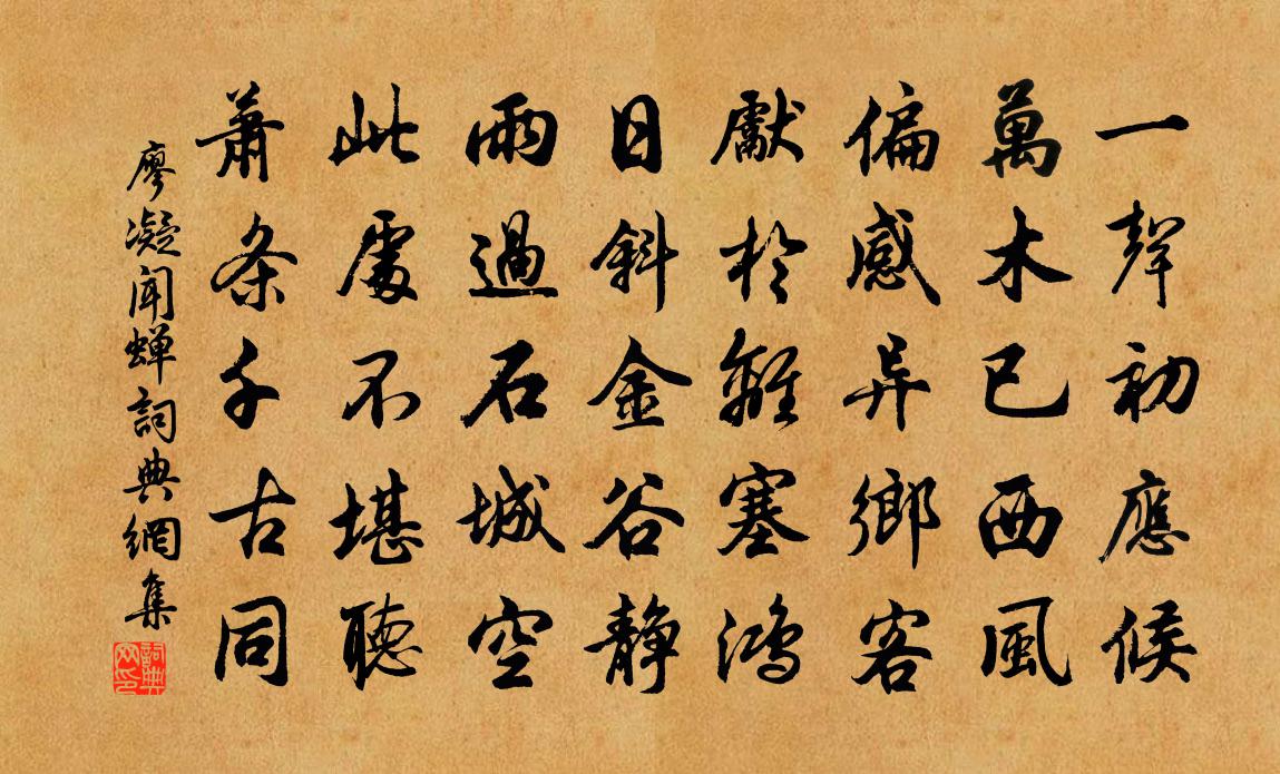 詩詞名句歷史字典書法欣賞書法字典國語詞典說文解字康熙字典古漢語字典標 題 作 者 詩 句 聞蟬作者:廖凝 朝代:唐代聞蟬原文一聲初應候,萬木已西風。偏感異鄉客,先於離塞鴻。日斜金谷靜,雨過石城空。此處不堪聽,蕭條千古同。詩詞問答問:聞蟬的作者是誰?答:廖凝問:聞蟬寫於哪個朝代?答:唐代問:聞蟬是什麼體裁?答:五律廖凝聞蟬書法欣賞聞蟬書法作品注釋全唐詩:卷740-16詩詞推薦即事二首張耒〔宋代〕囂塵屏繁務,幽獨會夙心。惟時孟春月,微祿歸園林。下有采微徑,上有知時禽。終日自嘯歌,寂無鄰里音。冉冉答崔主簿問,兼簡溫上人韋應物〔唐代〕緣情生眾累,晚悟依道流。諸境一已寂,了將身世浮。閒居澹無味,忽復四時周。靡靡芳草積,稍稍新篁抽。即此偈頌一百二十三首釋崇岳〔宋代〕兩刃交鋒,略通一線。有耳者聞,有眼者見。秋懷二首洪咨夔〔宋代〕素節垂垂杪,衰懷拍拍叢。風乾梧葉白,霜老菊花紅。理曲多添瘦,停詩不減窮。出尋空闊處,揩眼送飛鴻。對雪高駢〔唐代〕六出飛花入戶時,坐看青竹變瓊枝。如今好上高樓望,蓋盡人間惡路岐。拂雲堆李益〔唐代〕漢將新從虜地來,旌旗半上拂雲堆。單于每近沙場獵,南望陰山哭始回。次平元衡菖蒲釋寶曇〔宋代〕細如毛髮綠毿毿,寂寞無人共歲寒。萬壑千岩風雨面,卻宜六月坐中看。公子行周繇〔唐代〕青衫薄薄漏春風,日暮鳴鞭柳影中。回望玉樓人不見,酒旗深處勒花驄。赴試途中有感李鴻章〔清代〕黃河泰岱勢連天,俯看中流一點菸。此地盡能開眼界,遠行不為好山川。陸機入洛才名振,蘇軾來游壯志堅。多謝雨中簡章令趙蕃〔宋代〕夜雨仍朝雨,知時復後時。禾囷愆黍稌,麥地及耘耔。屢起瞻行旆,頻成閱贈詩。渠方謹期會,君自念疲羸。破虜凱歌二十四首周麟之〔宋代〕七寶為床坐殿衙,金猊雙立噴飛霞。自緣積惡難安享,不得全軀作帝羓。題東觀壁謝枋得〔宋代〕老樹猶能識道回,好懷長對碧天開。青山綠水何人管,明月清風要我來。少日曾聞黃石教,平生幾擲左慈杯。道兄寄友人周文璞〔宋代〕流落他鄉鎩羽翰,半年寧復記悲歡。夜傳樓鼓思城角,朝見江船念客鞍。不恨形骸老閭里,遂令唇舌滿長安。寄聲讀史雜感(十首選二)吳偉業〔清代〕莫定三分計,先求五等封。國中惟指馬,閫外盡從龍。朝事歸諸將,軍需仰大農。淮南數州地,幕府但歌鐘。初秋王同祖〔宋代〕晚趁涼颸上小樓,忽看梧葉始驚秋。悲懷無奈狂風雨,數尺歸鴉懶轉頭。方太君生朝四首項安世〔宋代〕天邊歷草記年華,一日東風一莢花。春到平分爭一莢,庭萱吹出碧雲芽。元祐祀九宮貴神二首佚名〔宋代〕上天貴神,九宮設位,功徳及物。乃秩明祀。望拜紫壇,赫然靈氣。奠玉牙幣,歆之無愧。題孫端甫別墅葉紹翁〔宋代〕幽居地僻少人知,野水春風枳樹籬。檢歷預尋移竹日,題牆閒記種花時。堪嗤狡兔須三窟,只學鷦鷯占一枝。淨掃思歸虞儔〔宋代〕風雨連朝作伴牢,只堪痛飲讀離騷。誰知老境侵腰腳,早是多情惜鬢毛。杖屨出門還有礙,簿書堆案敢辭勞。年來菩薩蠻·舞裙香暖金泥牛嶠〔唐代〕舞裙香暖金泥鳳,畫梁語燕驚殘夢。門外柳花飛,玉郎猶未歸。愁勻紅粉淚,眉剪春山翠。何處是遼陽,錦屏春晝名句推薦一曲危弦斷客腸。津橋捩柂轉牙檣。嚴仁《鷓鴣天·惜別》 可惜一溪風月,莫教踏碎瓊瑤。蘇軾《西江月·頃在黃州》 理無常是,事無常非。列子及其弟子《列子·說符》 山遠近,路橫斜,青旗沽酒有人家。辛棄疾《鷓鴣天·陌上柔桑破嫩芽》 丈夫一言許人,千金不易。司馬光《資治通鑑·唐紀二》 枕上十年事,江南二老憂,都到心頭。徐再思《水仙子·夜雨》 千層石樹遙行路,一帶山田放水聲。姚鼐《山行·布穀飛飛勸早耕》 早知恁么。悔當初、不把雕鞍鎖。柳永《定風波·自春來》 莫笑賤貧夸富貴,共成枯骨兩何如?白居易《放言五首·其四》 多才之士,才儲八斗;博學之德,學富五車。程登吉《幼學瓊林·卷四·文事》