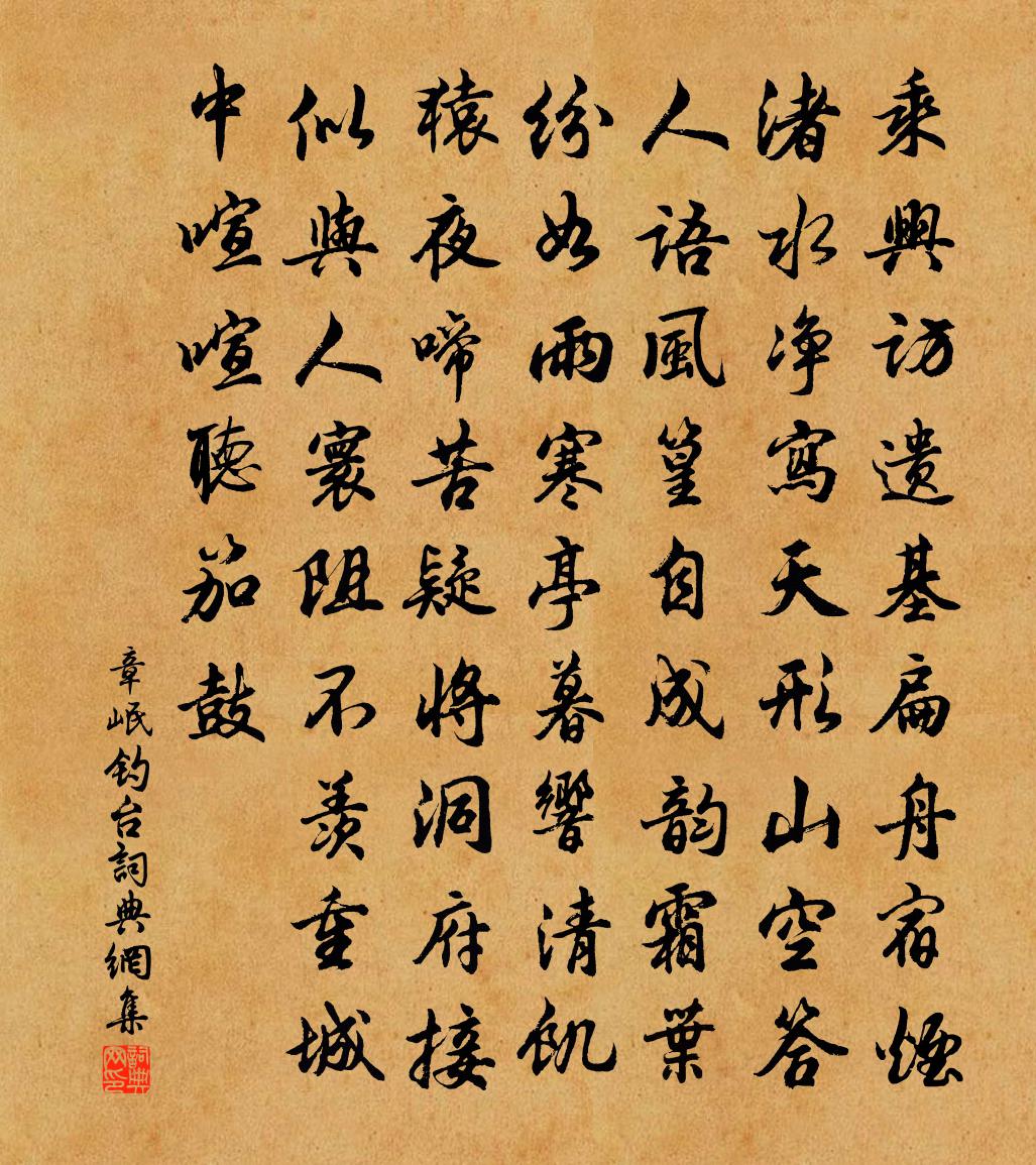 詩詞名句歷史字典書法欣賞書法字典國語詞典說文解字康熙字典古漢語字典標 題 作 者 詩 句 釣台作者:章岷 朝代:宋代釣台原文乘興訪遺基,扁舟宿煙渚。水淨寫天形,山空答人語。風篁自成韻,霜葉紛如雨。寒亭暮響清,飢猿夜啼苦。疑將洞府接,似與人寰阻。不羨重城中,喧喧聽笳鼓。詩詞問答問:釣台的作者是誰?答:章岷問:釣台寫於哪個朝代?答:宋代章岷釣台書法欣賞釣台書法作品詩詞推薦夏中病痁作溫庭筠〔唐代〕山鬼揚威正氣愁,便辭珍簟襲狐裘。西窗一夕悲人事,團扇無情不待秋。頌古一百首釋智愚〔宋代〕此行莫擬幾時回,此去應須到五台。若過曼殊放光處,殷勤為我記歸來。妾薄相行曹植〔魏晉〕齊謳楚舞紛紛。歌聲上徹青雲。孟子事天立命陳普〔宋代〕窮理知天所性全,存而順事沒而安。保全是理無容失,所受於天或可還。田無秋興蒲壽宬〔宋代〕草屋柴門風露涼,寒瓜收蔓力鋤荒。新栽莙薘恰逢雨,欲剪芹藍猶待霜。牧豎歸來煨芋熟,田翁相就潑醅香。里胥漢州王大錄事宅作杜甫〔唐代〕南溪老病客,相見下肩輿。近發看烏帽,催蓴煮白魚。宅中平岸水,身外滿床書。憶爾才名叔,含淒意有餘。雜詩絕句十七首梅堯臣〔宋代〕燕立茅屋脊,燕銜芹岸泥。巢成同養子,薄暮亦同棲。讀故友於君集劉言史〔唐代〕大底從頭總是悲,就中偏愴築城詞。依然想得初成日,寄出秋山與我時。為顧彥先贈婦詩二首其一陸機〔魏晉〕辭家遠行游。悠悠三千里。京洛多風塵。素衣化為緇。循身悼憂苦。感念同懷子。隆思亂心曲。沈歡滯不起。歡沈太學創置石經薛存誠〔唐代〕聖唐復古制,德義功無替。奧旨悅詩書,遺文分篆隸。銀鉤互交映,石壁靡塵翳。永與乾坤期,不逐日月逝。儒林送平禪人歸鄂渚釋正覺〔宋代〕浮舟春水作歸征,家有良田可飯羹。久客迴翔雲一點,舊巢臥看月三更。人猜我住尖頭屋,爾去誰扶折腳鐺。為問自笑(〔一題:試筆〕)蘇軾〔宋代〕子石如琢玉,遠煙真削黳。入我病風手,(古語云,磨墨如病風手。)玄雲渰淒淒。是中有何好,而我喜欲迷。既頌證道歌證道歌釋印肅〔宋代〕深嗟蒙懂頑皮靼,只道無人來剔撥。我今年少或龍鍾,胡亂度生管廣撻。庚申十二月二十一日西和州健步持子布書報已陸游〔宋代〕萬里東來雙鯉魚,衰翁悲喜得兒書。聞過峴首已冬至,想到匡廬將歲除。辛苦山行穿雪履,淒涼旅飯嚼冰蔬。此行句周必正〔宋代〕八月分圓二十年。潘卿求內主令人挽章二首蘇籀〔宋代〕擇夫先筮嫁,年俯逮期頤。周南弗牆面,班誡克刑儀。陔蘭冀豐養,中饋失扶持。惻慨百金誄,君文亦漢碑。錦竹梅堯臣〔宋代〕雖作湘竹紋,還非楚筠質。化龍徒有期,待鳳曾無實。本與凡草俱。偶親君子室。宿贊公房(京中大雲寺主謫此安置)杜甫〔唐代〕杖錫何來此,秋風已颯然。雨荒深院菊,霜倒半池蓮。放逐寧違性,虛空不離禪。相逢成夜宿,隴月向人圓。偈公六十五首釋鹹傑〔宋代〕今朝六月十五,祝聖升堂擊鼓。木童火里吹笙,石女雲中作舞。也大奇,也大奇,天無四壁,地絕八維。五湖四海聽岳州徐員外彈琴張祜〔唐代〕玉律潛符一古琴,哲人心見聖人心。盡日南風似遺意,九疑猿鳥滿山吟。名句推薦奇謀報國,可憐無用,塵昏白羽。朱敦儒《水龍吟·放船千里凌波去》 屋漏在上,知者在下。王充《論衡·卷十一·答佞篇》 敕勒川,陰山下。天似穹廬,籠蓋四野佚名《敕勒歌》 片雲天共遠,永夜月同孤。杜甫《江漢》 氣性不和平,則文章事功,俱無足取王永彬《圍爐夜話·第四十則》 見樂則淫侈,見憂則諍治,此人之道也。呂不韋《呂氏春秋·論·似順論》 蘭舟斜纜垂揚下,只宜輔枕簟向涼亭披襟散發。白樸《得勝樂·夏》 斷送一生憔悴,只銷幾個黃昏。趙令畤《清平樂·春風依舊》 算遺蹤、猶有枕囊留,相思物。吳文英《滿江紅·劉朔齋賦菊和韻》 數枝門柳低衣桁,一片山花落筆床。岑參《山房春事二首》