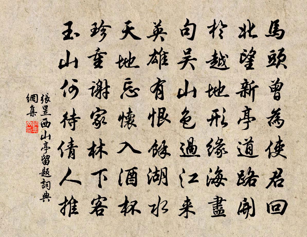 詩詞名句歷史字典書法欣賞書法字典國語詞典說文解字康熙字典古漢語字典標 題 作 者 詩 句 西山亭留題作者:張昱 朝代:元代西山亭留題原文馬頭曾為使君回,北望新亭道路開。於越地形緣海盡,句吳山色過江來。英雄有恨余湖水,天地忘懷入酒杯。珍重謝家林下客,玉山何待倩人推?詩詞問答問:西山亭留題的作者是誰?答:張昱問:西山亭留題寫於哪個朝代?答:元代問:西山亭留題是什麼體裁?答:七律張昱西山亭留題書法欣賞西山亭留題書法作品注釋元詩別裁集詩詞推薦靈照女贊釋紹曇〔宋代〕幾對丹霞斗活機,噁心腸有老爺知。笊籬妥得春風滿,不直分文賣與誰。息壤袁說友〔宋代〕石城出壤水懷州,息壤藏城水復收。千載故侯猶未識,土能勝水有深謀。和任頓田感舊敘懷司馬光〔宋代〕結交窗英俊樂如窗何,風誼窗敦明寄詠歌。自致青雲今有幾,華為異物已居多。櫝中本自沽良價,毫末安能滑至和濯清柴隨亨〔宋代〕世間何水獨流清,惟有箕山此一泓。只恨許由曾洗耳,卻憐無處濯吾纓。郊廟歌辭。享太廟樂章。歆和佚名〔唐代〕崇禋已備,粢盛聿修。潔誠斯展,鍾石方遒。薔薇花張祜〔唐代〕曉風抹盡燕支顆,夜雨催成蜀錦機。當晝開時正明媚,故鄉疑是買臣歸。看盡常州圖迎新太守楊萬里〔宋代〕畫工吮筆畫常州,老子來看卻自羞。若遣此圖還解語,道儂調戲幾君侯。陟駝巘盧方春〔宋代〕雨涼陟駝巘,轉歷九十折。短竹亦自陰,小家亦自潔。尋草補斷蹊,行人以旱說。農哭眼睛落,天懶霹靂歇。斯民偶成晁公溯〔宋代〕樓上東風簾幕垂,纖纖春筍弄妝遲。玉籠鸚鵡知人意,催報花梢日影移。十二月十三日喜雪二首郭印〔宋代〕繽紛飛六出,景色兔園同。桂樹非摧月,楊花不起風。布銀成世界,屑玉滿虛空。此地知豐樂,如何答上穹。功成亦賦短項翁詩複次其韻李衡〔宋代〕君不見仲淹居河汾,目營四海心六經。又不見子幼反田裡,拊缶烏烏徒快耳。續經憤世雖自喜,豈識濁醪函妙理。水上清風覆以喬木孔武仲〔宋代〕喬木張帷幄,小溪環佩聲。清風復颯然,三者固難並。而我兼得之,世俗亦不爭。逍遙萬慮廢,俯仰一身輕。豁若偈十二首釋文準〔宋代〕八月九月天,白露寒露節。門外在處山,秋風落黃葉。與郭舜欽朝請鄧肅〔宋代〕成均冷坐窮吞紙,額叩龍墀濱九死。背負琴書偶生還,賴有春風滿故里。故里渺居天一隅,因仍蔓草不堪除。多謝張安化重陽日置酒挽同官游靈泉寺登高時適有李新〔宋代〕白髮新遷客,黃雲古戰場。自然堪墮淚,何必更重陽。山削孤城起,河分細水長。蜀峰高處望,猶是隔秦鄉。題雲溪庵范心遠〔宋代〕雲溪高隱臥煙霞,默飲陽晶與月華。霧斂丹台生瑞草,雲收靈腑結瓊葩。青龍吐火烹金茗, * 跑泉溉玉芽。龍虎和潘叔治題劉道士房畫薛稷六鶴圖六首其一啄梅堯臣〔宋代〕窮年見像啄,但有飢乏意。雖存玉山禾,不入丹青喙。因思方朔嘲,此豈優諧類。依韻和郭秘校苦寒梅堯臣〔宋代〕噫風鳴悲鳶鳴哀,雨霰枯木為之摧。昭亭山頭野火滅,海水夜凍迷蓬萊。燭籠以爪自掩耳,酒盞生冰拈不起。陶潛挽秦國夫人李流謙〔宋代〕久矣鴻飛渚,翩然雁字峰。九重疏異渥,萬里合幽封。引柩烏銜壤,馴阡鹿護松。他時人下馬,有子是夔龍。送嚴上舍並寄諸公十首寄趙景安府判陳造〔宋代〕已種河陽柳,將題晉客輿。論交記曩昔,因使問何如。擁燼就多暇,援毫不一書。詩成當屬我,拜賜袞褒餘。名句推薦勝敗兵家事不期,包羞忍恥是男兒。杜牧《題烏江亭》 二十四橋,頗有杜書記否。劉辰翁《桂枝香· * 人去》 闌乾倚遍重來憑。淚粉偷將紅袖印。歐陽修《玉樓春·去時梅萼初凝粉》 深澗飲渴虹,邃河生秋雷。惟鳳《姑射山詩題曾山人壁》 兒童散學歸來早,忙趁東風放紙鳶。高鼎《村居》 潮打三更瓜步月,雨荒十里紅橋火。鄭燮《滿江紅·思家》 人生亦有命,安能行嘆復坐愁?鮑照《擬行路難·其四》 野老念牧童,倚杖候荊扉。王維《渭川田家》 世事短如春夢,人情薄似秋雲。朱敦儒《西江月·世事短如春夢》 有一言,無一行,胃(謂)之誣。佚名《黃帝四經·十大經·雌雄節》