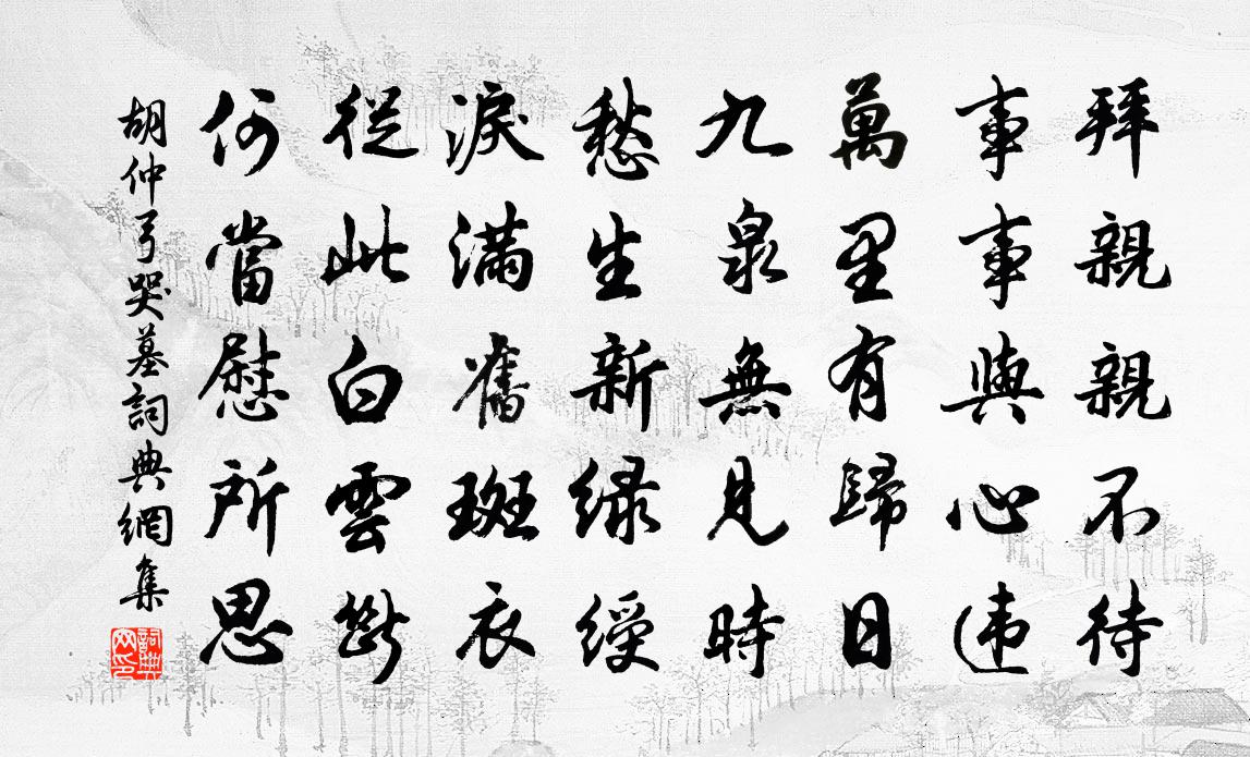 詩詞名句歷史字典書法欣賞書法字典國語詞典說文解字康熙字典古漢語字典標 題 作 者 詩 句 哭墓作者:胡仲弓 朝代:宋代哭墓原文拜親親不待,事事與心違。萬里有歸日,九泉無見時。愁生新綠綬,淚滿舊斑衣。從此白雲斷,何當慰所思。詩詞問答問:哭墓的作者是誰?答:胡仲弓問:哭墓寫於哪個朝代?答:宋代胡仲弓哭墓書法欣賞哭墓書法作品詩詞推薦將曉二首杜甫〔唐代〕石城除擊柝,鐵鎖欲開關。鼓角悲荒塞,星河落曙山。巴人常小梗,蜀使動無還。垂老孤帆色,飄飄犯百蠻。軍吏項里溪上見珍禽日溪鵲相隨數十步不去陸游〔宋代〕涉溪來過東溪老,斷枝槁葉紛如掃。忽逢溪鵲昔未識,言語惺憁羽毛好。異哉馴狎若可呼,跡雖甚疏情有餘。上穿威儀辭原妙〔元代〕山中住。黯淡雲無數。誓相去,共守無生路。水調歌頭佚名〔宋代〕今日雪飛六出,明夜月圓三五,梅臘正傳芳。恰值生申節,共獻椒觴。讀天台侍郎黃公神道碑高斯得〔宋代〕昔纂寧宗紀,名臣嘆寂寥。鉅奸方枋國,多士謾盈朝。快讀黃公傳,如聞舜代韶。盡言醒眾聵,獨立聳清標。辨枉鵲橋仙(和蔡子周)侯置〔宋代〕鶴髮蕭森,玉顏腴潤,養就黃芽金鼎。一區松菊老湘濱,但心遠、何妨人境。袞衣家世,鳴鸞歌舞,到了春冰消盡賀聖朝佚名〔宋代〕階蓂八葉當炎赫。此際公生日。金爐香爇起祥煙,氣佳哉蔥鬱。稱觴蘭玉真無敵。塵簪纓世襲。鸞棲枳棘暫淹留,送黃東起西上王邁〔宋代〕我友君居德行科,見君覺我汗顏多。筆端有韻珠盈唾,胸次無塵玉不磨。好去腰斤高斫桂,向來傳缽有持荷。廣寒易庵道人歸雁蒼兩月矣作詩趣之舒岳祥〔宋代〕一入雁蒼山,山蒼雁落灣。石螿鳴杼下,沙鳥宿窗間。吾子動多悔,老夫今稍閒。密雲疏雨里,心事極相關。送尉遲羽之歸宣州盧仝〔唐代〕君歸乎,君歸興不孤。謝朓澄江今夜月,也應憶著此山夫。春雨陸游〔宋代〕胸懹阮步兵,詩句謝宣城。今夕俱參透,焚香聽雨聲。影答形陶淵明〔魏晉〕存生不可言,衛生每苦拙;誠願游崑華,邈然茲道絕。與子相遇來,未嘗異悲悅。憩蔭若暫乖,止日終不別。此同南樓范仲淹〔宋代〕南樓百尺餘,清夜微埃歇。天會詩人情,遺此高高月。臨江仙·淺淺余寒春半晏幾道〔宋代〕淺淺余寒春半,雪消蕙草初長。煙迷柳岸舊池塘。風吹梅蕊鬧,雨細杏花香。月墮枝頭歡意,從前虛夢高唐,覺來皇帝閣春帖子許應龍〔宋代〕三白從來兆歲豐,幾看瑞雪舞迴風。蒼龍掛闕農祥正,擊壤行歌我稼同。挽薛艮齋徐定〔宋代〕今古名流特地奇,生平學術得真師。纘將管樂為操蘊,論切周唐入設施。經理遠橅循中道稱藩麾。堪驚四十成埋玉答二郭詩 其二嵇康〔兩漢〕昔蒙父兄祚。少得離負荷。因疏遂成懶。寢跡北山阿。但願養性命。終己靡有他。良辰不我期。當年值紛華。坎凜酒中十詠。酒床皮日休〔唐代〕糟床帶松節,酒膩肥如羜。滴滴連有聲,空疑杜康語。開眉既壓後,染指偷嘗處。自此得公田,不過渾種黍。次韻和西堂風霾宋庠〔宋代〕霧氣疑成雨,終風亟挫春。祗驚天灑礫,寧是暮吹塵。大旆亡空澤,奔車僨要津。高樓非可望,偏汗扇中人。寄題張道士招真閣李呂〔宋代〕君成道,去何許,寂寂空山號行府。自從漢末人相值,因循今莫睹。淒涼古廟落嵓隈,水繞閒庭縈嫩苔。敕令立觀名句推薦舊時王謝堂前燕,飛入尋常百姓家。劉禹錫《烏衣巷》 高情已逐曉雲空。不與梨花同夢。蘇軾《西江月·梅花》 酌酒與君君自寬,人情翻覆似波瀾。王維《酌酒與裴迪》 夜聞歸雁生鄉思,病入新年感物華。歐陽修《戲答元珍》 日邊訊息空沈沈。畫眉樓上愁登臨。鄭文妻《憶秦娥·花深深》 故人江海別,幾度隔山川。司空曙《雲陽館與韓紳宿別》 故園渺何處,歸思方悠哉。韋應物《聞雁》 高岸為谷,深谷為陵。佚名《十月之交》 官無恆友,禍存斯虛,勢之所然,智者弗怠焉。來俊臣《羅織經·謀劃卷第九》 欲利己,便是害己;肯下人,終能上人。王永彬《圍爐夜話·第二一五則》
