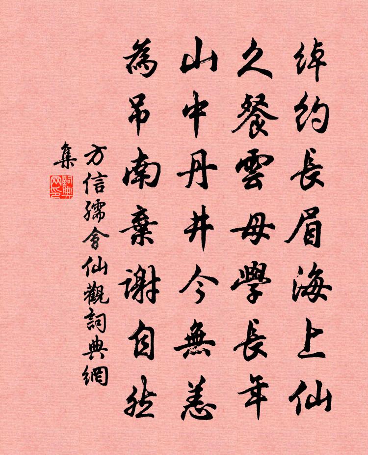 詩詞名句歷史字典書法欣賞書法字典國語詞典說文解字康熙字典古漢語字典標 題 作 者 詩 句 會仙觀作者:方信孺 朝代:宋代會仙觀原文綽約長眉海上仙,久餐雲母學長年。山中丹井今無恙,為吊南棄謝自然。詩詞問答問:會仙觀的作者是誰?答:方信孺問:會仙觀寫於哪個朝代?答:宋代方信孺會仙觀書法欣賞會仙觀書法作品詩詞推薦天池寺夜與主僧覺翁圓上共坐談浯溪山水之勝董嗣杲〔宋代〕空雲駕我登天池,江山秋渺無津涯。涉溪驀棧借杖藜,光景體認裁詩。崢嶸寺門窩風低,塔鈴喧風際天吹。方丈軒陳士淳主簿舉似與嚴慶曾主簿鄧伯允仙尉同到李長庚〔宋代〕陽華山水自雙清,況弄朱弦金石鳴。我是行人那敢聽,恐翻別調作離聲。山居雜詩九十首曹勛〔宋代〕素原游匡廬,夢寐不可易。棄官竟一往,不以歸意近。屢扣清虛仙,杯酒話疇昔。永懷撥雲峰,西麈每相憶。出都來陳,所乘船上有題小詩八首,不知何人蘇軾〔宋代〕潁水非漢水,亦作蒲萄綠。恨無襄陽兒,令唱銅鞮曲。雜體詩 盧郎中諶感交江淹〔南北朝〕大廈須異材。廊廟非庸器。英俊著世功。多士濟斯位。眷顧成綢繆。乃與時髦匹。姻媾久不虧。契闊豈但一。逢厄懷府園王安石〔宋代〕槐陰過雨盡新秋,盆底看雲映水流。忽憶小金山下路,綠苹稀處看游鯈。蜀先主廟劉禹錫〔唐代〕天下英雄氣,千秋尚凜然。(天下 一作:天地)勢分三足鼎,業復五銖錢。 得相能開國,生兒不象賢。淒涼蜀戴氏樓名折桂來覓詩賦二十八字舒邦佐〔宋代〕秋入高樓風露涼,疑從月里送清香。五枝高折非難事,問取燕山竇十郎。忠州禹廟陸游〔宋代〕古郡巴蠻國,空山夏禹祠。鴉歸暗庭柏,巫拜薦江蘺。草蔓青緣壁,苔痕紫滿碑。欲歸頻悵望,回棹夕陽時。宴柳毅詩洞庭龍君〔唐代〕大天蒼蒼兮大地茫茫,人各有志兮何可思量。狐神鼠聖兮薄社依牆,雷霆一發兮其孰敢當。荷貞人兮信義長,令骨結客少年場行虞世南〔唐代〕韓魏多奇節,倜儻遺聲利。共矜然諾心,各負縱橫志。結交一言重,相期千里至。綠沉明月弦,金絡浮雲轡。 * 雜詠一百首祖珽劉克莊〔宋代〕左氏譏懷璧,楊公卻袖金。安知機巧者,藏得叵羅深。和柳子玉紙帳蘇轍〔宋代〕夫子清貧不耐冬,書齋還費紙重重。窗明曉日從教入,帳厚霜飈定不容。京兆牛衣聊可藉,公孫布被旋須縫。吳綾示村醫陸游〔宋代〕玉函肘後了無功,每寓奇方嘯傲中。衫袖翫橙清鼻觀,枕囊貯菊愈頭風。新詩吟罷愁如洗,好景逢來病欲空。卻羨海月釋普寧〔宋代〕金波湧出爛爭盆,黑白虧盈湛不痕。莫謂清波無透路,珊瑚枝上影團團。清涼山贊佛詩 四首吳偉業〔清代〕西北有高山,雲是文殊台。台上明月池,乾葉金蓮開。花花相映發,葉葉同根栽。王母攜雙成,綠蓋雲中來。漢王壬戌首春十九日鎖宿玉堂四絕劉克莊〔宋代〕十年前已卜菟裘,老戀君軒不自由。衰颯禿翁垂八十,四更燭下作蠅頭。仲玉和前詩見贈因再用韻劉宰〔宋代〕官倉出粟遍東西,多謝朱公念隱微。但覺閭閻猶菜色,不知園囿已花飛。當年國論無同異,此日民言有是非。天上羅溪道中楊萬里〔宋代〕每歲秋猶熱,今年閨故涼。松稀青有數,山遠碧無常。陣陣金風細,家家玉粒香。只言官路短,堠子暗添長。浣溪沙(壽程將)管鑒〔宋代〕小小梅花巧耐寒。曛曛晴日醉醒間。茶甌金縷鷓鴣斑。三壽作朋須共醉,一杯留客未應慳。酒腸如海壽如山。名句推薦多才之士,才儲八斗;博學之德,學富五車。程登吉《幼學瓊林·卷四·文事》 謗書盈篋不復辯,脫身來看江南山。謝逸《送董元達》 堂前撲棗任西鄰,無食無兒一婦人。杜甫《又呈吳郎》 一樹斜陽蟬更咽,曾綰灞陵離別納蘭性德《淡黃柳·詠柳》 懷春情不斷,猶帶相思舊子。吳文英《丁香結·夷則商秋日海棠》 莫避春陰上馬遲。春來未有不陰時。辛棄疾《鷓鴣天·送歐陽國瑞入吳中》 今夜偏知春氣暖,蟲聲新透綠窗紗。劉方平《夜月 / 月夜》 道之以政,齊之以刑,民免而無恥。孔子弟子《論語·為政篇》 採得百花成蜜後,為誰辛苦為誰甜。羅隱《蜂》 繁采寡情,味之必厭。劉勰《文心雕龍·情采》