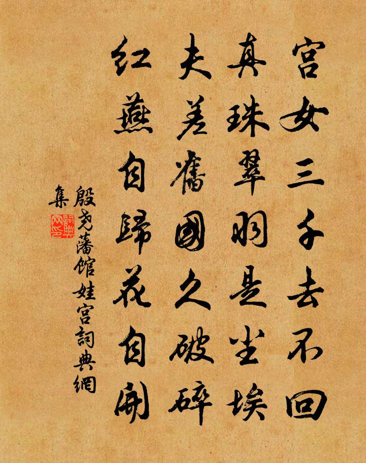 詩詞名句歷史字典書法欣賞書法字典國語詞典說文解字康熙字典古漢語字典標 題 作 者 詩 句 館娃宮作者:殷堯藩 朝代:唐代館娃宮原文宮女三千去不回,真珠翠羽是塵埃。夫差舊國久破碎,紅燕自歸花自開。詩詞問答問:館娃宮的作者是誰?答:殷堯藩問:館娃宮寫於哪個朝代?答:唐代問:館娃宮是什麼體裁?答:七絕殷堯藩館娃宮書法欣賞館娃宮書法作品注釋全唐詩:卷492-66詩詞推薦贈法傳李洪〔宋代〕栴檀林下老支郎,偶泛溪邊般若航。齋缽分摶香積飯,午窗對臥淨名床。雲山宴坐千春木,塵境難留三宿桑。欲結示兒劉克莊〔宋代〕瓜芋村邊一畝宮,閉門不復問窮通。生羞奏技伶人里,死怕標名狎客中。講學有誰明太極,吟詩無路和薰風。身今歸雁二首杜甫〔唐代〕萬里衡陽雁,今年又北歸。雙雙瞻客上,一一背人飛。雲里相呼疾,沙邊自宿稀。系書元浪語,愁寂故山薇。欲雪薙庭草陸游〔宋代〕露草煙蕪與砌平,群蛙得意亂疏更。微涼要作安眠地,放散今宵鼓吹聲。菊花圖唐寅〔明代〕颯颯金飆拂素英,倚欄璚朵入杯明。秋光滿眼無殊品,笑傲東籬羨爾榮。陪韓院長韋河南同尋劉師不遇(三字分韻,牟得同字)竇牟〔唐代〕仙客誠難訪,吾人豈易同。獨游應駐景,相顧且吟風。藥畹瓊枝秀,齋軒粉壁空。不題三五字,何以達壺公。病瘧兩作而愈陸游〔宋代〕久出天魔境,胡為瘧鬼來?亦知無妄疾,畢竟不為災。引睡須書卷,支羸賴粥杯。微風起秋色,樽酒亦時開。喻吟齊己〔唐代〕日用是何專,吟疲即坐禪。此生還可喜,餘事不相便。頭白無邪里,魂清有象先。江花與芳草,莫染我情田。訪郭德甫姚勉〔宋代〕美人在駒谷,久別良懷哉。秋風天氣清,特為斯人來。踏月訪清夜,岩扉肯予開。弟兄儼相對,松竹間古梅。子侄夜永姜特立〔宋代〕夜永醉還醒,隣雞已有聲。衾寒霜令急,木落睡魂清。九江千歲龜歌贈無咎張耒〔宋代〕靈龜千年口不食,以背負床飲其息。吾家兩龜豈徒不食亦不息,壽與萬古無終極。濟南晁君博物天地通,夜窺牛斗劉正之宜樓四章黃榦〔宋代〕君家兩寧馨,翠竹棲鸞鳳。筦簟燕新居,孔釋復抱送。懷則堂實堂文天祥〔宋代〕白頭北使駕雙韉,沙闊天長淚曉煙。中夜想應發深省,故人南北地行仙。非酒雍陶〔唐代〕人人慢說酒消憂,我道翻為引恨由。一夜醒來燈火暗,不應愁事亦成愁。倚鞦韆(寓好事近)張輯〔宋代〕人在玉屏閒,逗曉柳絲風急。簾外杏花微雨,罩春紅愁濕。單衣初試麴塵羅,中酒病無力。應是繡床慵困,倚鞦韆謝制帥高卿剡四首陳造〔宋代〕薦書未及門,啅鵲拂人衣。盥手袞字褒,只遣顏忸怩。瑕瑜權相償,葑菲終不遺。窮途石作腸,持用答恩私。元日二首呈永豐劉叔冶知縣戴復古〔宋代〕市近人聲雜,窗明雨色開。異鄉輕度節,同邸重傳杯。不礙狂夫醉,知無賀客來。故園歸未得,茅屋想蒼苔。思佳客·癸卯除夜吳文英〔宋代〕自唱新詞送歲華。鬢絲添得老生涯。十年舊夢無尋處,幾度新春不在家。衣懶換,酒難賒。可憐此夕看梅花。隔年甲辰仲冬八日元衡攜兩詩過訪及歸次韻酬送後張鎡〔宋代〕每針幽事當功名,唯欠能詩竹里僧。逕寫此篇為疏引,庵成來往豈無憑。詩一首陳昉〔宋代〕二十年余作吏人,後園花木也成林。儘是筆頭那撚得,枝枝葉葉有冤聲。刑重惟恐囚人怨,情輕又怕本官嗔。不知名句推薦遠路應悲春晼晚,殘霄猶得夢依稀。李商隱《春雨》 賞賜不能喜,誅罰不能威。墨子《墨子·05章 七患》 昔歲逢太平,山林二十年。元結《賊退示官吏》 可能無意傳雙蝶,盡付芳心與蜜房。宋祁《落花》 樹陰滿地日當午,夢覺流鶯時一聲。蘇舜欽《夏意》 言不可盡信,必揆諸理;事未可遽行,必問諸心。王永彬《圍爐夜話·第二OO則》 老景蕭條,送君歸去添淒斷。毛滂《燭影搖紅·送會宗》 白日地中出,黃河天外來。張蠙《登單于台》 兒童漫相憶,行路豈知難。元好問《倪莊中秋》 三過平山堂下,半生彈指聲中。蘇軾《西江月·平山堂》
