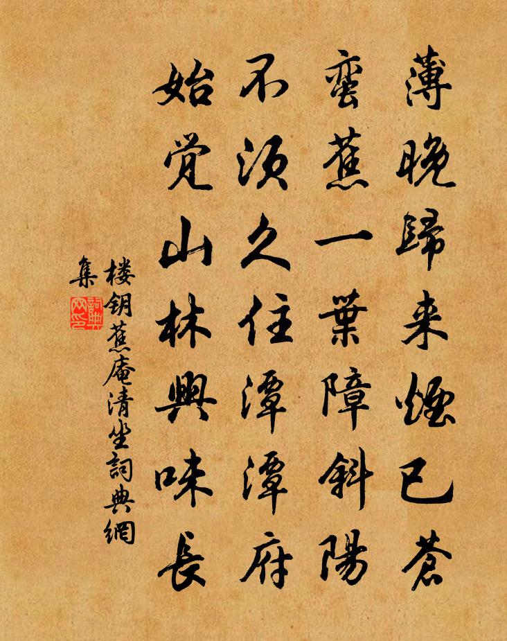 詩詞名句歷史字典書法欣賞書法字典國語詞典說文解字康熙字典古漢語字典標 題 作 者 詩 句 蕉庵清坐作者:樓鑰 朝代:宋代蕉庵清坐原文薄晚歸來煙已蒼,蠻蕉一葉障斜陽。不須久住潭潭府,始覺山林興味長。詩詞問答問:蕉庵清坐的作者是誰?答:樓鑰問:蕉庵清坐寫於哪個朝代?答:宋代樓鑰蕉庵清坐書法欣賞蕉庵清坐書法作品詩詞推薦錢張宣慰三首王義山〔宋代〕貴介而能大耐官,留心翰墨此為難。龍蛇現影筆端活,風雨驚人紙上寒。教子一經文墨續,讀書萬卷夜燈殘。一門寄周子察院楊萬里〔宋代〕向者豺當路,如今虎在山。百年諸老盡,一段好風還。誰謂永嘉末,人猶慶曆間。班心公定可,更可押廷班。贈牛仲容祖無擇〔宋代〕吾君旰食念邊陲,天下英雄待聘時。仁義未行真處士,功名不立豈田兒。臥友誰識南陽隱,失馬何勞北叟悲。莫向贈畫魚童秀才舒邦佐〔宋代〕我本江湖一釣徒,錦鱗到眼便歡呼。他年蓴鱠歸來日,添個漁午入畫圖。雨夜見投之作司空曙〔唐代〕出戶繁星盡,池塘暗不開。動衣涼氣度,遰樹遠聲來。燈外初行電,城隅偶隱雷。因知謝文學,曉望比塵埃。久旱吟邵雍〔宋代〕久旱望雨,久雨思晴。天之常道,人之常情。題劉氏所藏展子虔感應觀音二首黃庭堅〔宋代〕人間猶有展生筆,佛事蒼茫煙景寒。常恐花飛蝴蝶散,明窗一日百回看。秋夜張鎡〔宋代〕疎星曆歷間銀河,天澹渾疑瀉素波。牆角影低遮月少,樹頭聲壯著風多。平生但念長閒好,萬事從教若夢過。要足次韻曹好謙負春曹緯〔宋代〕作計尋芳不屬貧,可憐風物自良辰。飛花有意能留客,啼鳥多情解喚人。涉世乍驚翻捭薄,論交多語白頭新。十年湖光為劉慶遠作也姜特立〔宋代〕湖水浸坤軸,湖光混太清。風來谷紋起,夜靜鏡奩平。初訝琉璃軟,還疑組練橫。微茫連澤國,瀲灩蹙寒汀。破碎沁園春(和劉仲簡九日韻)劉辰翁〔宋代〕九日黃花,淵明之後,誰當汝儔。記龍山昨夜,寒泉九井,帽輕似葉,髯戟如虬。庚扇西風,孔林落照,銀海橫波題方氏清芬閣用范文正公韻曾幾〔宋代〕勝絕登臨地,桐江占十分。省郎才不世,御史氣如雲。遂使芝蘭秀,俱能錦繡文。諸孫又如許,百代有清芬。秋雨嘆三首杜甫〔唐代〕雨中百草秋爛死,階下決明顏色鮮。著葉滿枝翠羽蓋,開花無數黃金錢。涼風蕭蕭吹汝急,恐汝後時難獨立。堂上送周府尹三首方回〔宋代〕詩家周賀與方乾,三載同吟七里灘。晚節我惟甘豹隱,妙年公合快鵬摶。昔叨舊尹迎新尹,今愧前官送後官。朔野敬酬陸山人二首戴叔倫〔唐代〕黨議連誅不可聞,直臣高士去紛紛。當時漏奪無人問,出宰東陽笑殺君。由來海畔逐樵漁,奉詔因乘使者車。卻掌懷寄樞密王左丞楊億〔宋代〕高陪七聖從軒游,帷幄深嚴日運籌。口裡雌黃歸品藻,盤中韭白想風流。珠宮地密妨趨謁,銅缽聲沉斷唱酬。獨喜對晚開夜合花贈皇甫郎中白居易〔唐代〕移晚校一月,花遲過半年。紅開杪秋日,翠合欲昏天。白露滴未死,涼風吹更鮮。後時誰肯顧,唯我與君憐。紫笑史彌寧〔宋代〕芳苞暗解紫羅囊,香殺東風一味狂。試問花神緣底笑,笑他鶯蝶為春忙。黃相兒求詩陳著〔宋代〕相兒執筆請翁書,要受持從入學初。我有至言兒聽取,心宜莊敬氣宜舒。次韻謝明遠和鄧肅〔宋代〕乞身天上為溪山,征鼓不容蓑笠閒。酷暑扁舟同海角,暖風杯酒念長安。高情我自歸蓮社,妙雀君應冠杏壇。更約名句推薦湘江千歲未為陵,水底魚龍應識字。鮑溶《襄陽懷古》 年年陌上生秋草,日日樓中到夕陽。晏幾道《鷓鴣天·醉拍春衫惜舊香》 見善則遷,有過則改。佚名《易傳·象傳下·益》 欲系青春,少住春還去。朱淑真《蝶戀花·送春》 遲遲鐘鼓初長夜,耿耿星河欲曙天。白居易《長恨歌》 物格而後知至,知至而後意誠,意誠而後心正,心正而後身修,身修而後家齊,家齊而後國治,國治而後天下平。曾子《禮記·大學》 素富貴,行乎富貴;素貧賤,行乎貧賤子思《中庸·第十四章》 棲霞山裂;沂水陷穴,廣數畝蒲松齡《地震》 動失之繁,靜失之寡。王通《中說·卷十·關朗篇》 江村獨歸處,寂寞養殘生。杜甫《奉濟驛重送嚴公四韻》