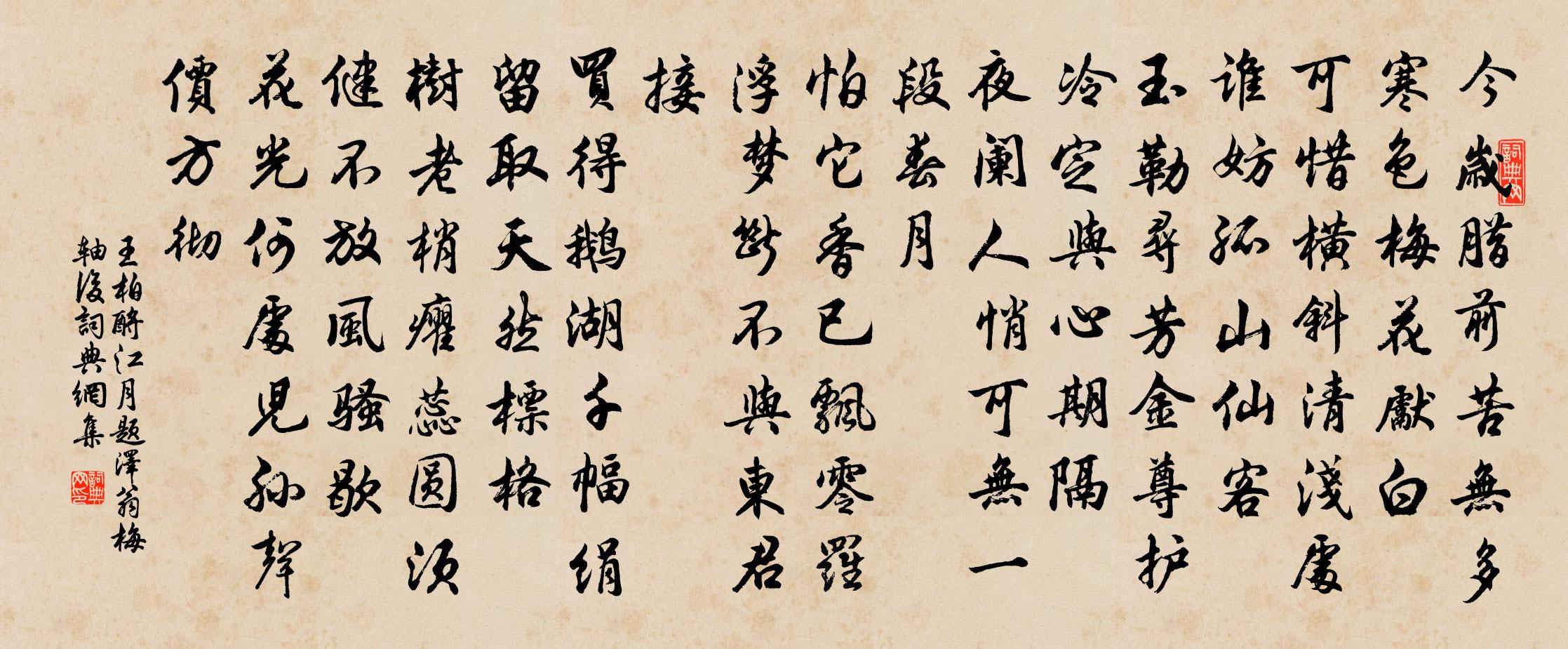詩詞名句歷史字典書法欣賞書法字典國語詞典說文解字康熙字典古漢語字典標 題 作 者 詩 句 酹江月(題澤翁梅軸後)作者:王柏 朝代:宋代酹江月(題澤翁梅軸後)原文今歲臘前,苦無多寒色、梅花先白。可惜橫斜清淺處,誰妨孤山仙客。玉勒尋芳,金尊護冷,定與心期隔。夜闌人悄,可無一段春月。怕它香已飄零,羅浮夢斷,不與東君接。買得鵝湖千幅絹,留取天然標格。樹老梢癯,蕊圓須健,不放風騷歇。花光何處,兒孫聲價方徹。詩詞問答問:酹江月(題澤翁梅軸後)的作者是誰?答:王柏問:酹江月(題澤翁梅軸後)寫於哪個朝代?答:宋代問:酹江月(題澤翁梅軸後)是什麼體裁?答:詞王柏酹江月(題澤翁梅軸後)書法欣賞酹江月(題澤翁梅軸後)書法作品詩詞推薦題悟性寺臥雲堂呈源上人三首曾豐〔宋代〕僧與白雲同住山,夢同雲山覺同還。勿移枕席下堂去,堂下吾疑是世間。湓城贈別陳陶〔唐代〕楚岸青楓樹,長隨送遠心。九江春水闊,三峽暮雲深。氣調桓伊笛,才華蔡琰琴。迢迢嫁湘漢,誰不重黃金。偈傾一百六十九首釋智朋〔宋代〕如何望岱嶽,仁心普周被。難與衲僧角,換卻鬼眼睛。及第後上主司王起姚鵠〔唐代〕三年竭力向春闈,塞斷浮華眾路岐。盛選棟樑非昔日,平均雨露及明時。登龍舊美無邪徑,折桂新榮盡直枝。莫道敞雲樓二絕洪咨夔〔宋代〕草樹成行整復斜,江頭白處定蘆花。夜深更著無邊月,好個樓居處士家。贈楊子中陳允平〔宋代〕鳳梧鸞竹郁青蔥,文氣沖沖五色虹。囊里短歌唐李賀,酒邊奇字漢揚雄。銅鋪雨後芭蕉綠,石井霜前薜荔紅。茶灶浣溪沙佚名〔宋代〕酒拍胭脂顆顆新。丹砂然火棄精神。暑天秋杪錦生春。香味已驚櫻實淡,絳皮還笑荔枝皴。美人偏喜破朱唇。偈二首釋休〔宋代〕風動邪,幡動邪,風鳴邪,鈴鳴邪。非風鈴鳴,非風幡動。此土與西天,一隊黑漆桶。誑惑世間人,請看滅胡種。謝杜合州送酒馮時行〔宋代〕浦樹江雲晚杜門,史君書札問深村。憂愁徹骨妨詩律,賦詠開荒得酒樽。病肺可能供痛飲,濡唇亦足荷深恩。呼兒和韋使君秋夜見寄丘丹〔唐代〕露滴梧葉鳴,秋風桂花發。中有學仙侶, * 弄山月。寄題朱元晦武夷精舍陸游〔宋代〕先生結屋綠岩邊,讀易懸知屢絕編。不用采芝驚世俗,恐人謗道是神僊。國史龍圖侍郎宋次道輓辭五首蘇頌〔宋代〕接武由童冠,論年並巳庚。切磨三友益,終始一交情。少別才經夏,何言遂隔生。空深寢門慟,不見繐帷旌。予頃從穰下移涖河陽洎出中書復領分陝惟茲二寇準〔宋代〕暮天寥落凍雲垂,一望危亭欲下遲。臨水數村誰畫得,淺山寒雪未銷時。送趙法師還蜀因名山奠簡李隆基〔唐代〕道家奠靈簡,自昔仰神仙。真子今將命,蒼生福可傳。江山尋故國,城郭信依然。二室遙相望,雲回洞裡天。登四聖觀月桂亭有感姚勉〔宋代〕將軍休戰伐,居士號清涼。亭創煙蘿古,山深月桂香。夢魂猶朔漠,風景已錢塘。往事都休問,鐘聲又夕陽。吳延年宰武義楊億〔宋代〕精神滿腹富青春,燒尾曾看上禹門。獻賦多年梁苑客,謫仙重世武夷孫。一同印綬光初命,幾驛桑麻接故園。澤國金陵即事三首王安石〔宋代〕昏黑投林曉更驚,背人相喚百般鳴。柴門長閉春風暖,事外還能見鳥情。題同濂閣高斯得〔宋代〕霽月光風灑落人,與君同調太憐君。不須嘆息知音少,後世豈無揚子云。頌古一百二十一首釋宗杲〔宋代〕雲門舉起竹篦,開口知君話墮。上方香積不餐, * 食人涕唾。和虛齋勸農十詩鄭清之〔宋代〕爇天妖焰彗初沉,朝汲仁賢簡帝心。未用鋒車便脂牽,小須午里遍春霖。名句推薦人之易其言也,無責耳矣。孟子《孟子·離婁章句上·第二十二節》 野水參差落漲痕,疏林欹倒出霜根。蘇軾《書李世南所畫秋景二首》 桃今百餘尺,花落成枯枝。李白《獨不見》 起來搔首,梅影橫窗瘦。汪藻《點絳唇·新月娟娟》 北方有佳人,絕世而獨立。李延年《李延年歌》 忽聞歌古調,歸思欲沾巾。杜審言《和晉陵陸丞早春遊望》 鳥宿池邊樹,僧敲月下門。賈島《題李凝幽居》 日往菲薇,月來扶疏。左思《三都賦》 北郭清溪一帶流,紅橋風物眼中秋,綠楊城郭是揚州。王士禎《浣溪沙·紅橋》 飛龍御天,故資雲雨之勢;帝王興運,必俟股肱之力。房玄齡《晉書·列傳·第三十五章》