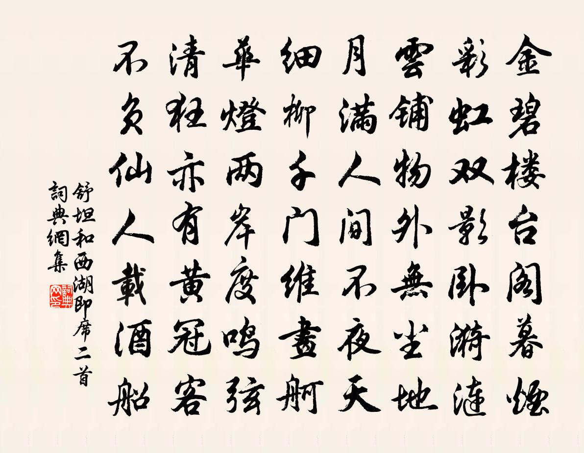 詩詞名句歷史字典書法欣賞書法字典國語詞典說文解字康熙字典古漢語字典標 題 作 者 詩 句 和西湖即席二首作者:舒坦 朝代:宋代和西湖即席二首原文金碧樓台閣暮煙,彩虹雙影臥漪漣。雲鋪物外無塵地,月滿人間不夜天。細柳千門維畫舸,華燈兩岸度鳴弦。清狂亦有黃冠客,不負仙人載酒船。詩詞問答問:和西湖即席二首的作者是誰?答:舒坦問:和西湖即席二首寫於哪個朝代?答:宋代舒坦和西湖即席二首書法欣賞和西湖即席二首書法作品詩詞推薦次懷英韻李處權〔宋代〕亂來身世羨沙鷗,雪後溪山粲兩眸。不用東床呼外舅,當年雅契在仙舟。吉祥寺花將落而述古不至蘇軾〔宋代〕今歲東風巧剪裁,含情只待使君來。對花無信花應恨,直恐明年便不開。宿雨王安石〔宋代〕綠攪寒蕪出,紅爭暖樹歸。魚吹塘水動,雁拂塞垣飛。宿雨驚沙盡,晴雲晝漏稀。卻愁春夢短,燈火著征衣。送李道士歸東湖釋了惠〔宋代〕湫龍噀水濕髭鬚,四十九盤山畫符。此法未傳先有驗,夜來驅月下東湖。送皇甫冉往白田崔峒〔唐代〕江邊盡日雉鳴飛,君向白田何日歸。楚地蒹葭連海迥,隋朝楊柳映堤稀。津樓故市無行客,山館空庭閉落暉。試問紹興以後祀五方帝六十首佚名〔宋代〕徂商筆祀,靈蓋孔養。恭承嘉禧,淇澹秬地。監此聲香,靈其安留。疇惠下民,匪靈之休。吊賈島二首曹松〔唐代〕先生不折桂,謫去抱何冤。已葬離燕骨,難招入劍魂。旅墳低卻草,稚子哭勝猿。冥寞如搜句,宜邀賀監論。青旆早發天台中岩寺度關嶺次天姥岑許渾〔唐代〕來往天台天姥間,欲求真訣駐衰顏。星河半落岩前寺,雲霧初開嶺上關。丹壑樹多風浩浩,碧溪苔淺水潺潺。可知大風雨中作陸游〔宋代〕風如拔山怒,雨如決河傾。屋漏不可支,窗戶俱有聲。烏鳶墮地死,雞犬噤不鳴。老病無避處,起坐徒嘆驚。三年次韻袁升之游雲寺鴻慶院山茶之什蒲瀛〔宋代〕花發今年喜不空,一頭肅客上蕭宮。雪殘千嶂獨連白,風引雙旌欲斗紅。他日動名三事在,先春和氣萬家同,等間秋冬之交雜賦陸游〔宋代〕霽日收殘靄,微霜作早寒。桐凋無宿葉,水退出新灘。室小才容膝,門低每觸冠。平生只此是,何物動憂端!沁園春 墾田東城 以上強村叢書用明刊魯齊遺許衡〔元代〕月下檐西,日出籬東,曉枕睡餘。喚老妻忙起,晨餐供具,新炊藜糝,舊醃鹽蔬。飽後安排,城邊墾*,要占蒼煙虞美人毛文錫〔唐代〕鴛鴦對浴銀塘暖,水面蒲梢短。垂楊低拂麴塵波,蛛絲結網露珠多,滴圓荷。遙思桃葉吳江碧,便是天河隔。錦鱗數詩分題二首孔武仲〔宋代〕一邑臨襄漢,青衫正少年。二毛侵鬢髮,披霧始窺天。三接龍光遠,瞳矓白日邊。四門方雜沓,羔雁賁林泉。五斗山居陳某〔宋代〕白雲護危屋,遙隔世人家。野逕不多竹,幽蘭自作花。敝衣僧說法,枯葉樹成槎。門外禽相狎,雙雙浴晚沙。禪人寫真求贊釋正覺〔宋代〕骨氣能朴,精神愈憨。閒身無所系,冷眼莫相瞞。遠霽摩秋兮天河斗轉,清霜結夜兮月窟蟾寒。四月上澣日同寮約游西湖十絕張鎡〔宋代〕賜沐山行策最長,遊人此日卻相妨。洞天只得東邊賞,開過燈花斷殺腸。結課宋祁〔宋代〕結課天官啟,悲秋騎省孫。崢嶸遒歲簽,骯髒別都門。餞蓋紛寒野,征檣拂曉暾。縣齋豐醉秫,無厭數持樽。劉平甫輓詩二首楊萬里〔宋代〕忠顯肩雙廟,屏山籙二程。嶺寒松節苦,壇暖杏花明。君也孤傅業,天乎獨短生。子孫無一物,故紙付渠耕。句爾鳥〔唐代〕鯨目光燒半海紅,鰲頭浪蹙掀天白。名句推薦梅花雪,梨花月,總相思。張惠言《相見歡·年年負卻花期》 故音樂者,所以動盪血脈,通流精神而和正心也。司馬遷《史記·樂書》 江雨霏霏江草齊,六朝如夢鳥空啼。韋莊《台城》 一一書來報故人,我欲因之壯心魄。李白《赤壁歌送別》 拼將一死酬知己,致令千秋仰義名。羅貫中《三國演義·第五十回》 隔座送鉤春酒暖,分曹射覆蠟燈紅。李商隱《無題·昨夜星辰昨夜風》 玄都觀里桃千樹,儘是劉郎去後栽。劉禹錫《元和十年自朗州至京戲贈看花諸君子 / 玄都觀桃花》 君子不怨天,不尤人。孟子《孟子·公孫丑章句下·第十三節》 荊江日落陣雲低,橫戈躍馬今何時。納蘭性德《送蓀友》 行雲卻在行舟下,空水澄鮮,俯仰留連,疑是湖中別有天。歐陽修《採桑子·畫船載酒西湖好》