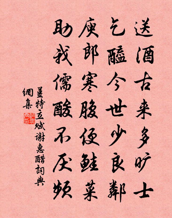 詩詞名句歷史字典書法欣賞書法字典國語詞典說文解字康熙字典古漢語字典標 題 作 者 詩 句 賦謝惠醋作者:姜特立 朝代:宋代賦謝惠醋原文送酒古來多曠士,乞醯今世少良鄰。庾郎寒腹便鮭菜,助我儒酸不厭頻。詩詞問答問:賦謝惠醋的作者是誰?答:姜特立問:賦謝惠醋寫於哪個朝代?答:宋代姜特立賦謝惠醋書法欣賞賦謝惠醋書法作品詩詞推薦寄獻南京致政杜相公宋祁〔宋代〕調元罷後久忘機,三見東山拜詔時。言在典謨經舜問,規留廊廟許曹隨。人間歲月尊黃髮,方外謳謠續紫芝。舉酒水調歌頭王罙高〔宋代〕千枝蔓仙牒,眉宇肖蒼龍。就中天賦英傑,玉磬照金鍾。滿袖春風和氣,散在苕溪霅水,謳歌頌兒童。好個廟堂樣贈術士羅公弼李新〔宋代〕陂迥山空豀水淺,騎牛信牛行自遠。大翁織笠六銖輕,阿母理衣簑直軟。短笛叫雲無曲終,年年但見岩花紅。何者用王龜齡韻題五柳堂吳芾〔宋代〕久矣期堂廢,重興賴有公。雙溪修故事,五柳振遺風。頓覺煙光好,端由氣味同。莫言官獨冷,長在綠陰中。燈夕齋中香火獨坐招希元不至宋庠〔宋代〕掩室維摩病,從昏太一祠。誰言鼓吹夕,獨禮天人師。燭燼委寒檠,茗華浮縹瓷。同袍不我顧,宴坐復何思。題潘德久侍兒扇陳造〔宋代〕襪塵去眼恨成堆,賦客當年浪費才。何似天風吹霧鬢,乘鸞新自月邊回。春日山居寄友人周賀〔唐代〕春居無俗喧,時立澗前村。路遠少來客,山深多過猿。帶岩松色老,臨水杏花繁。除憶文流外,何人更可言。侄安節遠來夜坐三首蘇軾〔宋代〕落第汝為中酒味,吟詩我作忍飢聲。便思絕粒真無策,苦說歸田似不情。腰下牛閒方解佩,洲中奴長足為生。大弨杏花雜詩元好問〔金代〕裊裊纖條映酒船,綠嬌紅小不勝憐。長年自笑情緣在,猶要春風慰眼前。再和制帥王之望〔宋代〕聖主不忘遠,惠懷堯所難。如何吾所部,疲療未全安。詔條少宣布,牒訴多悲酸。撫節夜長嘆,憂慚非一端。走筆贈獨孤駙馬李白〔唐代〕都尉朝天躍馬歸,香風吹人花亂飛。銀鞍紫鞚照雲日,左顧右盼生光輝。是時仆在金門裡,待詔公車謁天子。長揖彼鴷吟梅堯臣〔宋代〕斷木喙雖長,不啄柏與松。松柏本堅直,中心無蠹蟲。廣庭木雲美,不與松柏比。臃腫質性虛,圬蠍招猛觜。主人題共閒亭五首姜特立〔宋代〕太行日暮車盤處,灩澦波翻舟下時。惟有亭中無一事,坐看忙殺利名兒。次韻寄興祖廣德洪皓〔宋代〕南歸不獲卻東遷,險阻艱難遍大千。母老三年難見止,途窮一慟忽潸然。愁同暴虎馮可悔,災甚求魚用木緣。行府和子野郊居見寄仇遠〔宋代〕論心握手到忘形,性癖耽詩各瘦生。美酒三升差可戀,良田二頃不如耕。溪晴正熟眠鷗夢,門靜那驚吠犬聲。泉石木蘭花慢·送歸雲去雁張孝祥〔宋代〕送歸雲去雁,淡寒采滿溪樓。正佩解湘腰,釵孤楚鬢,鸞鑑分收。凝情望行處路,但疏煙遠樹織離憂。只有樓前流送李清宇章甫〔宋代〕行李過門復小留,劇譚同此小窗幽。三杯酒力客愁破,一夜雨聲春事休。舊燕尋巢元未毀,新鶯出谷自相求。槐牙臨江仙(和答昌甫見寄生朝)韓淲〔宋代〕滿眼春生梅柳意,山居清聽風泉。又因初度說今年。華顛相望處,新曲忽來前。自笑一周閒甲子,何為佞佛貪仙。登重玄寺閣韋應物〔唐代〕時暇陟雲構,晨霽澄景光。始見吳都大,十里郁蒼蒼。山川表明麗,湖海吞大荒。合沓臻水陸,駢闐會四方。俗繁劍池林景熙〔宋代〕鑿開神斧是何年,珠雁金鳧鎖冷煙。薜荔帶雲懸古木,轆轤卷月出秋泉。岩前洗劍精疑伏,林下烹茶味亦禪。高倚名句推薦嵩雲秦樹久離居,雙鯉迢迢一紙書。李商隱《寄令狐郎中》 去年寄書報陽台,今年寄書重相催。李白《久別離》 漢臣曾此作縲囚,茹血衣毛十九秋。汪遵《詠北海》 江帆幾片疾如箭,山泉千尺飛如電周德清《塞鴻秋·潯陽即景》 落葉人何在,寒雲路幾層。李商隱《北青蘿》 鋤禾日當午,汗滴禾下土。李紳《古風二首 / 憫農二首》 不食人間煙火。袁枚《隨園詩話·補遺 卷九》 憑觴靜憶去年秋,桐落故溪頭。晏幾道《訴衷情·憑觴靜憶去年秋》 耽於女樂,不顧國政,則亡國之禍也。韓非及後人《韓非子·十過》 等閒變卻故人心,卻道故人心易變。納蘭性德《木蘭花·擬古決絕詞柬友》
