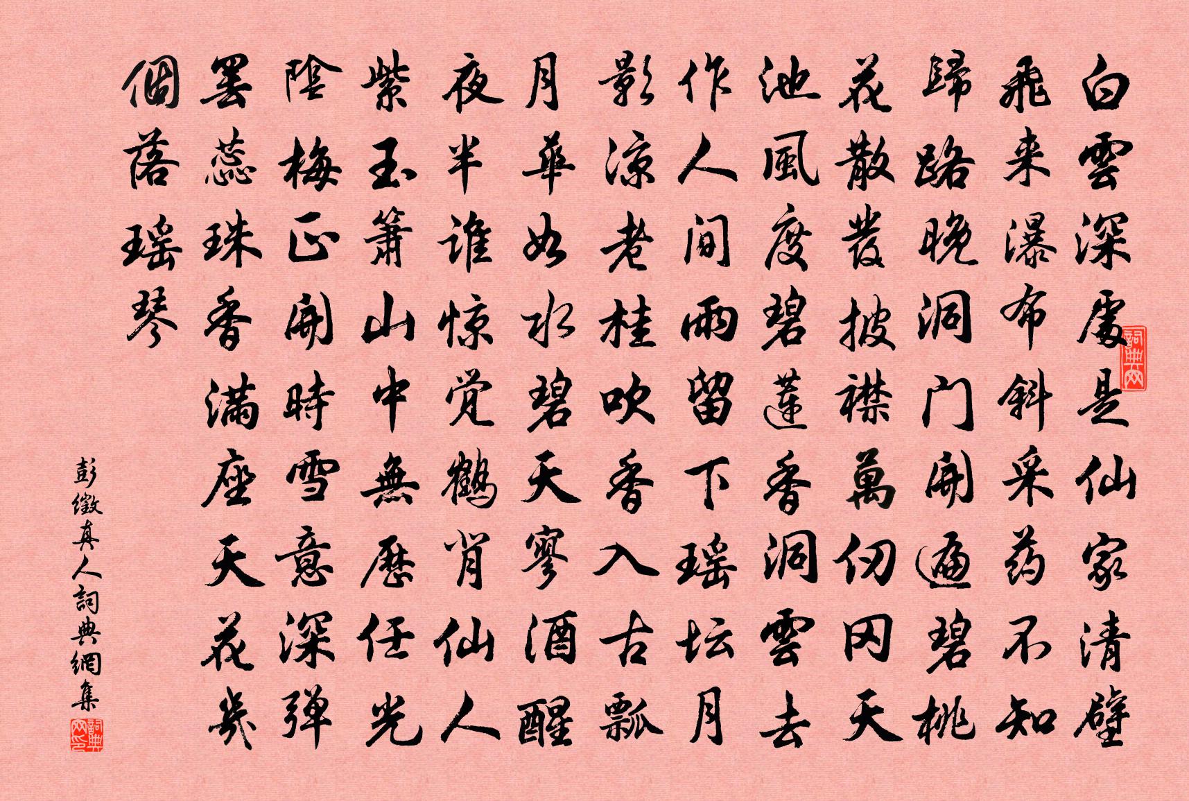 詩詞名句歷史字典書法欣賞書法字典國語詞典說文解字康熙字典古漢語字典標 題 作 者 詩 句 真人作者:彭徵 朝代:宋代真人原文白雲深處是仙家,清壁飛來瀑布斜。採藥不知歸路晚,洞門開遍碧桃花。散發披襟萬仞岡,天池風度碧蓮香。洞雲去作人間雨,留下瑤壇月影涼。老桂吹香入古瓢,月華如水碧天寥。酒醒夜半誰驚覺,鶴背仙人紫玉簫。山中無歷任光陰,梅正開時雪意深。彈罷蕊珠香滿座,天花幾個落瑤琴。詩詞問答問:真人的作者是誰?答:彭徵問:真人寫於哪個朝代?答:宋代彭徵真人書法欣賞真人書法作品詩詞推薦送郝校書從事相州王禹偁〔宋代〕提筆從戎別帝鄉,官清兼領校書郎。將軍幕下紅蓮媚,詩客袖中丹桂香。吟倚旌旗春過雨,醉聽刁斗夜含霜。金台減字木蘭花 右初四日乾偶坤通得六合王吉昌〔元代〕乾坤呈瑞。六合三才八卦備。四返歸真。一粒神丹氣像新。見前必定。酩酊沉沉渾未醒。子母團圓。雲步長春法界送文處厚歸蜀類試范成大〔宋代〕萬里東來萬里歸,正憐寡婦與孤兒。死生契闊心如鐵,風雨飄搖鬢欲絲。早集漢庭陪振鷺,莫留岷嶺戀蹲鴟。故家採桑子·恨君不似江樓呂本中〔宋代〕恨君不似江樓月,南北東西,南北東西,只有相隨無別離。恨君卻似江樓月,暫滿還虧,暫滿還虧,待得團圓是幾題武侯廟李復〔宋代〕梁甫高吟一幅巾,聯翩眾盜肯同群。久蟠丘壑雖龍臥,默計江山已鼎分。庸蜀欲開來日月,隆中先見會風雲。雜耕秋懷十首趙蕃〔宋代〕苕溪在何許,水遠山幽幽。自聞遠齋亡,時序忽晚秋。尺書不能寄,有懷空淚流。何以諒我心,諸兄交白頭。寄子由蘇軾〔宋代〕厭暑多應一向慵,銀鉤秀句益疏通。也知堆案文書滿,未暇開軒硯墨中。湖面新荷空照水,城頭高柳漫搖風。吏曹上明達皇后冊寶五首真宗〔宋代〕清官有嚴,廣樂在庭。鐘鼓筦聲,九變既成。縮茅以獻,潔秬惟聲。靈游可想,來燕來寧。送梵才大師歸天台章岷〔宋代〕故山蘿蔓鎖雲扉,幾夕扁舟已夢歸。蓮社招賢移歲月,芝岩編句滿珠璣。金刀擁雪新彫鬢,香祴欺蘭舊賜衣。後夜清平樂·春花秋草晏殊〔宋代〕春花秋草,只是催人老。總把千山眉黛掃。未抵別愁多少。勸君綠酒金杯,莫嫌絲管聲催。兔走烏飛不住,人生幾送金漢臣明府徐蜚英贊府還婺源方回〔宋代〕星源長貳兩賢者,丰采精神玉不如。詩外更工長短句,腹中何限古今書。平生事可心無愧,我輩人常氣有餘。記取黃陵廟易士達〔宋代〕帝輦南遊竟不還,二妃望斷九疑山。森森萬古祠前竹,猶帶當時粉淚斑。贈友人罷舉赴交趾辟命杜荀鶴〔唐代〕罷卻名場擬入秦,南行無罪似流人。縱經商嶺非馳驛,須過長沙吊逐臣。舶載海奴鐶硾耳,象駝蠻女彩纏身。如何好事近(二月十日作)郭應祥〔宋代〕春事日相催,紅盡淺桃深杏。可惜窺園無暇,任綠苔封徑。憑誰說與雨和風,休要太狂橫。等待禁菸予告,要選幽虞美人(夜泊廬山)徐似道〔宋代〕風緊浪淘生。蛟吼龜鳴。家人睡著怕人驚。只有一翁捫虱坐,依約三更。雪又打殘燈。欲暗還明。有誰知我此時情次韻蒲左丞游虎丘十首朱長文〔唐代〕掃石個蘿向上行,門前坐見白雲生。應思夢得多佳趣,獨宿樓中待月明。詠河市歌者范成大〔宋代〕豈是從容唱渭城,箇中當有不平鳴。可憐日晏忍飢面,強作春深求友聲。憶秦娥沈端節〔宋代〕憑闌獨。南山影蘸杯心綠。杯心綠。悠然忽見,臥披橫軸。西風暗度釵梁玉。手香記得人簪菊。人簪菊。無窮幽韻夜泛西湖五絕蘇軾〔宋代〕三更向闌月漸垂,欲落未落景特奇。明朝人事誰料得,看到蒼龍西沒時。漢宮春(重和)徐鹿卿〔宋代〕吏隱南昌,問盤根幾世,長子孫枝。仙風道骨如此,信不吾欺。素姿傾國,□難昏、坐覺愆期。算好與、水仙作配名句推薦治強生於法,弱亂生於阿。韓非及後人《韓非子·外儲說右下》 回首天涯歸夢,幾魂飛西浦,淚灑東州。周密《一萼紅·登蓬萊閣有感》 風乍起,吹皺一池春水。馮延巳《謁金門·風乍起》 紅豆生南國,春來發幾枝。王維《相思》 重鑄鋤犁作斤,姑舂婦擔去輪官,輸官不足歸賣屋。元稹《田家詞 / 田家行》 漫惹爐煙雙袖紫,空將酒暈一衫青。納蘭性德《浣溪沙·伏雨朝寒愁不勝》 漸老念鄉國,先歸獨羨君。簡長《送僧南歸》 不知天外雁,何事樂長征?徐禎卿《在武昌作》 江山如有待,花柳自無私。杜甫《後游》 風老鶯雛,雨肥梅子,午陰嘉樹清圓。周邦彥《滿庭芳·夏日溧水無想山作》