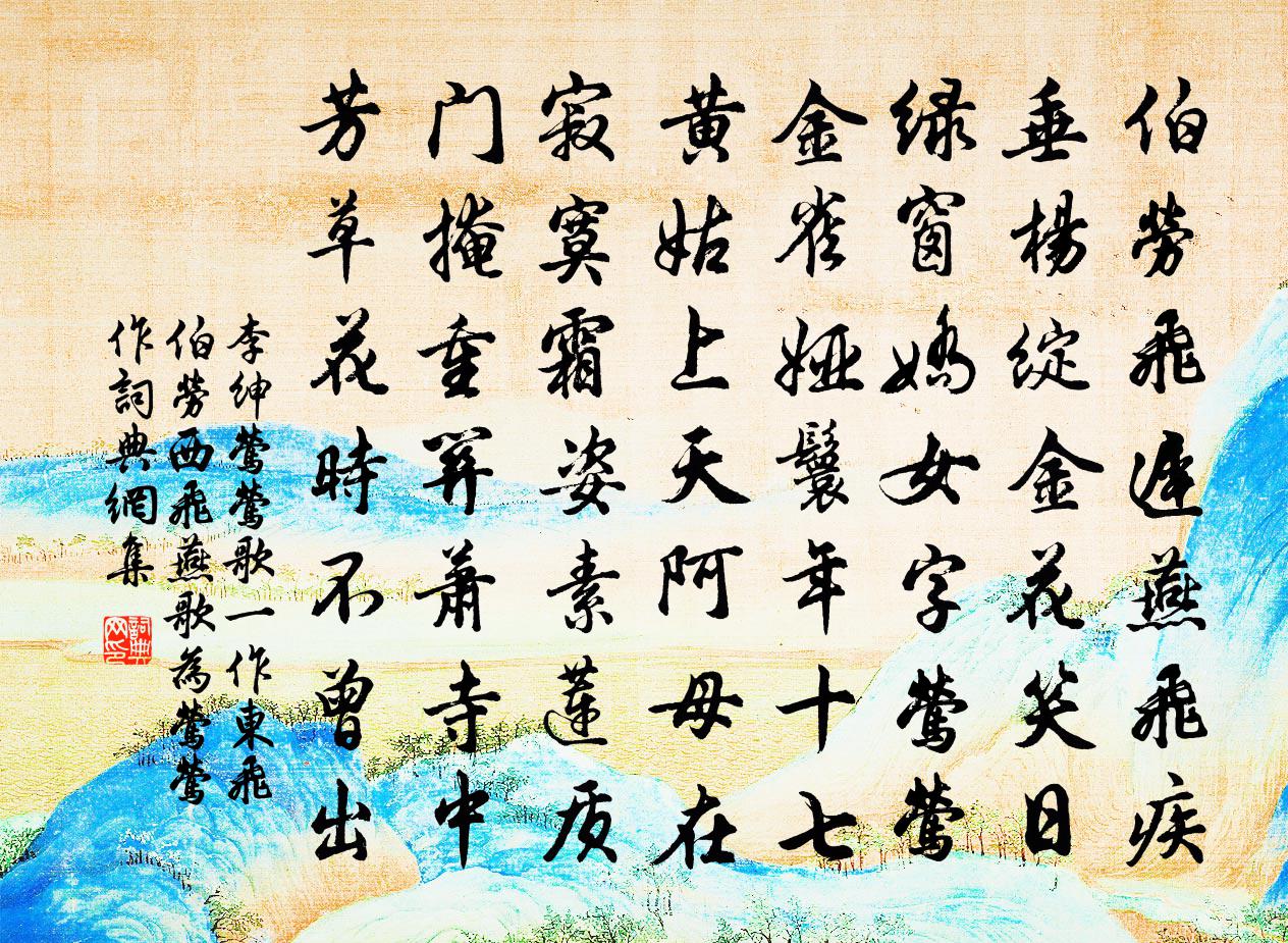 詩詞名句歷史字典書法欣賞書法字典國語詞典說文解字康熙字典古漢語字典標 題 作 者 詩 句 鶯鶯歌(一作東飛伯勞西飛燕歌,為鶯鶯作)作者:李紳 朝代:唐代原文伯勞飛遲燕飛疾,垂楊綻金花笑日。綠窗嬌女字鶯鶯,金雀婭鬟年十七。黃姑上天阿母在,寂寞霜姿素蓮質。門掩重關蕭寺中,芳草花時不曾出。詩詞問答問:《鶯鶯歌(一作東飛伯勞西飛燕歌,為鶯鶯作)》的作者是誰?答:李紳問:該詩寫於哪個朝代?答:唐代問:該詩是什麼體裁?答:七古書法欣賞鶯鶯歌(一作東飛伯勞西飛燕歌,為鶯鶯作)書法作品注釋全唐詩:卷483-8詩詞推薦送敏中新授戶部員外郎西歸白居易〔唐代〕千里歸程三伏天,官新身健馬翩翩。行沖赤日加餐飯,上到青雲穩著鞭。長慶老郎唯我在,客曹故事望君傳。前鴻游九鎖楊伯岩〔宋代〕曉山雲樹碧生秋,乘興間為洞府游。片石卻將仙路隔,負人平昔慕浮丘。索筍長句寄傅隱君王冕〔元代〕春風吹起石底雲,豐隆喚出蒼龍孫。古苔初破土膏滑,露華淨洗龜筒痕。先生愛筍如愛玉,冷笑人間飫膏肉。我生謝王諫議見思吟邵雍〔宋代〕西齋前後半松筠,萬慮澄余始見真。不謂天光明淨處,又能時憶舊交親。愛日王安石〔宋代〕雁生陰沙春,冬息陽海澨。冥冥取南北,豈以食為累。咨予愁病軀,樸鄙人所戲。無人治時難,量力當自棄。豈知和寄天選長官道潛〔宋代〕寓形宇宙間,佚我方以老。流光安足恃,百歲同過鳥。頃子縈網羅,文采緣自表。自古山林人,何曾識機巧。但記和行簡望郡南山白居易〔唐代〕反照前山雲樹明,從君苦道似華清。試聽腸斷巴猿叫,早晚驪山有此聲?舞曲歌辭。白紵歌二首王建〔唐代〕天河漫漫北斗粲,宮中烏啼知夜半。新縫白紵舞衣成,來遲邀得吳王迎。低鬟轉面掩雙袖,玉釵浮動秋風生。酒多去鄭暮次中牟宋祁〔宋代〕暮投京縣宿,氣象已紛羅。菀樹道旁密,侯田關內多。高城切星斗,秋水似天河。自問還台馬,猶餘几子珂。戲答張秘監饋羊黃庭堅〔宋代〕細肋柔毛飽臥沙,煩公遣騎送寒家。忍令無罪充庖宰,留與兒童駕小車。潘家山同章衡諸生飲次行令探得隱君子為章衡陳襄〔宋代〕吾聞隱君子,大隱廛市間。道義充諸中,測度非在顏。堯帝神且智,知人亦孔艱。勉哉二秘閣,賢行如高山。和紹興次子所寄詩曹勛〔宋代〕連旬零雨暑猶強,未信人間八月涼。瓮里曲生初泛蟻,壺中桂子並尋芳。斑衣未遂蘭玉集,吾子少留雲水鄉。門戶夢成之元稹〔唐代〕燭暗船風獨夢驚,夢君頻問向南行。覺來不語到明坐,一夜洞庭湖水聲。初入洞霄聞九成〔宋代〕擬借寒泉洗此心,幽亭曾屢謁清音。會須枕石伴龍睡,不爾 * 學鳳吟。蟄地金丹聞往昔,插天琳宇盛當今。靈芝紅芍藥王哲〔元代〕唯會做惺惺,便能夸可可。淨清訊息見得那。正好孤眠臥。這子午,致使運轉精神,寶瓶宮、肯教放過。堤防取、送汪聖錫侍郎帥福唐范成大〔宋代〕承明才入又南州,重見旌旗照柁樓。道義平生無捷徑,風波隨處有虛舟。如公未可違文石,稽古何妨欠碧油。我亦道武珪徐鈞〔宋代〕立儲去母豈良規,創業英名顧爾為。事變無窮難預料,身亡又兆國亡基。題周皓大夫新亭子二十二韻白居易〔唐代〕東道常為主,南亭別待賓。規模何日創?景致一時新。廣砌羅紅藥,疏窗蔭綠筠。鎖開賓閣曉,梯上妓樓春。置醴鸚鵡曲 拔宅沖 圖馮子振〔元代〕淮南仙客蓬萊住。發漆黑變雪髯父。八公山九轉丹成,洗盡腥風醎雨。想雲霄犬吠雞鳴,拔宅向青霄去。勸長安熱彭公堂郭印〔宋代〕一瞻遺像起遐思,慶曆風流想見之。政化寬平無後日,文詞純質似當時。溪山寂寂人何在,林沼依依澤未衰。堂共名句推薦黃葉仍風雨,青樓自管弦。李商隱《風雨》 余亦赴京國,何當獻凱還。孟浩然《送陳七赴西軍》 無論習何等業,總不可有粗浮心。王永彬《圍爐夜話·第三五則》 以銅為鑑,可整衣冠;以古為鑑,可知興替。程登吉《幼學瓊林·卷三·器用》 田舍清明日,家家出火遲。王建《寒食》 人之情多矯,世之俗多偽,豈可信乎?來俊臣《羅織經·閱人卷第一》 詩家清景在新春,綠柳才黃半未勻。楊巨源《城東早春》 無一語,對芳尊。安排腸斷到黃昏。秦觀《鷓鴣天·枝上流鶯和淚聞》 偶應非熊兆,尊為帝者師。劉基《題太公釣渭圖》 脫鞍暫入酒家壚,送君萬里西擊胡岑參《送李副使赴磧西官軍》