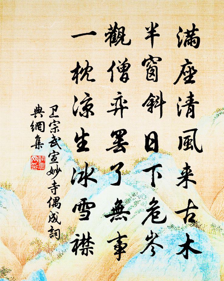 詩詞名句歷史字典書法欣賞書法字典國語詞典說文解字康熙字典古漢語字典標 題 作 者 詩 句 宣妙寺偶成作者:衛宗武 朝代:宋代宣妙寺偶成原文滿座清風來古木,半窗斜日下危岑。觀僧弈罷了無事,一枕涼生冰雪襟。詩詞問答問:宣妙寺偶成的作者是誰?答:衛宗武問:宣妙寺偶成寫於哪個朝代?答:宋代衛宗武宣妙寺偶成書法欣賞宣妙寺偶成書法作品詩詞推薦頌古三十九首釋道樞〔宋代〕鐘鼓聲聲已喚齋,堂前作舞老公家。雖然一缽充飢困,不覺牙生滿口沙。偈頌一百零四首釋紹曇〔宋代〕道至無難,惟嫌揀擇。混俗通真,騎聲蓋色。近在口皮邊,遠過河沙國。慈明揭示,借鬼畫桃符。雪竇標題,去猊送荊湖北漕張職方宋祁〔宋代〕賜對雲簾幾刻留,東南公利入牙籌,方船萬粟浮江下,封府三錢出地流。驛路塵清迎弩密,省台薰歇護衣愁。不妨甘菊冷淘王禹偁〔宋代〕經年厭粱肉,頗覺道氣渾。孟春奉齋戒,敕廚唯素飱。淮南地甚暖,甘菊生籬根。長芽觸土膏,小葉弄晴暾。采采宿農家戴復古〔宋代〕宿此屋頭閣,瓦窗通月明。夜深鸜鵒噪,人靜桔槔聲。村落有古意,田園關客情。儒衣成底事,所得是虛名。西泠橋題畫李流芳〔明代〕多寶峰頭石欲摧,西泠橋邊樹不開。輕煙薄霧斜陽下,曾泛扁舟小築來。接待釋崇岳〔宋代〕茶飯家常沒可陪,臨機元不在安排。門前有客來相訪,試問朝從何處來。頌古四十四首釋法泰〔宋代〕窣堵波成賞匠人,工錢一二與三文。可憐眼裡無筋者,當面定將數目分。戲呈趙可父華岳〔宋代〕少年場屋擅詞鋒,審讞無私只奉公。夜月蘭宮無宿曜,秋霜蓮幕有春風。明堂難毀周公制,鄉校猶存子產功。文德和邵觀復見贈黃公度〔宋代〕詩才千丈清且嵬,筆力萬牛挽不回。平生用心有根柢,丱角指南得天才。江西波瀾浩如海,一派流落天南垓。久謂偈頌四十一首釋普寧〔宋代〕每年三月十八,憶著痛恨入骨。巨福山上望凌霄,萬重山海煙波闊。謾爇一炷兜羅木,唵,噴噴{左口右發}{左兩同心(二之二·大石調)柳永〔宋代〕佇立東風,斷魂南國。花光媚、春醉瓊樓,蟾彩回、夜遊香陌。憶當時、酒戀花迷,役損詞客。別有眼長腰搦。痛哭林艾軒陳俊卿〔宋代〕出為嶺嶠澄清使,歸作甘泉侍從臣。百擔有書行李重,千金無產橐中貧。代別情人李白〔唐代〕清水本不動,桃花發岸傍。桃花弄水色,波盪搖春光。我悅子容艷,子傾我文章。風吹綠琴去,曲度紫鴛鴦。昔作和外舅夙興三首黃庭堅〔宋代〕暑逐池蓮盡,寒隨塞雁來。衣裘雖得暖,狐貉正相哀。僧汲轆轤曉,車鳴關鎖開。不因朝鼓起,來帙亂書堆。弄琴詩 一庾信〔南北朝〕雉飛催晚別。烏啼驚夜眠。若交新曲變。惟須促一弦。靈台佚名〔先秦〕經始靈台,經之營之。庶民攻之,不日成之。經始勿亟,庶民子來。王在靈囿,麀鹿攸伏。麀鹿濯濯,白鳥翯翯。燈花魏野〔宋代〕豈假栽培力,自然殊眾芳。開非因雨露,落不為風霜。雞似殘鶯囀,蛾如宿蝶狂。丹心塵豈染,明焰霧難藏。墮睫病中秋懷寄襲美陸龜蒙〔唐代〕病容愁思苦相兼,清鏡無形未我嫌。貪廣異蔬行徑窄。故求偏藥出錢添。同人散後休賒酒,雙燕辭來始下簾。更有次張伯信韻題吳園畫軸蔡戡〔宋代〕誰把吳園較輞川,畫圖猶復想當年。要知故國非喬木,文採風流尚宛然。名句推薦無那塵緣容易絕,燕子依然,軟踏簾鉤說。納蘭性德《蝶戀花·辛苦最憐天上月》 夫淺知之所爭者,末矣。列子及其弟子《列子·說符》 粉骨碎身全不怕,要留清白在人間。于謙《石灰吟》 大雪壓青松,青松挺且直。陳毅《青松》 縞素酬家國,戈船決死生!夏完淳《即事·復楚情何極》 落花狼藉酒闌珊,笙歌醉夢間。李煜《阮郎歸·呈鄭王十二弟》 下床著新衣,初學小姑拜。毛鉉《 * 詞·下床著新衣》 江雨霏霏江草齊,六朝如夢鳥空啼。韋莊《台城》 商女不知亡國恨,隔江猶唱後庭花。杜牧《泊秦淮》 淚眼問花花不語,亂紅飛過鞦韆去。歐陽修《蝶戀花·庭院深深深幾許》