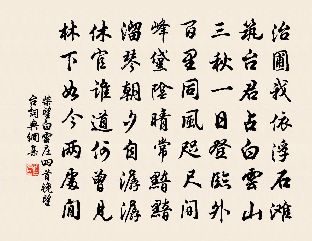 詩詞名句歷史字典書法欣賞書法字典國語詞典說文解字康熙字典古漢語字典標 題 作 者 詩 句 白雲莊四首晚望台作者:柴望 朝代:宋代白雲莊四首晚望台原文治圃我依浮石灘,築台君占白雲山。三秋一日登臨外,百里同風咫尺間。峰黛陰晴常黯黯,溜琴朝夕自潺潺。休官誰道何曾見,林下如今兩處閒。詩詞問答問:白雲莊四首晚望台的作者是誰?答:柴望問:白雲莊四首晚望台寫於哪個朝代?答:宋代柴望白雲莊四首晚望台書法欣賞白雲莊四首晚望台書法作品詩詞推薦送僧入五泄貫休〔唐代〕五泄江山寺,禪林境最奇。九年吃菜粥,此事少人知。山響僧擔谷,林香豹乳兒。伊余頭已白,不去更何之。偶題喻良能〔宋代〕少陵五十六,負暄候樵牧。我今年與齊,而亦處幽獨。小亭數椽淨,新月半鉤曲。聊將萬斛愁,付與一杯綠。送棋僧惟照文同〔宋代〕學成九章開方訣,誦得一行乘除詩,自然天性曉絕藝,可敵國手應吾師。窗前橫榻擁爐處,門外大雪壓屋時,獨翻宮詞張籍〔唐代〕新鷹初放兔猶肥,白日君王在內稀。薄暮千門臨欲鎖,紅妝飛騎向前歸。黃金捍撥紫檀槽,弦索初張調更高。盡理念奴嬌劉過〔宋代〕並肩樓上,小闌乾、猶記年時憑處。百歲光陰彈指過,消得幾番寒暑。鵲去橋空,燕飛釵在,不見穿針女。老懷淒贈陝縣薛偕主簿魏野〔宋代〕少年來作簿,英俊復誰如。好事雖聞舊,能官不覺初。耽憂因稼穡,廢寢為詩書。客戀門前住,民欣部內居。親科書手實簿方岳〔宋代〕隨緣常住薄於秋,不了鍾魚粥飯頭。嘆息結繩人遠矣,例教吾負剡藤羞。佐郡思舊遊岑參〔唐代〕幸得趨紫殿,卻憶侍丹墀。史筆眾推直,諫書人莫窺。平生恆自負,垂老此安卑。同類皆先達,非才獨後時。庭槐文與可嘗雲老僧墨竹一派近在湖州吾竹雖不及黃庭堅〔宋代〕東坡雖是湖州派,竹石風流各一時。前世畫師今姓李,不妨還作輞川詩。韓省乾子平薦章應格朋友漠然未知忽改京秩作蘇籀〔宋代〕山雌澤啄競騰軒,孰有昂朐局短轅。造物至公殊弗置,窮交未喻枉焦煎。鳳批一諾膺天陟,馬頸三槃朝日邊。虎鼠挽李樓山觀文三首李曾伯〔宋代〕相從劍南幕,公壯我丁年。寘彼諸生後,薦之明主前。承顏台袞近,托跡午橋邊。壤廈千秋隔,潸然老淚漣。偈頌二十一首釋堅璧〔宋代〕釋迦慳,迦葉富。欺負乎人,誇張莽鹵。五天不納到 * ,塞壑填溝無避處。無避處,不遮護,汲興相逢,如塗毒雪行寄褒子韋應物〔唐代〕淅瀝覆寒騎,飄颻暗川容。行子郡城曉,披雲看杉松。昆岳有佳人四章壽黃循齋陽枋〔宋代〕昆岳有佳人,挺挺雲中鶴。帝鄉回騖心,人寰寓其吒。仰雲引圓吭,九皋窮碧落。瀛湘滄海身,稻梁寄情薄。昨夢滿江紅 為張右丞壽二首魏初〔元代〕梁甫孤吟,已認得、真龍頭角。記當日、江山如畫,一時英略。立馬便談天下事,鳳池十倍揚州鶴。更詩書萬卷豁竹里館王維〔唐代〕獨坐幽篁里,彈琴復長嘯。深林人不知,明月來相照。浣溪沙汪莘〔宋代〕青女催人兩鬢霜。自篘白酒作重陽。方壺老子莫淒涼。天地兩三胡蝶夢,古今多少菊花香。只將破帽送秋光。菩薩蠻謝逸〔宋代〕縠紋波面浮鸂涑力鳥,。蒲芽出水參差碧。滿院落梅香。柳梢初弄黃。衣輕紅袖皺。春困花枝瘦。睡起玉釵橫。隔金剛隨機無盡頌化無所化分第二十五釋印肅〔宋代〕杯涵落廣弓,疑蛇病腹中。一切著眼壞,誰肯學真空。題胡氏南園精舍黎廷瑞〔宋代〕平泉竹石墮荒蕪,金谷池台莽廢墟。今古茫茫竟誰屋,乾坤吶吶有吾廬。溪山圍座醉留客,燈火隔林聞讀書。此樂名句推薦鏡湖三百里,菡萏發荷花。李白《子夜吳歌·夏歌》 台高不盡看楓葉,院淨何須坐菊花。沈輅《九日登高台寺》 人面不知何處去,桃花依舊笑春風。崔護《題都城南莊》 行到小溪深處,有黃鸝千百。秦觀《好事近·夢中作》 照野旌旗,朝天車馬,平沙萬里天低。周密《高陽台·送陳君衡被召》 殘雪庭陰,輕寒簾影,霏霏玉管春葭。王沂孫《高陽台·和周草窗寄越中諸友韻》 輕陰池館水平橋,一番弄雨花梢。陳子龍《畫堂春·雨中杏花》 梧桐半死清霜後,頭白鴛鴦失伴飛。賀鑄《半死桐·重過閶門萬事非》 悲歌可以當泣,遠望可以當歸。佚名《悲歌》 而今燈漫掛。不是暗塵明月,那時元夜。蔣捷《女冠子·元夕》