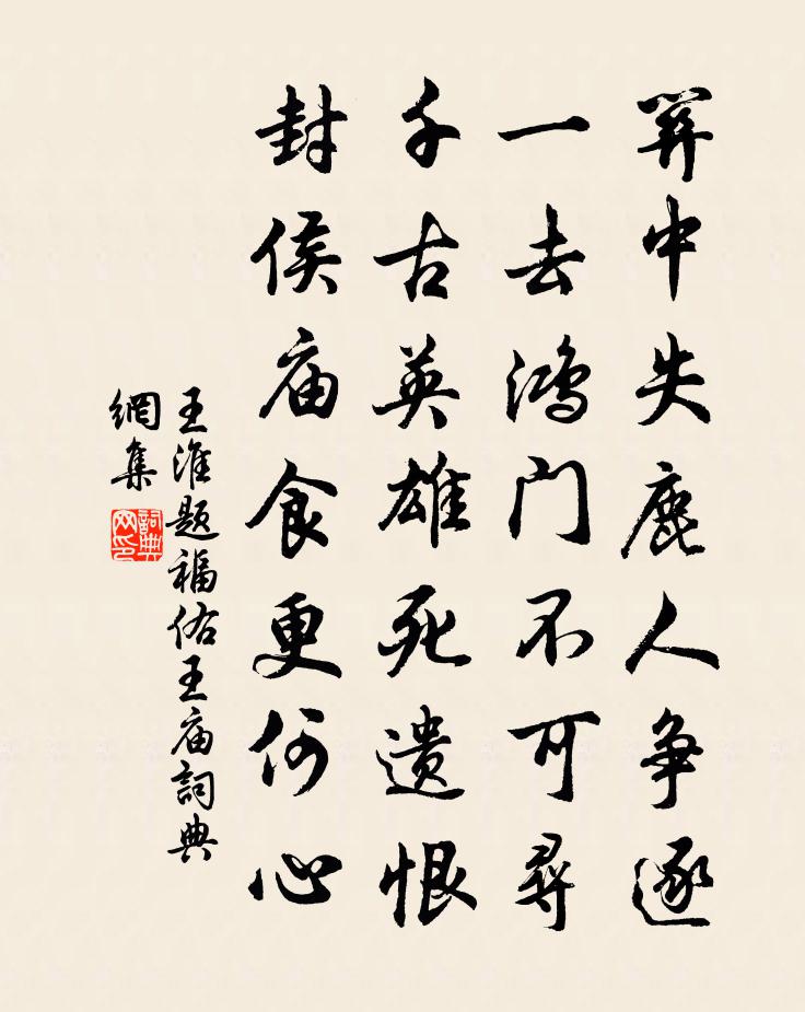 詩詞名句歷史字典書法欣賞書法字典國語詞典說文解字康熙字典古漢語字典標 題 作 者 詩 句 題福佑王廟作者:王淮 朝代:宋代題福佑王廟原文關中失鹿人爭逐,一去鴻門不可尋。千古英雄死遺恨,封侯廟食更何心。詩詞問答問:題福佑王廟的作者是誰?答:王淮問:題福佑王廟寫於哪個朝代?答:宋代王淮題福佑王廟書法欣賞題福佑王廟書法作品詩詞推薦【仙呂】一半兒 題情關漢卿〔元代〕銀檯燈滅篆煙殘,獨入羅幃淹淚眼。乍孤眠好教人情興懶。薄設設被兒單,一半兒溫和一半兒寒。唐伯虎與祝枝山聯句詠奇石唐寅〔明代〕嵯峨怪石倚雲間,拋擲於今定幾年。苔蘚作毛因雨長,藤蘿穿鼻任風牽。 從來不食溪邊草,自古難耕隴上田。恨挽趙南塘方大琮〔宋代〕初開學禁預招延,俄滯周南四十年。大振文詞驚海內,肯將訓詁讓儒先。孤忠自許漢遺老,高氣直凌唐謫仙。鳳昔南歌子(夜坐)趙長卿〔宋代〕霜結凝寒夜,星輝識曉晴。蘭膏重剔且教明。為照梢頭香縷、一絲輕。坐久看看困,新詞綴未成。梅花熏得酒初醒興元府園亭雜詠凝雲榭文同〔宋代〕朝雲南山吐,暮雲北山翕。來往高榭中,留者頗堆積。坐客如久之,去須襟袖濕。與處慶老若圭游雪竇杖錫二首陳著〔宋代〕坐斷青蓮七寶池,又攜鐵錫踏嵌崎。一千丈雪與心照,二十里雲隨步飛。崖壁遍留吟墨跡,樵芻爭看袒紅衣。山林聞落葉齊己〔唐代〕楚樹雪晴後,蕭蕭落晚風。因思故國夜,臨水幾株空。煮茗燒乾脆,行苔踏爛紅。來年未離此,還見碧叢叢。和德施賞金沙胡寅〔宋代〕籠紗未暗塵,錦幄又經春。有艷曉酣酒,無言時惱人。後先爭絢倩,開落自仍頻。相對長松樹,香心結蕊新。沛公歌梅堯臣〔宋代〕赤帝醉提龍劍行,徑草沒人壯士驚。白蛇斷裂不可續,神嫗哀哀夜深哭。酒醒自負氣生虹,從者日畏天下雄。秦皇成都運司西園亭詩潺玉亭許將〔宋代〕引泉注清渠,潺潺潄寒玉。側出閬風遲,驟驚江雨速。飛瀨乍揚白,櫂木細涵綠。晝夜聲不止,肯效楚人哭。玉樓春毛並〔宋代〕曲房小院匆匆過。急鼓疏鍾催又去。來如春夢幾多時,去似朝雲無覓處。金瓶落井翻相誤。可惜馨香隨手故。錦囊送赴省諸友方雲卿昆仲劉克莊〔宋代〕先朝取士尚雕蟲,前輩皆因此顯融。衡鑑集中推范老,混成篇里得沂公。杏園飲暢鶯聲早,梨嶺飛高雁影同。歲晚韋譙公輓歌二首張說〔唐代〕五瑞分王國,雙珠映後家。文飛書上鳳,武結笥中蛇。出豫榮前馬,回鸞喪後車。袞衣將錫命,泉路有光華。國騁步西湖次韻徐南卿陳造〔宋代〕徐子學詩苦,硯池寧暫臨。課功初贔屓,著語遽精深。更積歲月力,儻陪英俊林。人生才業地,渠輩分平沈。東宮出示和御製秋懷詩恭和二首周必大〔宋代〕寒露零太空,清時出少海。昭融備萬象,眾目眩符彩。二南可無愧,一字不容改。金聲玉振之,遼邈慶霄籟。毫芒送孫子高王安石〔宋代〕蕩漾江南客,融怡席上珍。一樽相別酒,千里獨歸人。客路貧堪病,交情遠更親。自慚兒女意,失淚滴衣巾。霜天曉角趙師俠〔宋代〕雨餘風勁。霧重千山暝。茅舍寒林相映。分明是、圖畫景。去程何日定。天遠長安近。喚起新愁無盡。全沒個、故春閒戲書三首李新〔宋代〕春天行樂若為傷,青鬢吹蓬半染霜。莫道一生甘淡薄,十年前亦為春狂。自湘赴廣道間雜詠蟠松李曾伯〔宋代〕紅紫競芳叢,中蟠一古松。春風自來去,吹不勸蒼龍。六朝門元帝周曇〔唐代〕木柵江城困魏軍,王褒橫議遏謀臣。賓降未免俱為戮,一死安能謝益仁。名句推薦知而好問,然後能才。荀子《荀子·儒效》 白日淪西河,素月出東嶺。陶淵明《雜詩十二首·其二》 夢裡不知身是客,一晌貪歡。李煜《浪淘沙令·簾外雨潺潺》 是故置本不安者,無務豐末。墨子《墨子·02章 修身》 燈前目力雖非昔,猶課蠅頭二萬言。陸游《讀書》 春風江上路,不覺到君家高啟《尋胡隱君》 大雪北風催,家家貧白屋。環山樵《薛寶釵·雪竹》 身有傷,貽親憂。德有傷,貽親羞。李毓秀《弟子規·入則孝》 層樓望,春山疊;家何在?辛棄疾《滿江紅·點火櫻桃》 春日遲遲,卉木萋萋。佚名《出車》