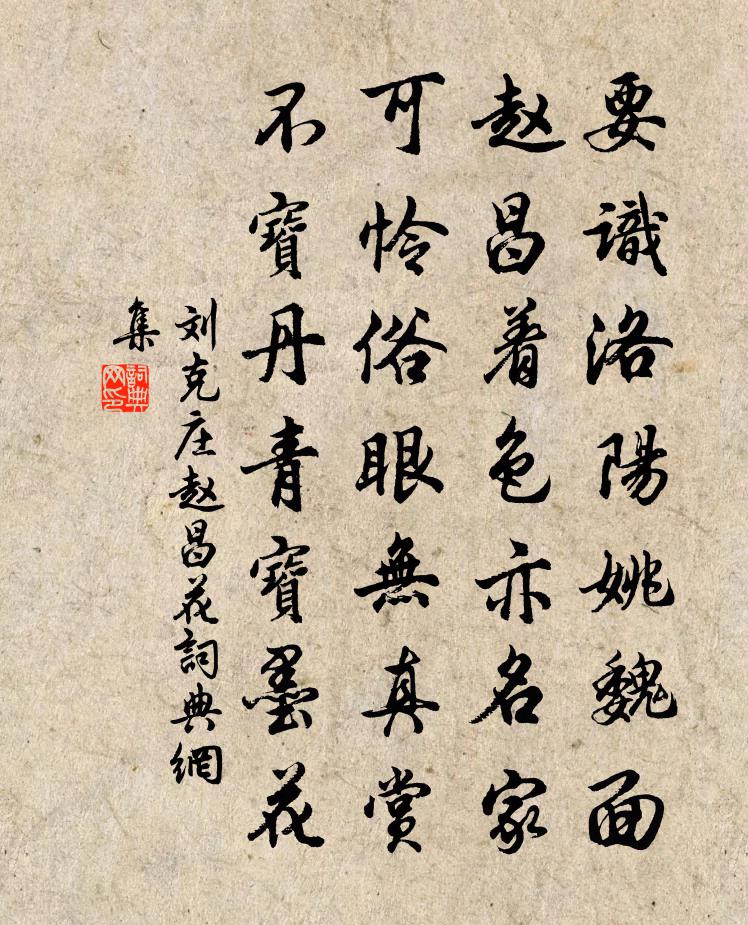 詩詞名句歷史字典書法欣賞書法字典國語詞典說文解字康熙字典古漢語字典標 題 作 者 詩 句 趙昌花作者:劉克莊 朝代:宋代趙昌花原文要識洛陽姚魏面,趙昌著色亦名家。可憐俗眼無真賞,不寶丹青寶墨花。詩詞問答問:趙昌花的作者是誰?答:劉克莊問:趙昌花寫於哪個朝代?答:宋代問:劉克莊的名句有哪些?答:劉克莊名句大全劉克莊趙昌花書法欣賞趙昌花書法作品詩詞推薦題劉叔驥夢遊赤壁賦後二首趙蕃〔宋代〕江湖知友亦云多,每嘆風流奈若何。水落故知當石出,鏡中寧惜鬢將皤。贈術士龔恢乙魏了翁〔宋代〕龔生來過我,極意論先天。自得環中趣,無言已十年。山中逢道士雲公孟浩然〔唐代〕春餘草木繁,耕種滿田園。酌酒聊自勸,農夫安與言。忽聞荊山子,時出桃花源。采樵過北谷,賣藥來西村。村煙薺餛飩洪咨夔〔宋代〕嫩斸苔邊綠,甘包雪裹春。蕭家湯是祖,束叟餅為鄰。混沌函三極,沖和貯一真。日斜摩腹睡,自謂葛天民。春晚出遊陸游〔宋代〕禹吾無間聖所嘆,治水殆與天同功。三千年事一炊頃,窆石嵯峨煙靄中。惜芳菲邵雍〔宋代〕細筭人間千萬事,皆輸花底共開顏。芳菲大率一春內,爛漫都無十日間。亦恐憂愁為齟齬,更防風雨作艱難。莫教獨酌權德輿〔唐代〕獨酌復獨酌,滿盞流霞色。身外皆虛名,酒中有全德。風清與月朗,對此情何極。使東川江上行元稹〔唐代〕悶見漢江流不息,悠悠漫漫竟何成。江流不語意相問,何事遠來江上行。阮郎歸晏幾道〔宋代〕晚妝長趁景陽鍾,雙娥著意濃。舞腰浮動綠雲濃,櫻桃半點紅。憐美景,惜芳容,沉思暗記中。春寒簾幕幾重重,偈頌一百零二首釋紹曇〔宋代〕秘魔擎叉,俱胝豎指。邪法難扶,如何得是。山僧冷地思量,不覺吞聲飽氣。攻乎異端,斯害也矣。偈頌八十七首釋慧開〔宋代〕一著高一著,一步闊一步。撥轉上頭關,乾坤全體露。白居易有望闕雲遮眼思鄉雨滴心之句用其韻為鄭剛中〔宋代〕憶昨離帝都,一別遂如雨。莊舄雖不病,亦作越人語。茅屋終夜寒,單衣書還暑。荷葉未全蛀,桃花已微吐。西湖聞高平公殂謝述哀感舊以助輓歌三首梅堯臣〔宋代〕文章與功業,有志不能成。嘗以隮高位,終然屈大名。遺風猶可見,逝水更無情。歸卜青烏瓏,韓城苦霧平。言志釋文珦〔宋代〕山中良自好,住久樂已成。山木有嘉蔭,山禽無俗聲。永言辭世路,世路多不平。亦以性疎懶,不能但勞生。少年游晁補之〔宋代〕如今田野謾拋春。紅雨掩衡門。懶讀詩書,欠伸扶杖,几案任生塵。縱教便向東山老,誰知是箇中人。莫怪年來,鐘山劉有慶〔宋代〕蟠龍垂顧飲江湄,臥護宗祧彼一時。馬渡已嗟南國蹙,猿驚何暇北山移。郊壇曾祝千年運,塔廟空留異代悲。北望湖上劉過〔宋代〕五行撩我到錢塘,花底題詩句亦香。莫惜高吟三十韻,敢煩詩伯為平章。偈頌二百零五首釋正覺〔宋代〕皓然雪月淨無埃,一色功中更放開。喚起牧童蓑底夢,白牛鼻孔拽教回。送通判太博梅堯臣〔宋代〕相見不在久,見久未必親。無為歲月淺,豈不膠漆均。猶嗟欲別日,事疊如排鱗。安得獨攜酒,遠送秋水濱。梁州令疊韻/梁州令晁補之〔宋代〕田野閒來慣。睡起初驚曉燕。樵青走掛小簾鉤,南園昨夜,細雨紅芳遍。平蕪一帶煙光淺。過盡南歸雁。俱遠。憑名句推薦臨水整烏紗。兩鬢蒼華。故鄉心事在天涯。吳琚《浪淘沙·岸柳可藏鴉》 別離在今晨,見爾當何秋。韋應物《送楊氏女》 人言落日是天涯,望極天涯不見家。李覯《鄉思》 朔方三度重陽節,河曲乾旌歲歲忙。齊之鸞《九日登清水營城》 楊柳散和風,青山澹吾慮。韋應物《東郊》 量大禍不在,機深禍亦深。佚名《增廣賢文·下集》 歌里千重意,才欲歌時淚已流,恨應更、多於淚杜安世《卜運算元·樽前一曲歌》 十日雨絲風片裡,濃春艷景似殘秋。王士禎《秦淮雜詩二十首·其一》 龜言此地之寒,鶴訝今年之雪。庾信《小園賦》 坑灰未冷山東亂,劉項原來不讀書。章碣《焚書坑》