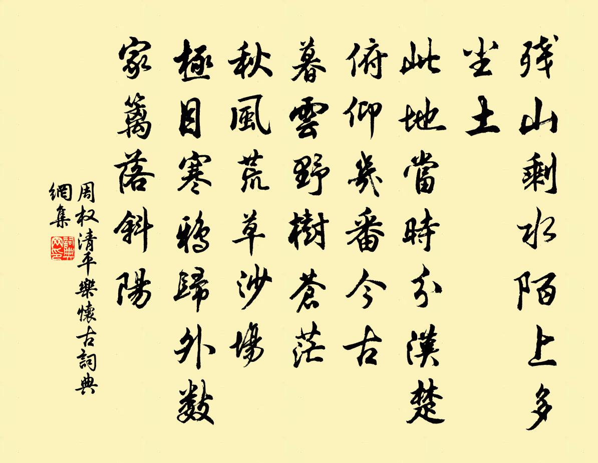詩詞名句歷史字典書法欣賞書法字典國語詞典說文解字康熙字典古漢語字典標 題 作 者 詩 句 清平樂 懷古作者:周權 朝代:元代清平樂 懷古原文殘山剩水,陌上多塵土。此地當時分漢楚。俯仰幾番今古。暮雲野樹蒼茫。秋風荒草沙場。極目寒鴉歸外,數家籬落斜陽。詩詞問答問:清平樂 懷古的作者是誰?答:周權問:清平樂 懷古寫於哪個朝代?答:元代問:清平樂 懷古是什麼體裁?答:詞周權清平樂 懷古書法欣賞清平樂 懷古書法作品詩詞推薦和明叔游白龍溪司馬光〔宋代〕溪深荒徑微,尋勝不知疲。寒月影隨馬,曉風冰滿髭。行歌被褐叟,聚戲拾薪兒。外野饒真趣,令人襟抱夷。千金意琴精〔宋代〕音音音。音音你負心。你真負心。孤負我到如今。記的年時,低低唱、淺淺斟。一曲值千金。如今寂寞古牆陰。秋次韻謝董君讀予詩稿方回〔宋代〕宇宙茫茫戰馬塵,中原文獻不無人。詩裁彩筆天公妒,書擁青燈夜氣神。簁雨簸風六月冷,磔雲裂霧千峰新。何當再送潘恭叔樓鑰〔宋代〕我似冥鴻弋猶慕,君如放鶴去還歸。秋空今日真成去,好伴閒雲自在飛。秋日釋文珦〔宋代〕秋氣清如此,閒蹤信所如。因窮流水脈,偶到野僧居。地遠囂紛息,山迴響答虛。幾人來不得,老死向塵車。醉桃源/阮郎歸王庭珪〔宋代〕朱門映柳畫簾垂。門前聞馬嘶。主人新著綠袍歸。天恩下玉墀。憑翠袖,拈花枝。勸教人醉時。請君聽唱碧雲詞。贈種徵君收孫僅〔宋代〕雄文英概比君難,二十高名滿世間。飛詔幾回來北闕,草玄終不出南山。詩篇落處風雷動,筆力停時造化閒。仙術青感林景熙〔宋代〕柳花袞雪春冥冥,溪風一夜吹為萍。萍隨風去渺流水,人生無根亦如此。故山入夢草芊芊,半窗疏雨寒食天。曉來留題清渭樓黃孝先〔宋代〕黃公愛山不知休,終日不下清渭樓。與官落得官下隱,愛山不得山中游。朝看暮看山更好,古人今人空自老。天生奉和晦日幸昆明池應制李乂〔唐代〕玉輅尋春賞,金堤重晦游。川通黑水浸,地派紫泉流。晃朗扶桑出,綿聯杞樹周。烏疑填海處,人似隔河秋。劫盡淵明祠顧祿〔宋代〕葛巾漉酒艷流霞,長向東籬醉菊花。不分宋公移晉祚,只將甲子紀年華。祝英台近·北固亭岳珂〔宋代〕澹煙橫,層霧斂。勝概分雄占。月下鳴榔,風急怒濤颭。關河無限清愁,不堪臨鑒。正霜鬢、秋風塵染。 漫登覽木犀花羅與之〔宋代〕秋影連蜷隱士攀,渾無蜂蝶涴林間。何人說與陶元亮,未必東籬勝小山。題范蠡五湖圖李曾伯〔宋代〕美婦天下有,忠臣古來稀。去國不潔名,避世良知幾。寧侶我舟楫,毋著君宮闈。平生萬事足,偕老五湖歸。相和歌辭長門怨劉言史〔唐代〕獨坐爐邊結夜愁,暫時恩去亦難留。手持金箸垂紅淚,亂撥寒灰不舉頭。次韻和程少卿省宿寄齊熙業少卿陳襄〔宋代〕名卿猶此滯間曹,賁育何須舉一毫。夜直甘泉西掖近,曉趨嶢闕北辰高。蒙莊吏隱機心息,老杜詩成筆力豪。只恐讀阮籍傳一首劉克莊〔宋代〕言出勿令圭有玷,舌捫不及駟難追。阮公托醉勸進表,龐老無名受禪碑。和束熙之雨後王令〔宋代〕獵獵風吹雨氣腥,誰翻碧海踏天傾。如何農畯三時望,只得官蛙一處鳴。何處斷虹殘冷落,有時斜照暫分明。當車書興四首汪炎昶〔宋代〕積陰斂荒霾,崖崿詭秘聞。潑光潤綠洋,錯彩嵐翠閃。蘚槎驚鶻巢,露撲裹蟲繭。布棋出出廬,漬墨凝鴉點。每恨惜黃花許將〔宋代〕雁聲晚斷。寒霄雲卷。正一枝開,風前看,月下見。花占千花上,香笑千香淺。化工與、最先裁翦。誰把瑤林,閒名句推薦人異而心異,擇其弱者以攻之,其神必潰。來俊臣《羅織經·問罪卷第十》 內省不疚,夫何憂何懼!孔子弟子《論語·顏淵篇》 人悄悄,簾外月朧明。岳飛《小重山·昨夜寒蛩不住鳴》 淡泊以明志,寧靜而致遠。羅貫中《三國演義·第三十七回》 清愁滿眼共誰論。卻應台下草,不解憶王孫。李之儀《臨江仙·登凌歊台感懷》 知君獨坐青軒下,此時結念同所懷。李白《早秋單父南樓酬竇公衡》 滿川風雨獨憑欄,綰結湘娥十二鬟。黃庭堅《雨中登岳陽樓望君山》 落花水香茅舍晚,斷橋頭賣魚人散。馬致遠《壽陽曲·遠浦帆歸》 美人梳洗時,滿頭間珠翠。鄭遨《富貴曲》 事不三思終有悔,人能百忍自無憂。馮夢龍《醒世恆言·卷三十四》
