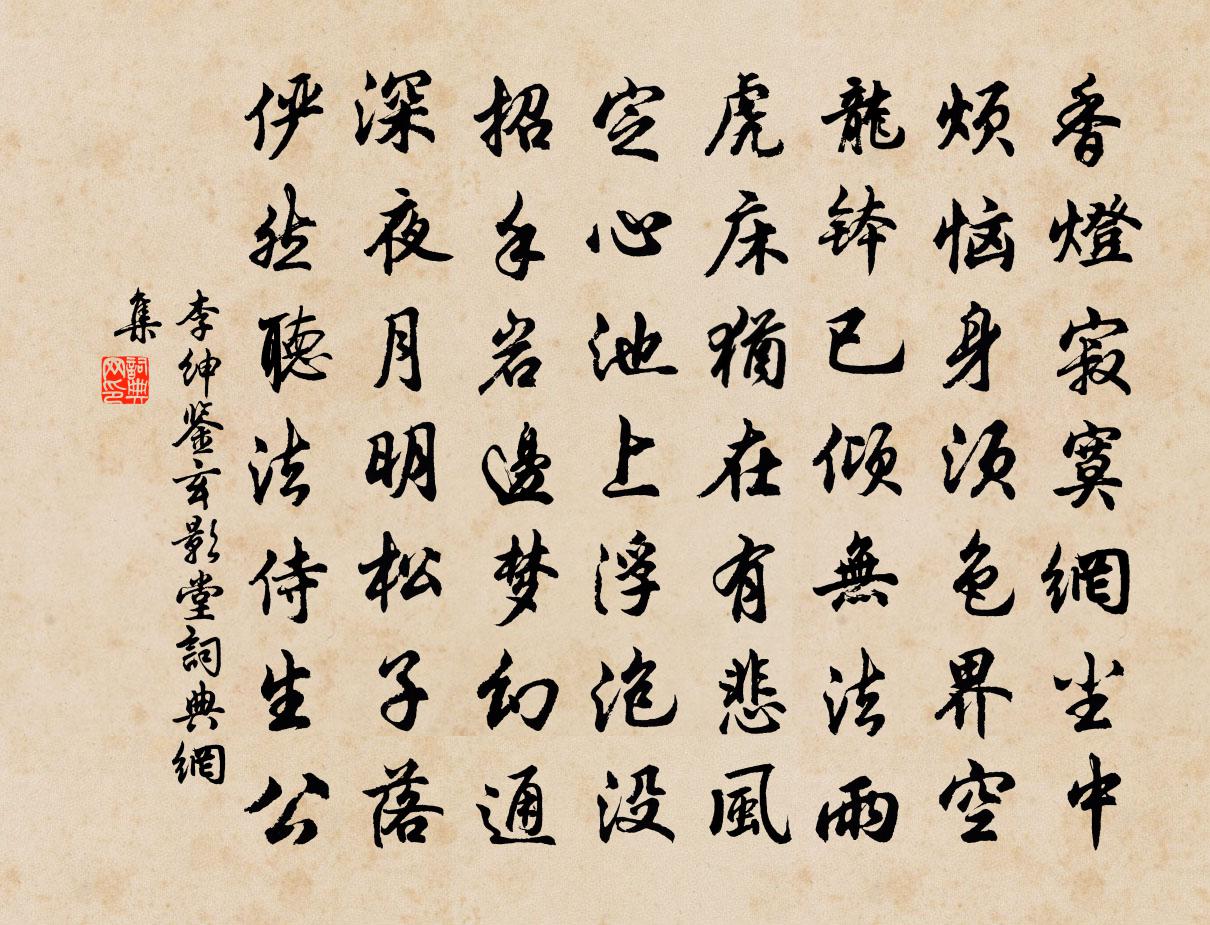 詩詞名句歷史字典書法欣賞書法字典國語詞典說文解字康熙字典古漢語字典標 題 作 者 詩 句 鑒玄影堂作者:李紳 朝代:唐代鑒玄影堂原文香燈寂寞網塵中,煩惱身須色1~1界空。龍缽已傾無法雨,虎床猶在有悲風。定心池上浮泡沒,招手岩邊夢幻通。深夜月明松子落,儼然聽法侍生公。詩詞問答問:鑒玄影堂的作者是誰?答:李紳問:鑒玄影堂寫於哪個朝代?答:唐代問:鑒玄影堂是什麼體裁?答:七律李紳鑒玄影堂書法欣賞鑒玄影堂書法作品注釋全唐詩:卷482-12詩詞推薦禪人並化主寫真求贊釋正覺〔宋代〕默有心傳,休將相觀。煙巢鶴夢,月窟蟾寒。靜里萬緣藏鼻孔,笑中百事見眉端。而今鬚髮點半白,向道叢林歷百述字迴文偈七首宋太宗〔宋代〕舊前憂依述,最亨知休以。祐然留希佛,背生推求比。白菊許棠〔唐代〕所尚雪霜姿,非關落帽期。香飄風外別,影到月中疑。發在林凋後,繁當露冷時。人間稀有此,自古乃無詩。次韻景彝奉慈廟孟秋攝事二十韻梅堯臣〔宋代〕閟宮初告饗,駕輅已迎秋。公袞惟時攝,齋廬用爾休。椒漿茲往奠,鸞馭或來游。任姒徽音繼,邦家故事修。前期人月圓 寄 源芝田禪師 北曲聊樂府前集今張可久〔元代〕龍湫山上雲屯寺,別是一乾坤。檜參百丈,雪深半尺,梅瘦三分。幾時親到,松邊弄水,月下敲門。相思無奈,煙和吳微明疏影橫斜水清淺七詠韻李呂〔宋代〕避俗淵明心會景,只詠孤松秀冬嶺。爭識槎牙竹外枝,月上空階間金影。高陽台張炎〔宋代〕榛中,故未有亦猶今之視昔之感,復嘆葛嶺賈相之故廬也。古木迷鴉,虛堂起燕,歡游轉眼驚心。南圃東窗,酸風竟陵夢野亭在子城西南角一目而盡雲夢之野最張耒〔宋代〕高甍巨桷壓城闉,平視如將七澤吞。幾度春光招宋玉,碧闌乾外獨消魂。贈眼醫婆羅門僧劉禹錫〔唐代〕三秋傷望眼,終日哭途窮。兩目今先暗,中年似老翁。看朱漸成碧,羞日不禁風。師有金篦術,如何為發蒙。賀田僕射子弟榮拜金吾楊巨源〔唐代〕五侯恩澤不同年,叔侄朱門L K 連。鳳沼九重相喜氣,雁行一半入祥煙。街衢燭影侵寒月,文武珂聲疊曉天。浣溪沙(泛舟還余英館)毛滂〔宋代〕煙柳風蒲冉冉斜。小窗不用著簾遮。載將山影轉灣沙。略彴斷時分岸色,蜻蜓立處過汀花。此情此水共天涯。頌古二十四首釋勝〔宋代〕南泉王老太無端,卻逐鹽官作樂官。西祖令嚴行禁止,免他禪會錯欣歡。送李琴士據梧李曾伯〔宋代〕流水高山爾調,冷灰槁木吾心。不必神交蒙叟,柴桑老子知音。戲寇君二首陳師道〔宋代〕南鄰歌舞隔牆聽,想對朝窗暈倒青。莫望喚人看娜嫋,只憑幽夢寄丁寧。句許玠〔宋代〕興隨流水遠。高起居知廣州楊億〔宋代〕作藩南越古稱雄,五管皆歸節製中,腰佩金龜三品綬,船開書鷁一帆風。橘官手版趨塵遠,梅使星車附信通。暫阻句吳炯〔宋代〕誰知吾子被棱粥,壓倒東坡玉糝羹。送極太初住鄞江寶嚴釋文珦〔宋代〕閫相招惟重,邦人望亦濃。欲開新象教,應掃舊狐蹤。煙水浮瓶錫,雲山慶鼓鍾,寶嚴初變土,遙想雨花重。賀侍郎游志甫〔宋代〕松竹青青耐歲寒,長隨初度喜相看。操同一節冰霜勁,身直三朝柱石安。顧問正資持從橐,佚閒堅乞領祠官。扶危西河·天下事王埜〔宋代〕天下事,問天怎忍如此!陵圖誰把獻君王,結愁未已。少豪氣概總成塵,空餘白骨黃葦。千古恨,吾老矣。東遊曾名句推薦山上層層桃李花,雲間煙火是人家。劉禹錫《竹枝詞九首·其九》 不見南師久,謾說北群空。陳亮《水調歌頭·送章德茂大卿使虜》 春風一夜吹鄉夢,又逐春風到洛城。武元衡《春興》 上馬擊狂胡,下馬草軍書。陸游《觀大散關圖有感》 不如歸去下簾鉤,心兒小,難著許多愁吳淑姬《小重山·謝了荼蘼春事休》 三月休聽夜雨,如今不是催花。張炎《清平樂·采芳人杳》 群芳過後西湖好,狼籍殘紅。歐陽修《採桑子·群芳過後西湖好》 窗含西嶺千秋雪,門泊東吳萬里船。杜甫《絕句》 甚時躍馬歸來,認得迎門輕笑。時彥《青門飲·寄寵人》 野店桃花紅粉姿,陌頭楊柳綠菸絲。趙孟頫《東城》