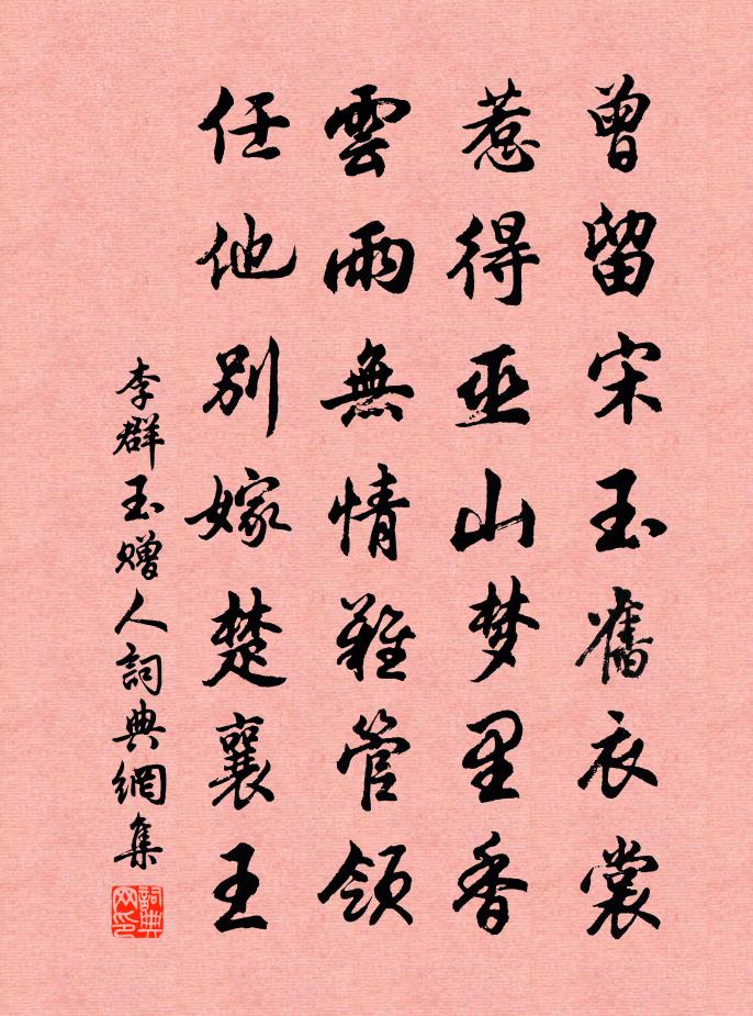 全詩借用宋玉《高唐賦》與《神女賦》的典故寫出。據《高唐賦》與《神女賦》:楚懷王在遊覽雲夢澤台館時,曾經夢遇巫山神女。臨別時,神女告訴懷王,她“旦為朝雲,暮為行雨”。後人便根據神女的話,用“雲雨”來指代男女間的私情。後來宋玉陪侍楚襄王到雲夢澤遊覽,又都曾在夢中會過神女。《贈人》詩開頭兩句即用宋玉夢遇神女之事。詩人將失戀男子比成宋玉,將他所愛女子比成神女。首句以“衣裳”喻文采,暗示受贈者的文採風流一似宋玉。次句接著說,“惹得”神女動情而入夢。神女因宋玉之文採風流而生嚮往之情,入夢自薦。然而,美人的心是變化難測的,就說這位巫山神女吧,她先傾心於懷王,後來又鍾情於襄王。“惹得”二字很有意味,也很有分寸感,又照顧到了對方的體面。後兩句議論,出語真誠,在曠達的勸說中見出對朋友的深情。“雲雨無情難管領”的說法儘管偏頗,但對於失戀中的朋友卻有很強的針對性,不失為一劑清熱疏滯的良藥。