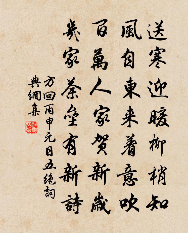 詩詞名句歷史字典書法欣賞書法字典國語詞典說文解字康熙字典古漢語字典標 題 作 者 詩 句 丙申元日五絕作者:方回 朝代:宋代丙申元日五絕原文送寒迎暖柳梢知,風自東來著意吹。百萬人家賀新歲,幾家荼壘有新詩。詩詞問答問:丙申元日五絕的作者是誰?答:方回問:丙申元日五絕寫於哪個朝代?答:宋代方回丙申元日五絕書法欣賞丙申元日五絕書法作品詩詞推薦酬楊汝士尚書喜人移居姚合〔唐代〕未得滄江外,衰殘讀藥書。聖朝優上秩,仁里許閒居。樹對枝相接,泉同井不疏。酬章深自鄙,欲寄復躊躇。歲杪將發楚州呈樂天劉禹錫〔唐代〕楚澤雪初霽,楚城春欲歸。清淮變寒色,遠樹含清暉。原野已多思,風霜潛減威。與君同旅雁,北向刷毛衣。晚皈再度西橋四首楊萬里〔宋代〕皈近溪橋東復東,蓼花迎路舞西風。草深一鳥忽飛起,儂不覺他他覺儂。爇心香 客人樊公索馬鈺〔元代〕三髻山侗。嘆個樊公。販淄礬、苦海波中。要除煩惱,助一帆風。便棄繁華,離燔火,出凡籠。真箇逍遙,真不迷王主簿右州某日思其歸因見黃華動淵明之興方陳宓〔宋代〕夢魂何日不家山,底事淹留數月問。忽見黃華羞泛酒,淵明心事若相關。山中楚辭江淹〔南北朝〕魂兮歸來。異方不可以親。蝮蛇九首。雄虺戴鱗。炎穴一光。骨爛魂傷。玄狐曳尾。赤象為梁。至日歸來。無往此尋張五回夜園作孟浩然〔唐代〕聞就龐公隱,移居近洞湖。興來林是竹,歸臥谷名愚。掛席樵風便,開軒琴月孤。歲寒何用賞,霜落故園蕪。秋涼閒臥白居易〔唐代〕殘暑晝猶長,早涼秋尚嫩。露荷散清香,風竹含疏韻。幽閒竟日臥,衰病無人問。薄暮宅門前,槐花深一寸。寄題喻叔奇國傅郎中園亭二十六詠曲水楊萬里〔宋代〕名園曲水費工夫,玉甃瓊磨滴水無。誰把流觴借詩老,天生九曲一水渠。送章明章善解官奉親還吳中二首王洋〔宋代〕病臥江城五見秋,惟君向我用青眸。廩人白粟長相續,官簿青錢不用求。向日傾心今得意,犯嚴薦口昔徒羞。期君醉蓬萊(重明節丙辰長汝)趙師俠〔宋代〕正金風零露,玉宇生涼,晚秋天氣。華渚流虹,應生商佳瑞。電繞神樞,慶綿宗社,御寶圖宸極。脫屣塵凡,游心題太白祠堂喻良能〔宋代〕倒披綺裘草裹巾,酒醒玉山來映人。明月滄江故無恙,騎鯨何處狎龍鱗。題趙生壁李賀〔唐代〕大婦然竹根,中婦舂玉屑。冬暖拾松枝,日煙生蒙滅。木蘚青桐老,石井水聲發。曝背臥東亭,桃花滿肌骨。柳梢青 以上二首和許有壬詞,附圭塘樂府別許有孚〔元代〕山潤浮嵐。溪清呈底,畫帆無帆。酒友詩朋,香芹鮮鯽,綠橘黃柑。風亭月榭雲庵。更奇品、花盆果籃。城市繁華題太白五松書堂林桷〔宋代〕翰林最愛五松山,長說千年未擬還。而我抗塵良自愧,來游只得片時閒。次劉野泉韻葛起耕〔宋代〕自笑生隨雁影浮,幾經楚尾與吳頭。塞樓角送關山月,湘驛砧敲嶽麓秋。歲月輪如走坂,功名求劍記行舟。即今安十六觀經頌佛菩薩像觀第八釋遵式〔宋代〕諸佛如來法界身,遍入眾生一切想。智者當觀此想心,是心即佛菩薩像。菩薩蠻張元乾〔宋代〕微雲紅襯餘霞綺。明星碧浸銀河水。猗枕畫檐風。愁生草際蛩。雁行離塞晚。不道衡陽遠。歸恨隔重山。樓高莫憑趙君海惠蟳高似孫〔宋代〕早揮鱠手作雲鰲,雪帶晴飛且拍熬。安得輪囷如此壯,也知郭索許我騷。翰林風月從來別,太史江山一味豪。今夜感秋六首鄭獬〔宋代〕軒軒蒼角鷹,殺氣凌高秋。一息一萬里,獨與長風游。獵騎走霹靂,落臂無虛投。古冢白鼻狐,立死不得留。飛霜名句推薦白日依山盡,黃河入海流。王之渙《登鸛雀樓》 寂寥西窗久坐,故人慳會遇,同翦燈語。吳文英《齊天樂·與馮深居登禹陵》 歌泣不成天已暮,悲風日夜起江生。魏禧《登雨花台》 頑老情懷,都無歡事,良宵愛幽獨。吳文英《一寸金·秋感》 生當作人傑,死亦為鬼雄。李清照《夏日絕句》 傷心故人去後,冷落新詩。晁沖之《漢宮春·梅》 平生端有活國計,百不一試薶九京。黃庭堅《送范德孺知慶州》 相馬失之瘦,相士失之貧。司馬遷《史記·滑稽列傳》 弱齡寄事外,委懷在琴書。陶淵明《始作鎮軍參軍經曲阿作》 枕前淚共階前雨,隔個窗兒滴到明。聶勝瓊《鷓鴣天·別情》