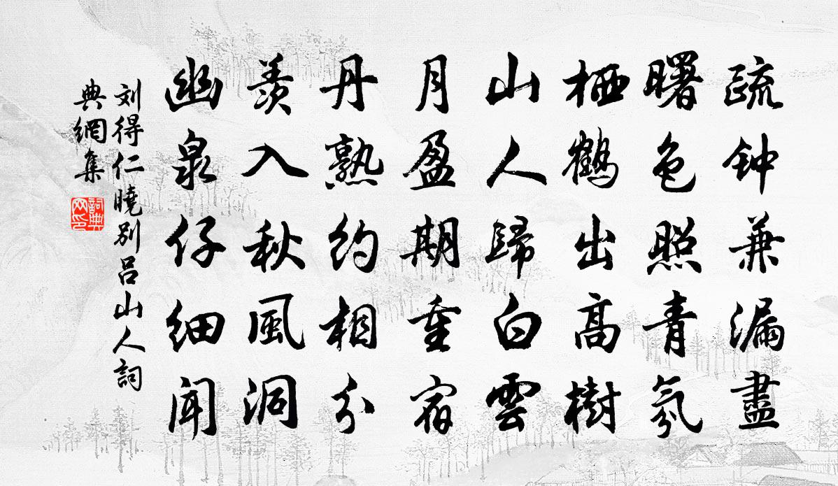 詩詞名句歷史字典書法欣賞書法字典國語詞典說文解字康熙字典古漢語字典標 題 作 者 詩 句 曉別呂山人作者:劉得仁 朝代:唐代曉別呂山人原文疏鍾兼漏盡,曙色照青氛。棲鶴出高樹,山人歸白雲。月盈期重宿,丹熟約相分。羨入秋風洞,幽泉仔細聞。詩詞問答問:曉別呂山人的作者是誰?答:劉得仁問:曉別呂山人寫於哪個朝代?答:唐代問:曉別呂山人是什麼體裁?答:五律劉得仁曉別呂山人書法欣賞曉別呂山人書法作品注釋全唐詩:卷544-10詩詞推薦寒食日過荊山梅堯臣〔宋代〕山郵雖禁火,嶺樹自生煙。鳴咽同歸櫓,悲哀欲問天。泣親非泣玉,流淚劇流泉。春鮆橫刀膾,何心更食鮮。同家弟賦蠟梅詩得四絕句陳與義〔宋代〕韻勝誰能舍,色莊那得親。朝揚一映樹,到骨不留塵。同元錫題琅琊寺韋應物〔唐代〕適從郡邑喧,又茲三伏熱。山中清景多,石罅寒泉潔。花香天界事,松竹人間別。殿分嵐嶺明,磴臨懸壑絕。昏旭七娘子(舟中早秋)毛滂〔宋代〕山屏霧帳玲瓏碧。更綺窗、臨水新涼入。雨短煙長,柳橋蕭瑟。這番一日涼一日。離多綠鬢多時白。這離情、不似和余時中元夕二首王之道〔宋代〕今夕知何夕,熙熙萬室春。歌樓醒醉客,燈市往來人。勸酒行杯促,聯詩得句新。銅壺休見迫,歡笑正相親。金陵雜興二百首蘇泂〔宋代〕江風吹面雪漫漫,二月東風特地寒。四十病身誰役汝,小車搖兀過長乾。次韻千岩雜謠姜夔〔宋代〕平生中散七不堪,鳳塵時時伴燕談。道士有神傳火棗,故人無字入雲藍。雨涼竹葉宜三酌,日落荷花倚半酣。極欲挽費潔堂馬廷鸞〔宋代〕井路璠璵瑞,江乾英簜馳。萬屯孤宿飽,一旅共時危。行地嗟蓬轉,呼天泣黍離。百年公有盡,一慟我非私。朝中措程垓〔宋代〕片段預告飛後水東流。無計挽春留。香小誰栽杜若,夢回依舊揚州。破瓜年在,嬌花艷冶,舞柳纖柔。莫道劉郎霜鬢,採桑子胡銓〔宋代〕山浮海上青螺遠,決眥歸鴻。閒倚東風。疊疊層雲欲盪胸。弄琴細寫清江引,一洗愁容。木杪黃封。賢聖都堪日日立冬節齋宿竹宮悼姚高士程公許〔宋代〕把茅未就橐懸罄,奎畫飛來天雨花。欲職高人歸宿處,佩霞長侍玉皇家。隱逸趙庚夫〔宋代〕落魄蕉衫戴道冠,菖蒲滿案浸清寒。有錢即買丹砂煉,無病猶將素問看。連日游山僧共住,頻年乞米鶴同餐。世間臘月九日雪三絕句蘇轍〔宋代〕去年家釀不須沽,秫米今年絕市無。雪沒前山薇蕨盡,誰憐無語獨攜鋤。贈五祖山淨老王之道〔宋代〕欲知祖意路堂堂,滿目湖山自放光。林涌亂雲迎馬足,峰迴荒磴上羊腸。心花肯逐春同老,法雨何妨歲用康。試向次日皎然〔唐代〕野外有一人,獨立無四鄰。彼見是我身,我見是彼身。遊仙二章范殿撰潔庵先生程公許〔宋代〕空山學仙子,幽獨性成癖。誰令一念差,失腳塵綱密。隨緣習泡影,隱思曉繼夕。了了三生夢,掣電了無跡。豈不九日青陽道中呈張主簿喻良能〔宋代〕重陽時候在青陽,野店山餚對舉觴。菊蕊半開簪鬢好,橘包初破噀人香。西風有意吹紗帽,細雨無情濕錦障。但得還山陽簡相之並示坰吳則禮〔宋代〕今年雪花大如許,已作淮南萬點梅。北湖頭白得飽飯,故為淮南風月來。題張德清悅齋曾豐〔宋代〕君不見胸中義利交戰初,勝負未分子夏臞。又不見胸中義利交戰余,勝負已決子夏腴。臞腴之變何須臾,一忻一戚雜興十首劉克莊〔宋代〕何止才疏亦命慳,暮年身世寄田間。望塵早不游金谷,投筆今難戌玉關。日禱泥龍晴自若,晝騎秧馬夕方還。跳丸名句推薦待人宜寬,惟待子孫不可寬;行禮宜厚,惟行嫁娶不必厚。王永彬《圍爐夜話·第一七八則》 舉目山河異,偏傷周顗情。李白《金陵新亭》 重賞之下,必有勇夫。畢沅《續資治通鑑·宋紀·宋紀十七》 寧可信其有,不可信其無。佚名《增廣賢文·上集》 萬里辭家事鼓鼙,金陵驛路楚雲西。劉長卿《送李判官之潤州行營》 柳岸風來影漸疏,使君家似野人居。杜牧《齊安郡晚秋》 被冷香消新夢覺,不許愁人不起李清照《念奴嬌·春情》 為有雲屏無限嬌,鳳城寒盡怕春宵。李商隱《為有》 欲知悵別心易苦,向暮春風楊柳絲。李白《下途歸石門舊居》 多少六朝興廢事,盡入漁樵閒話。張昪《離亭燕·一帶江山如畫》
