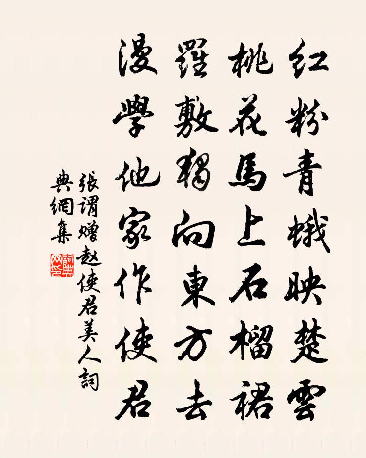 詩詞名句歷史字典書法欣賞書法字典國語詞典說文解字康熙字典古漢語字典標 題 作 者 詩 句 贈趙使君美人作者:張謂 朝代:唐代贈趙使君美人原文紅粉青蛾映楚雲,桃花馬上石榴裙。羅敷獨向東方去,漫學他家作使君。詩詞問答問:贈趙使君美人的作者是誰?答:張謂問:贈趙使君美人寫於哪個朝代?答:唐代問:贈趙使君美人是什麼體裁?答:七絕張謂贈趙使君美人書法欣賞贈趙使君美人書法作品注釋全唐詩:卷197_39詩詞推薦寓言九首其七王安石〔宋代〕鐘鼓非樂本,本末猶相因。仁聲入人深,孟子言之醇。如何貞觀君,從古同隋陳。風俗不粹美,惜哉世無臣。南溪暮春戴蒙〔宋代〕家住南溪欲盡頭,茂林修竹几清幽。菰蒲漲綠蛙專夜,樹棄吹寒麥半秋。修禊從教非節物,舞雩元自有風流。明朝山中夏日孟貫〔唐代〕深山宜避暑,門戶映嵐光。夏木蔭溪路,晝雲埋石床。心源澄道靜,衣葛蘸泉涼。算得紅塵里,誰知此興長。送蘇伯昌大卿樓鑰〔宋代〕甬東曾幸拜蘇天,外府官僚復備員。前輩風流真在眼,名公談笑辱忘年。浙江相對一卮酒,婺港欲行雙槳船。門鍵寄郢州崔守八首陳造〔宋代〕將軍競病舊能詩,黃絹於今玩色絲。何日酒兵鏖筆陣,未應羽檄諗交綏。頌古十九首釋慧暉〔宋代〕不是風旙不是心,衲僧徒自強錐針。岩房雨過昏煙靜,臥聽涼風生竹林。西江月(陳倅·席上)謝逸〔宋代〕窄袖淺籠溫玉,修眉淡掃遙岑。行時雲霧繞衣襟。步步蓮生宮錦。菊與秋煙共晚,酒隨人意俱深。尊前有客動琴心已酉秋留鶴江有感陳允平〔宋代〕賓鴻幾過澱山湖,夜夜西風轉轆轤。苜蓿草衰江館靜,枇杷葉老石泉枯。曲終明月閒歌扇,病去寒灰滿藥爐。客夢送林子方直閣秘書將漕閩部三首楊萬里〔宋代〕梅花國里荔枝村,頗記張燈作上元。一別頻蒙訪生死,七年再見劣寒溫。屬當閔雨祈群望,不得臨風共一尊。誰為浣溪沙(至日帶湖)韓淲〔宋代〕愛日回春一線長。氛氳誰憶御爐香。孤城歲晚臥滄江。花底千官迎淑氣,湖陰十里寫晴光。剩拼華發醉為鄉。無調名 誓丹陽王哲〔元代〕子孫入道,七祖出離地獄。子孫得道,九祖生天。如退道,累祖先。陂麥王安石〔宋代〕陂麥連雲慘澹黃,綠 * 巷不多涼。更無一片桃花在,借問春歸有底忙。金竹峰金君卿〔宋代〕重重岩崿插晴空,雲際叢開菡萏峰。疑是葛仙歸洞府,移將江上九芙蓉。寓興用稼軒韻同蘧庵先生作二首陳維崧〔清代〕曾倚瑤台喝月行,嗔他鸞鶴不相迎。當時酒態公然好,今日詩狂太瘦生。千百輩,盡容卿,問誰堪與耦而耕。灌夫白菊張蠙〔唐代〕秋天木葉乾,猶有白花殘。舉世稀栽得,豪家卻畫看。片苔相應綠,諸卉獨宜寒。幾度攜佳客,登高欲折難。和趙吉州三首劉克莊〔宋代〕學者當窮理,工詩豈美名。不能裨採訪,徒自取譏評。責已希韋孟,休官慕尚平。如今成病鶴,垂首噤無聲。金縷曲 送茅山道人,並寄山中諸道友張之翰〔元代〕回首茅山路。渺滔滔、長江南畔,碧山無數。曾被天風吹醉夢,直到華陽深處。也親見、鸞驂鶴馭。覺後分明空記官松陳宓〔宋代〕團團翠蓋中圓規,風雨精神壯兩儀。一日不戕凌雪操,千年留得入雲枝。長垂道路清涼蔭,更有神仙灑落姿。南國廢宅釋文珦〔宋代〕昔年夸富貴,磨滅等流塵。應是重歸燕,難尋舊主人。徑莎空泣露,門柳不成春。唯有同遊客,經過感慨頻。獨腳令/憶王孫莫將〔宋代〕絳唇初點粉紅新。鳳鏡臨妝已逼真。苒苒釵頭香趁人。惜芳晨。玉骨冰姿別是春。名句推薦群芳過後西湖好,狼籍殘紅。歐陽修《採桑子·群芳過後西湖好》 美人金梯出,素手自提筐。常建《春詞二首》 春悄悄,夜迢迢。碧雲天共楚宮遙。晏幾道《鷓鴣天·小令尊前見玉簫》 北風吹白雲,萬里渡河汾。蘇頲《汾上驚秋》 惜衣有衣,惜食有食。馮夢龍《警世通言·卷三》 輕解羅裳,獨上蘭舟。李清照《一剪梅·紅藕香殘玉簟秋》 痴心做處人人愛,冷眼觀時個個嫌。馮夢龍《喻世明言·卷三》 愁顏與衰鬢,明日又逢春。戴叔倫《除夜宿石頭驛》 小雨纖纖風細細,萬家楊柳青煙里。朱服《漁家傲·小雨纖纖風細細》 似此星辰非昨夜,為誰風露立中宵。黃景仁《綺懷》