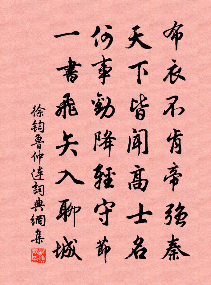 詩詞名句歷史字典書法欣賞書法字典國語詞典說文解字康熙字典古漢語字典標 題 作 者 詩 句 魯仲連作者:徐鈞 朝代:宋代魯仲連原文布衣不肯帝強秦,天下皆聞高士名。何事勸降輕守節,一書飛矢入聊城。詩詞問答問:魯仲連的作者是誰?答:徐鈞問:魯仲連寫於哪個朝代?答:宋代徐鈞魯仲連書法欣賞魯仲連書法作品詩詞推薦祝英台近(題陸壺天水墨蘭石)張炎〔宋代〕帶飄飄,衣楚楚。空谷飲甘露。一轉花風,蕭艾遂如許。細看息影雲根,淡然詩思,曾□被、生香輕誤。此中趣。登平望橋下作顏真卿〔唐代〕登橋試長望,望極與天平。際海蒹葭色,終朝鳧雁聲。近山猶仿佛,遠水忽微明。更覽諸公作,知高題柱名。次韻王解元陳造〔宋代〕觀名計利心,惴惴日交戰。洪濤探龍睡,赤手投虎圈。孰知青雲士,眼靜不及眩。中年琴書趣,早歲林壑原。我無楊梅徐似道〔宋代〕火齊無光荔實圓,未覺先說齒流涎。喚回天竺三年夢,參透披雲一味禪。題金陵雜興詩後蘇濱〔宋代〕六朝留寄多多恨,一士來歌百百詩。驅使春風游筆下,箇中情景箇中知。次韻謝王粟秀才四首項安世〔宋代〕春來無酒債,客至得詩材。論文舌本壯,誦句須髯開。鮮芳曜楛朽,駿步驚駑駘。巍巍王謝家,袞袞世有才。鷓鴣天(餞劉恭父)張孝祥〔宋代〕浴殿西頭白玉堂。湘江東畔碧油幢。北辰躔次瞻星象,南國山川解印章。隨步武,謝恩光。送公歸趣舍人裝。它年偈頌六十五首釋普濟〔宋代〕大包虛空,細入無間。突出當陽,如何覆踐。賦樓提乾古檜因贈其之官陳著〔宋代〕我行晝錦坊,老檜欺眼碧。樛枝巧相扶,眾星拱月璧。人力固有待,面勢本天則。愛益雨露深,風霜莫能賊。維黃次韻子瞻麻田青峰寺下院翠麓亭蘇轍〔宋代〕走馬紅塵合,開懷野寺存。南山抱村轉,渭水帶沙渾。亭峻朱欄繞,堂虛白佛尊。煩襟喜修竹,倦馬樂芳蓀。白(四十宋伯仁〔宋代〕役役人間世,齊頭四十年。讀書雖未已,作事亦徒然。宦業蕉中鹿,生涯葉底蟬。願逢時務好,一榻醉時眠。滿江紅(送施德初)毛並〔宋代〕東馬嚴徐,名籍甚、西京人物。誰不羨、伏蒲忠鯁,演綸詞筆。雅意中朝今小試,二年東郡弦風跡。數中興、循吏偈頌八十五首釋妙倫〔宋代〕內不放出,外不放入。眨得昨來,鐵壁鐵壁。建炎感事張元乾〔宋代〕乾坤忽震盪,土宇遂分裂。殺氣西北來,遺毒成僭竊。議和其禍胎,割地亦覆轍。儻從種將軍,用武寨再劫。不放書驛壁二首姚嗣宗〔宋代〕百越干戈未息肩,九原金鼓又轟天。崆峒山叟笑不語,靜聽松風春晝眠。和襲美春夕酒醒陸龜蒙〔唐代〕幾年無事傍江湖,醉倒黃公舊酒壚。覺後不知明月上,滿身花影倩人扶。菩薩蠻(回文)張孝祥〔宋代〕落霞殘照橫西閣。閣西橫照殘霞落。波淺戲魚多。多魚戲淺波。手攜行客酒。酒客行攜手。腸斷九歌長。長歌九斷夢回趙汝鐩〔宋代〕春意已深寒未了,夢回斗帳房櫳悄。五更五點殘月銷,山鳥一聲先破曉。奉和初春幸太平公主南莊應制趙彥昭〔唐代〕主第岩扃駕鵲橋,天門閶闔降鸞鑣。歷亂旌旗轉雲樹,參差台榭入煙霄。林間花雜平陽舞,谷里鶯和弄玉簫。已陪韓子華內翰見過梅堯臣〔宋代〕但見公軒過,未見我馬去。我懶宜我嫌,公曾不我惡。秋雨天街涼,蕭蕭綠槐樹。遙聽高車聲,騶導門前駐。僕夫名句推薦理直千人必往,心虧寸步難移。馮夢龍《醒世恆言·卷十六》 迢遞嵩高下,歸來且閉關。王維《歸嵩山作》 豈知民力艱,顆米皆琳琅。黃燮清《秋日田家雜詠》 非我族類,其心必異。左丘明《左傳·成公·成公四年》 恩宜自淡而濃,先濃後淡者人忘其惠洪應明《菜根譚·概論》 金玉其外,敗絮其中劉基《賣柑者言》 相思了無益,悔當初相見。朱彝尊《憶少年·飛花時節》 朝騁騖兮江皋,夕弭節兮北渚;屈原《九歌》 雲外好呼南去雁,系書先為報江鄉。齊之鸞《九日登清水營城》 去年燕子天涯,今年燕子誰家?張炎《清平樂·采芳人杳》