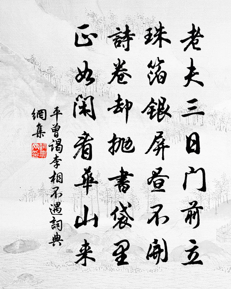 詩詞名句歷史字典書法欣賞書法字典國語詞典說文解字康熙字典古漢語字典標 題 作 者 詩 句 謁李相不遇作者:平曾 朝代:唐代謁李相不遇原文老夫三日門前立,珠箔銀屏晝不開。詩卷卻拋書袋裡,正如閒看華山來。詩詞問答問:謁李相不遇的作者是誰?答:平曾問:謁李相不遇寫於哪個朝代?答:唐代問:謁李相不遇是什麼體裁?答:七絕平曾謁李相不遇書法欣賞謁李相不遇書法作品注釋全唐詩:卷508-42詩詞推薦瑣窗寒(重遊東湖)蘇茂一〔宋代〕雲浦蒼寒,煙堤幕翠,舊痕新漲。春愁十里,冉冉碧絲搖盪。記登臨、少年思豪,唾壺擊玉歌清壯。到如今夢裡,南湖有鷗成群里閭間雲數十年未嘗見也實塵中張鎡〔宋代〕居士園門甚處開,傍城猶未著樓台。門前湖水三千尺,引得沙鷗亦肯來。上茶使趙伯川度正〔宋代〕幾年題筆決文圍,妙手元堪補袞衣。不訐不諛持正大,能經能濟洞幾微。天高且作茶星現,地迥行親海月輝。萬歲哭藝堂湯先生劉黻〔宋代〕天地之性人為貴,四骸仁義一隻具。先生領之皇降初,繇稚及耆全故步。深居獨觀昭曠原,學不師傳能自悟。真貧湖西雜感詩釋智圓〔宋代〕蘭在深林亦自馨,豈因風雨阻雞鳴。由來君子須謀道,不為時人有重輕。浣溪沙·夢繞桃源寂寞回元好問〔金代〕夢繞桃源寂寞回。春殘滋味似秋情。多情翻恨酒為媒。數點雨聲風約住,一簾花影月移來。小闌幽徑獨徘徊。雹鄧肅〔宋代〕黑雲壓山山欲頹,阿香推車震不開。廣寒宮中珠徑雨,狂風傾下九天來。高堂砰轟倒四壁,萬瓦飛空如轉石。燈火減字木蘭花 右九日九陽而還元 以上會真集王吉昌〔元代〕返還成數。八卦爻抽同體聚。藥祖完全。運就三三九九天。歸根復命。鼎冷丹凝常藥淨。赫金光。透體明連滿室二十四詩品司空圖〔唐代〕俯拾即是,不取諸鄰,與道俱往,著手成春。如逢花開,如瞻歲新,真與不奪,強得易貧。幽人空山,過雨采苹,句釋曉瑩〔宋代〕即看青女夜飛霜。奉贈王中允維杜甫〔唐代〕中允聲名久,如今契闊深。共傳收庾信,不比得陳琳。一病緣明主,三年獨此心。窮愁應有作,試誦白頭吟。黃州呈趙使君孫應時〔宋代〕魯狂不媚世,世亦與我違。平生懷識察,如公良獨稀。塵沙二十年,孤舟萬里歸。見公不忍去,安得長相依。春詞毛滂〔宋代〕冰銷玉液鳧鷖喜,日暖宜春草木長。忠厚家風傳八葉,太平光景接三王。嘉魚池寧某〔宋代〕四百峰巒隱畫屏,翠光樓閣起山溟。高侔太岳千山小,勢鎮乾坤萬古青。石洞猿啼煙月落,嘉池龍起水雲腥。臨流湖州歌九十八首 其十二汪元量〔宋代〕受降城下草離離,寒食清明只自悲。漢寢秦陵何處在,鶯花無主雨如絲。獨行趙蕃〔宋代〕登山臨水送將歸,攬涕無從日向微。水遠山高動千里,春風浩浩客吹衣。設醮太平宮竣事呈偕行諸君二首岳珂〔宋代〕星壇仙簴韻瓊瑤,仿佛神{游去氵}下九霄。龍駕清都三境接,蜺旌絳節百靈朝。霜澄夜氣俱明徹,雲澹秋容想泬次兩知縣韻四首陳造〔宋代〕政成無復敗群羊,萬軸書前一縷香。明日過君況休務,茶邊清話不妨長。句張釜〔宋代〕平生憂患諳償遍。春暮思平泉雜詠二十首。自敘(非尚子遍游五嶽)李德裕〔唐代〕五嶽徑雖深,遍游心已盪。苟能知止足,所遇皆清曠。七十難可期,一丘乃微尚。遙懷少室山,常恐非吾望。名句推薦枯木逢春猶再發,人無兩度再少年。佚名《增廣賢文·上集》 門外平橋連柳堤,歸來晚樹黃鶯啼。溫庭筠《春洲曲》 與君別,相思一夜梅花發房舜卿《有所思》 行到小溪深處,有黃鸝千百。秦觀《好事近·夢中作》 肥水東流無盡期。當初不合種相思。姜夔《鷓鴣天·元夕有所夢》 波面澄霞,蘭艇采香去。高觀國《祝英台近·荷花》 蜀魂飛繞百鳥臣,夜半一聲山竹裂。林景熙《冬青花》 於事事物物上求至善,卻是義外也。王陽明《傳習錄·卷上·徐愛錄》 碧玉妝成一樹高,萬條垂下綠絲絛。賀知章《詠柳 / 柳枝詞》 草草興亡休問,功名淚、欲盈掬。黃機《霜天曉角·儀真江上夜泊》