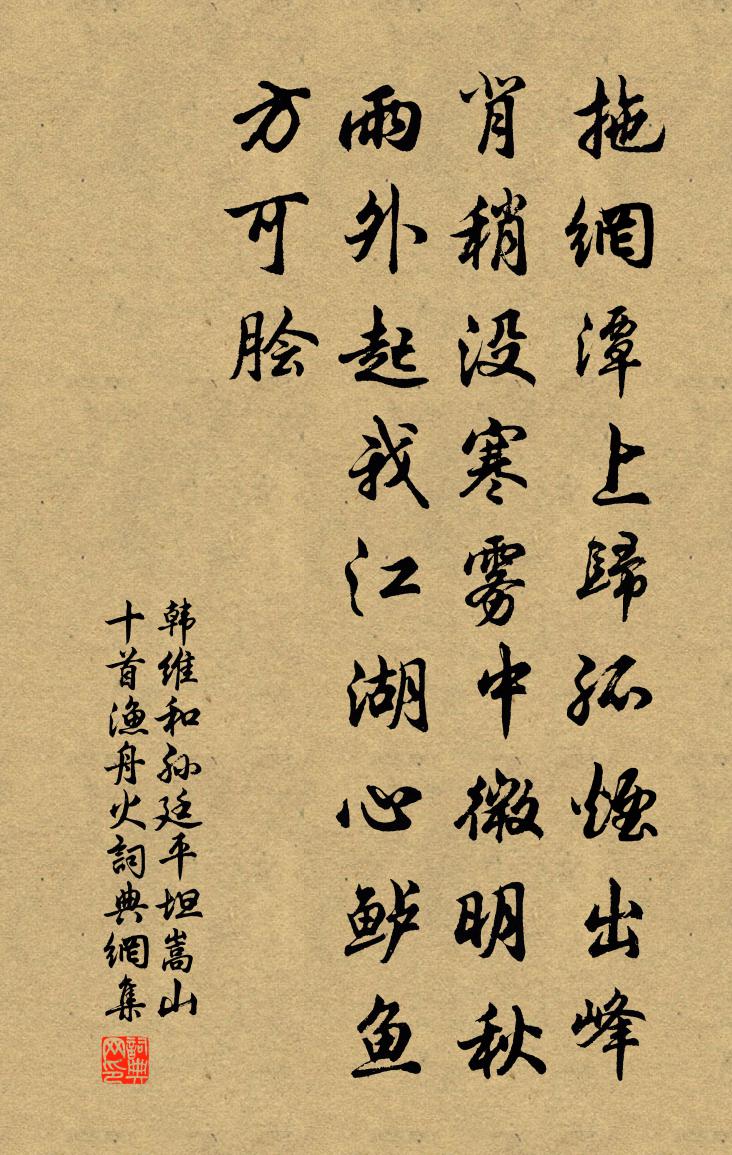 詩詞名句歷史字典書法欣賞書法字典國語詞典說文解字康熙字典古漢語字典標 題 作 者 詩 句 和孫廷平坦嵩山十首漁舟火作者:韓維 朝代:宋代和孫廷平坦嵩山十首漁舟火原文拖網潭上歸,孤煙出峰背。稍沒寒霧中,微明秋雨外。起我江湖心,鱸魚方可膾。詩詞問答問:和孫廷平坦嵩山十首漁舟火的作者是誰?答:韓維問:和孫廷平坦嵩山十首漁舟火寫於哪個朝代?答:宋代韓維和孫廷平坦嵩山十首漁舟火書法欣賞和孫廷平坦嵩山十首漁舟火書法作品詩詞推薦個人三十韻吳融〔唐代〕裊裊復盈盈,何年墜玉京。見人還道姓,羞客不稱名。故事諳金谷,新居近石城。臉橫秋水溢,眉拂遠山晴。粉薄先少師宣和初有贈晁公以道詩云奴愛才如蕭陸游〔宋代〕仕不逢時勇退耕,閉門自號景迂生。遠聞佳士輒心許,老見異書猶眼明。奴愛才如蕭穎士;婢知詩似鄭康成。早孤四月二十九日早起行園方回〔宋代〕白髮蕭蕭一禿翁,披襟扶杖早涼中。偶因不飲全無寐,自笑能詩例得窮。梅雨園林江橘綠,竹風庭院海榴紅。若非題花光梅十首實相圓常王柏〔宋代〕青青葉底未堪嘗,已作商家鼎鼐香。四月江南煙雨闊,安心且待那時黃。齊安秋日張耒〔宋代〕齊安荒僻郡,平昔處放臣。幸此公酒美,復此高秋晨。百憂雖搶攘,一榼奈芳醇。舉杯三酌後,遙作葛天民。次韻王主簿同考試項安世〔宋代〕文陣樅樅劍戟業,喚回習氣老臧宮。分明天上三題草,消盡人間一世雄。聖處門庭開蕩蕩,春來風景樂融融。何年令狐尚書許過弊居先贈長句白居易〔唐代〕不矜軒冕愛林泉,許到池頭一醉眠。已遣平治行藥逕,兼教掃拂釣魚船。應將筆硯隨詩主,定有笙歌伴酒仙。只候光相寺范成大〔宋代〕峰頂四時如大冬,芳花芳草春自融。苔痕新曦六月雪,木勢舊偃千年風。雲物為人布世界,日輪同我行虛空。浮生減字木蘭花王觀〔宋代〕今晨佳宴。昨夜 * 光現。鶴舞青霽,丹鳳呈祥瑞氣飄。仙書來詔。綠鬢朱顏長不老。滿勸香醪。祝壽如雲轉轉江亭李紳〔唐代〕瘴江昏霧連天合,欲作家書更斷腸。今日病身悲狀候,豈能埋骨向炎荒。病中睡起折杏花數枝二首王安石〔宋代〕獨臥無心起,春風閉寂寥。鳥聲誰喚汝,屋角故相撩。觀物吟邵雍〔宋代〕淳厚之人少秀慧,秀慧之人少審諦。安得淳厚又秀慧,與之共話人間事。乾道癸巳臘後二日,桂林大雪尺余,郡人云前范成大〔宋代〕憶昔北征秋遇雪,穹廬苦寒不堪說。飛花如席暗燕然,把酒悲歌度佳節。胡兒館客類西河,鐍戶不容浮蟻泄。當時蕪菁陸游〔宋代〕往日蕪菁不到吳,如今幽圃手親鉏。憑誰為向曹瞞道,徹底無能合種蔬。在潁昌寄中立游酢〔宋代〕蕭條清潁一茅廬,魂夢長懷與子居。五里橋西楊柳路,至今車馬往來疏。臨終作鄭俠〔宋代〕似此平生只藉天,還如過鳥在雲邊。如今身畔渾無物,贏得虛堂一枕眠。古源釋紹曇〔宋代〕七佛相承壽脈深,只圖入水見長人。截流機有青波路,天下滔滔誰問津。東園張耒〔宋代〕荒園何所有,落葉與衰叢。含芳未肯吐,惟有木芙蓉。 * 如佳人,紛萼包金茸。並隨重陽酒,娛此憔悴翁。次宋省齋七夕雨楊公遠〔宋代〕人言此夕會雙星,騃女痴兒競乞靈。學織學耕非我事,何如牛角自橫經。喜仲晦除江西憲二首劉克莊〔宋代〕厭聞桑孔工掊克,少見龔黃出拊循。官吏但知行白簡,壯丁多去入紅巾。昔陽和少千村瘴,今福星來一路春。聞說名句推薦柴門寂寂黍飯馨,山家煙火春雨晴。貫休《春晚書山家屋壁二首》 城裡夕陽城外雪,相將十里異陰晴。王守仁《次韻陸僉憲元日春晴》 善有善報,惡有惡報。不是不報,時候未到。佚名《增廣賢文·上集》 秋娘渡與泰娘橋,風又飄飄,雨又蕭蕭。蔣捷《一剪梅·舟過吳江》 及茲春未深,數畝猶足佃。王守仁《謫居糧絕請學於農將田南山詠言寄懷》 人生得意須盡歡,莫使金樽空對月。李白《將進酒》 綠蓑江上秋聞笛,紅袖樓頭夜倚欄。曹雪芹《香菱詠月·其三》 譬道之在天下,猶川谷之於江海。老子《老子·道經·第三十二章》 馬者,所以命形也;白者,所以命色也。公孫龍《公孫龍子·白馬論》 人主莫喜強臣,臣下戒懷妄念。來俊臣《羅織經·事上卷第二》